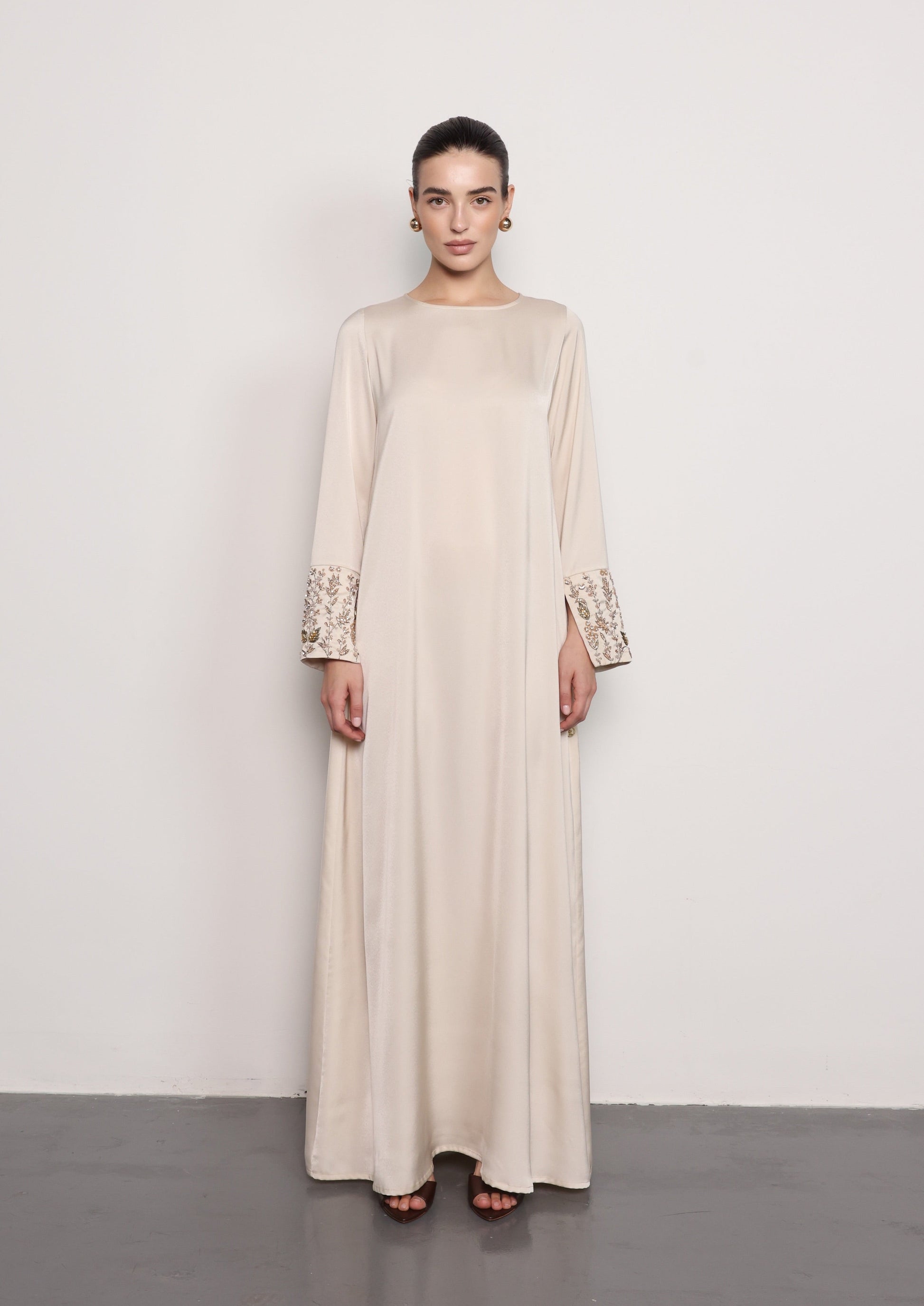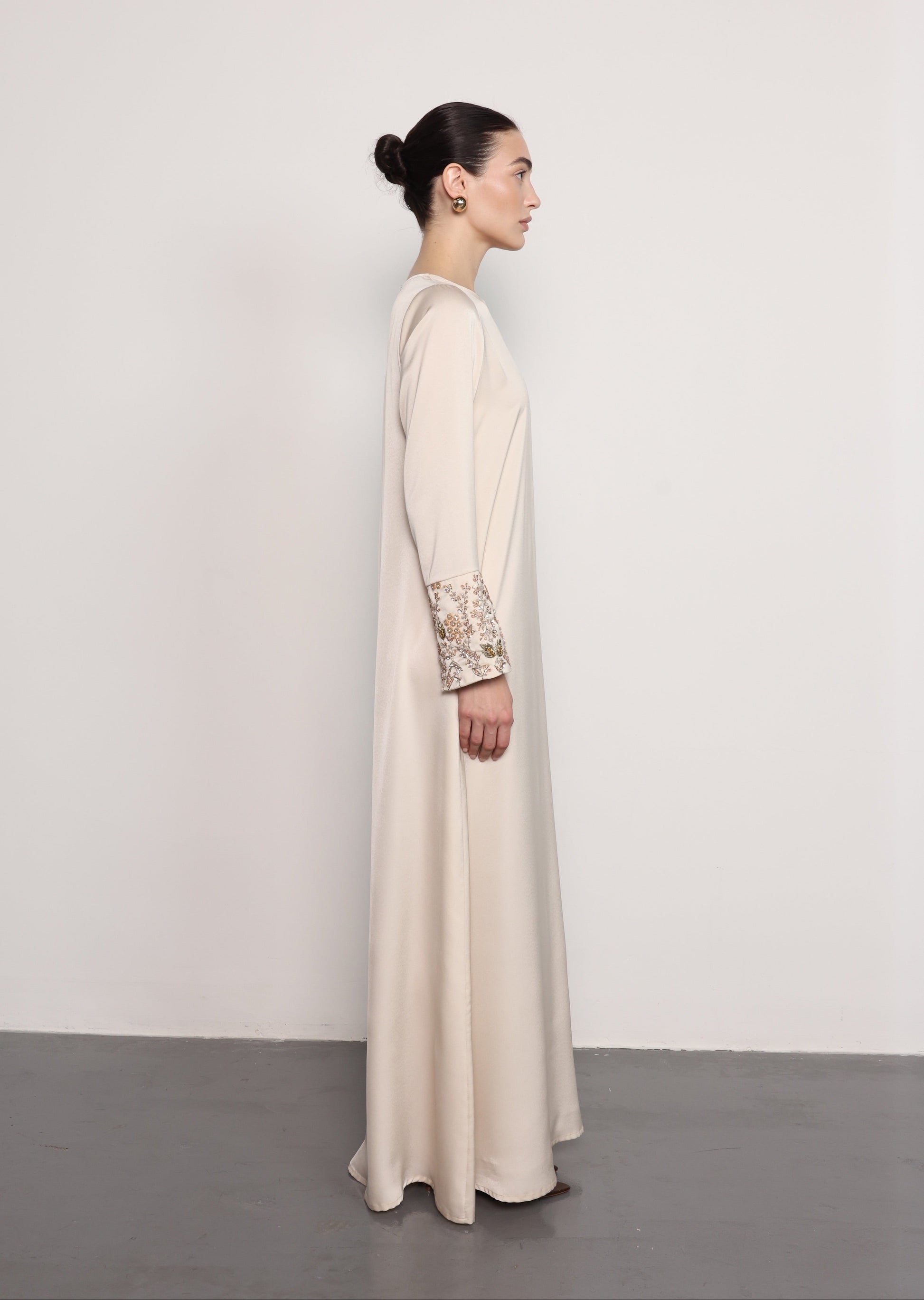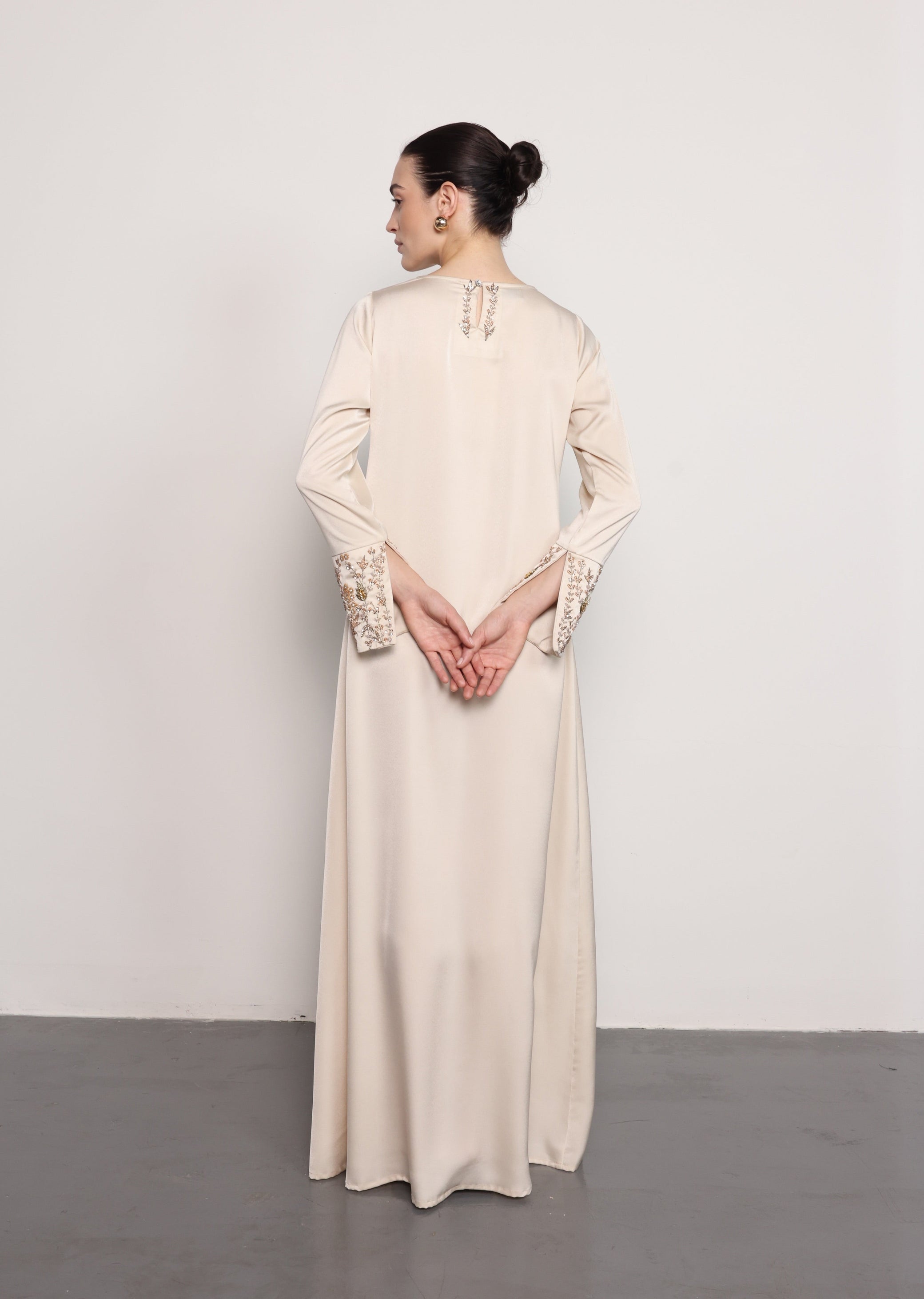 مصنوع من قماش الساتان الناعم، يتميز فستان تشيري بخطوط نظيفة وانسيابية مع تعزيز بطبقة علوية على شكل عباءة متعددة الطبقات. تضيف التطريزات الدقيقة من الخرز على الجزء العلوي الأمامي لمسة زخرفية راقية، مما يخلق مظهراً أنيقاً وبسيطاً.