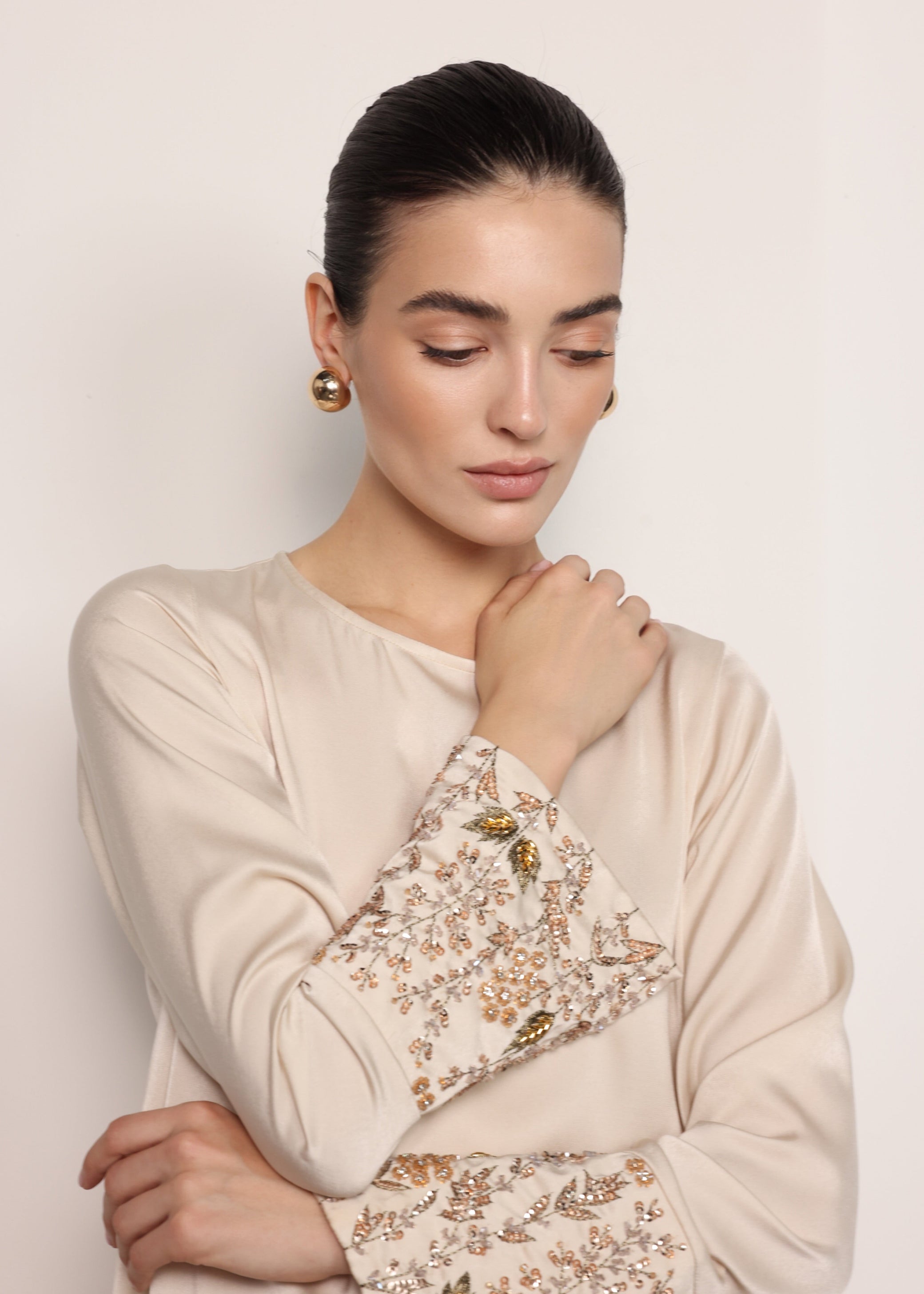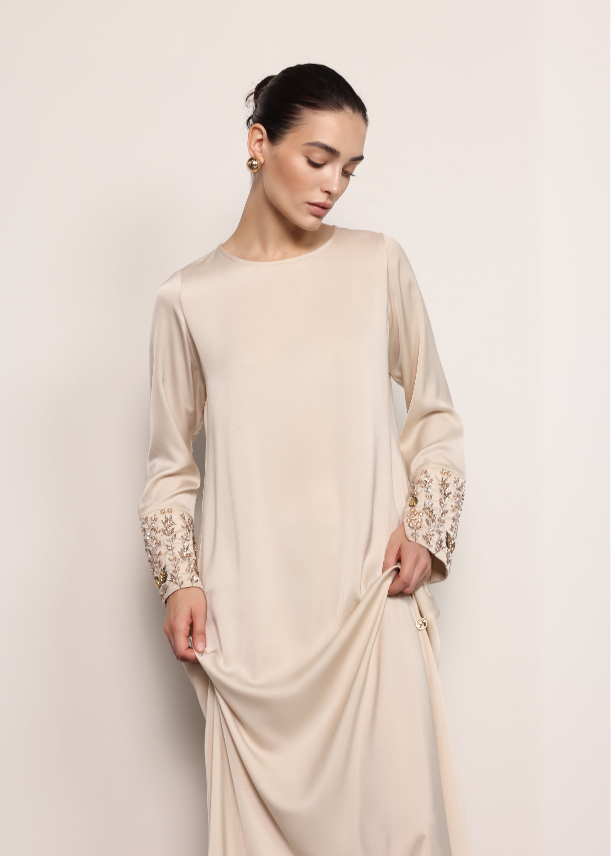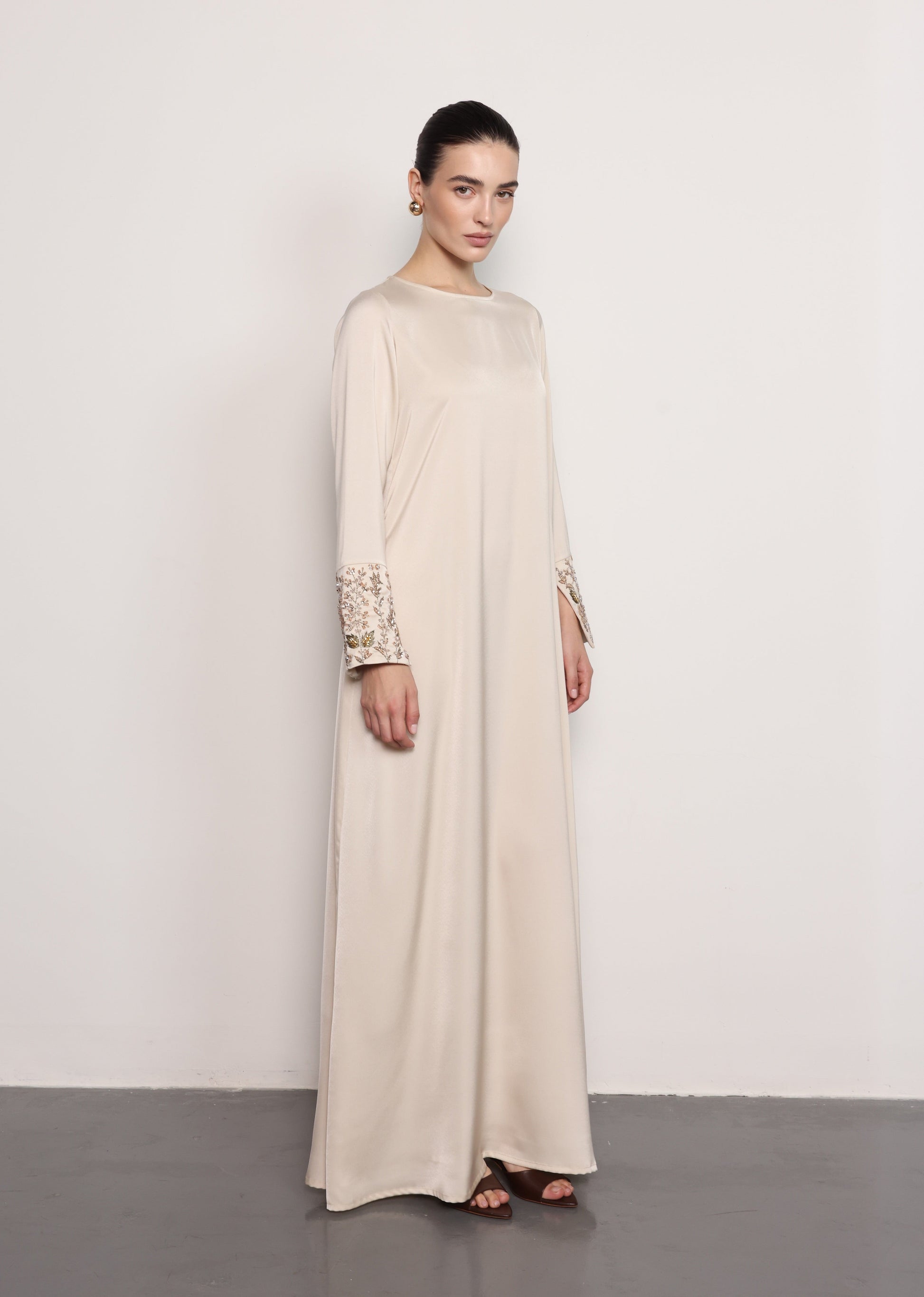 مصنوع من قماش الساتان الناعم، يتميز فستان تشيري بخطوط نظيفة وانسيابية مع تعزيز بطبقة علوية على شكل عباءة متعددة الطبقات. تضيف التطريزات الدقيقة من الخرز على الجزء العلوي الأمامي لمسة زخرفية راقية، مما يخلق مظهراً أنيقاً وبسيطاً.
