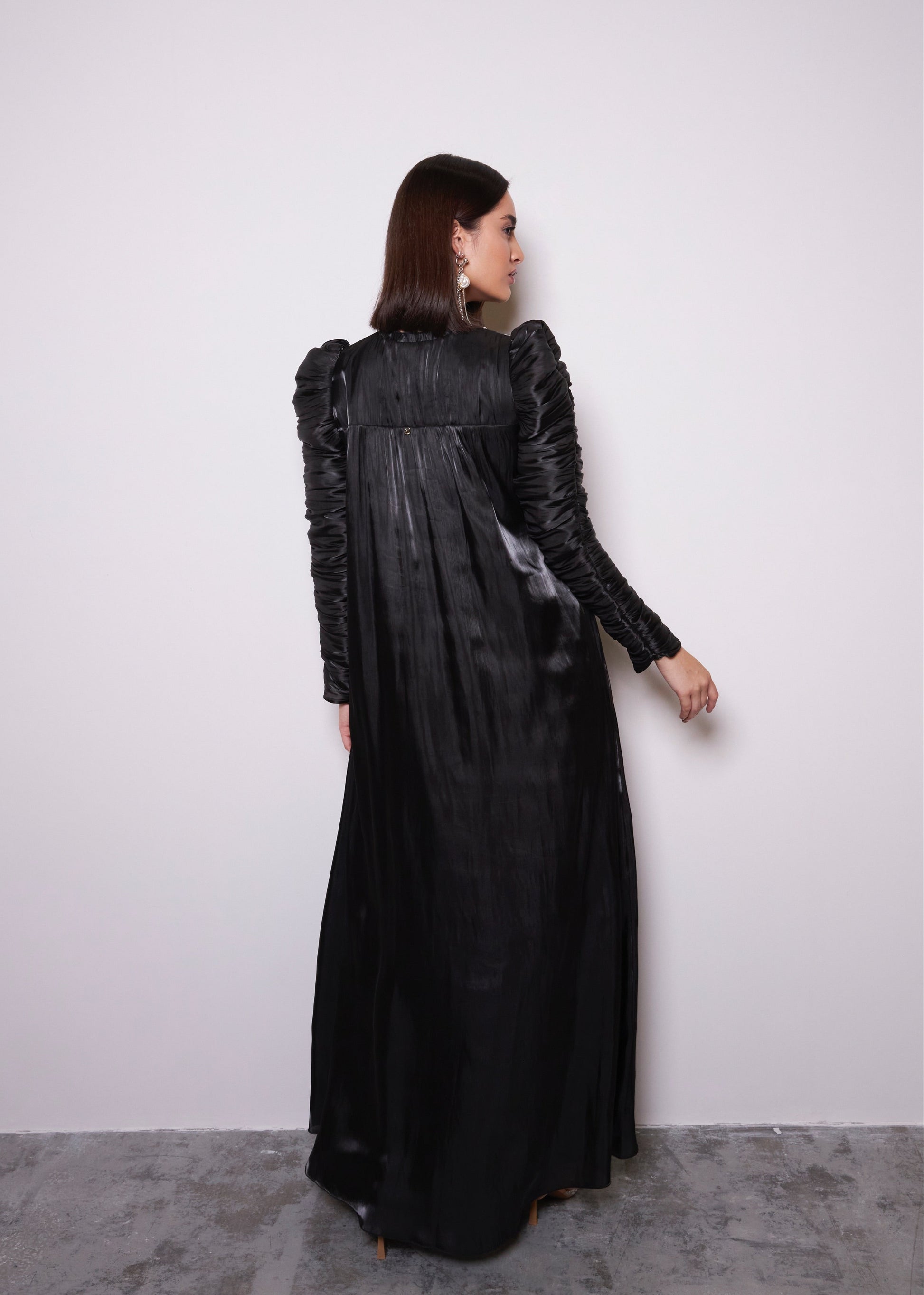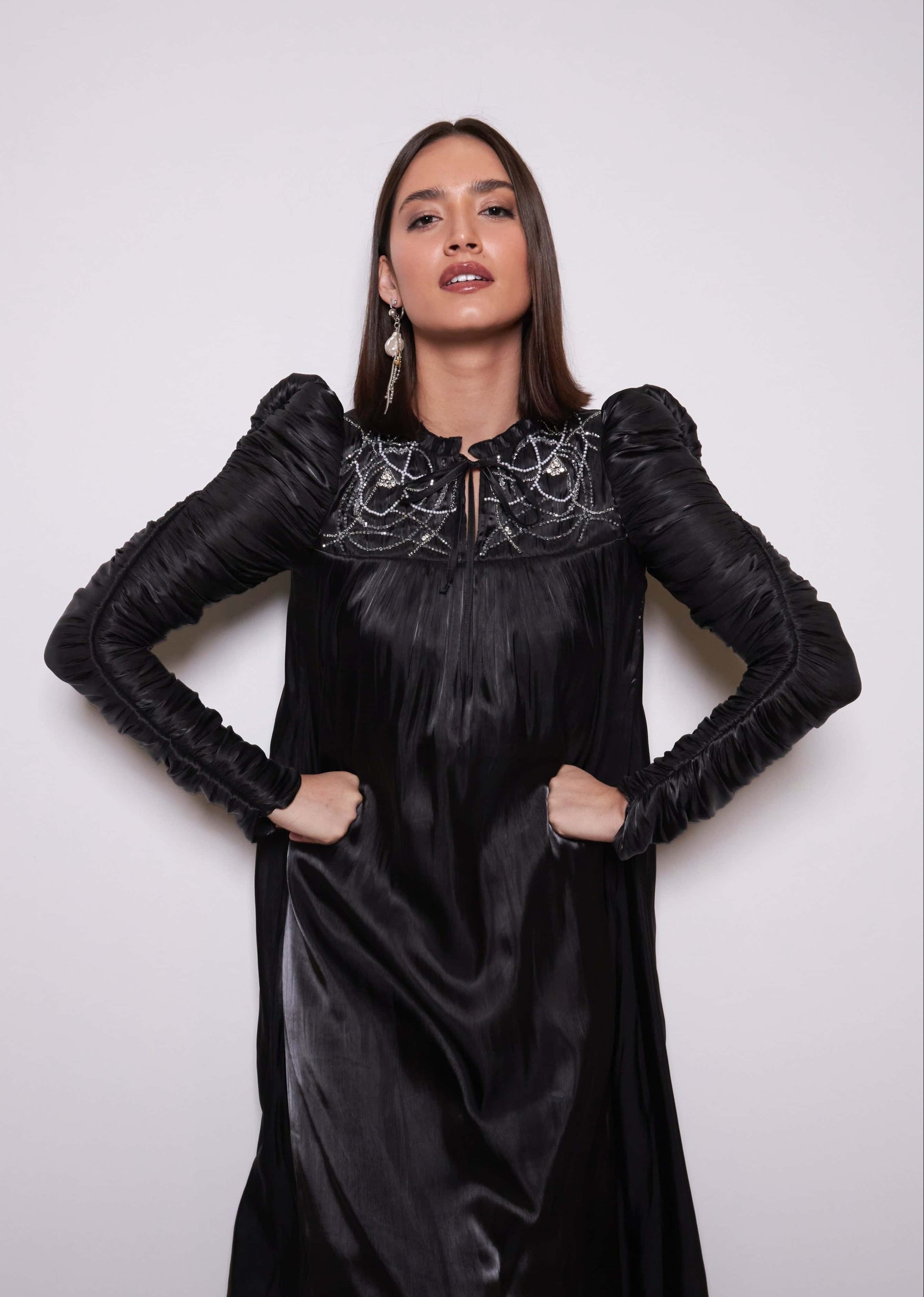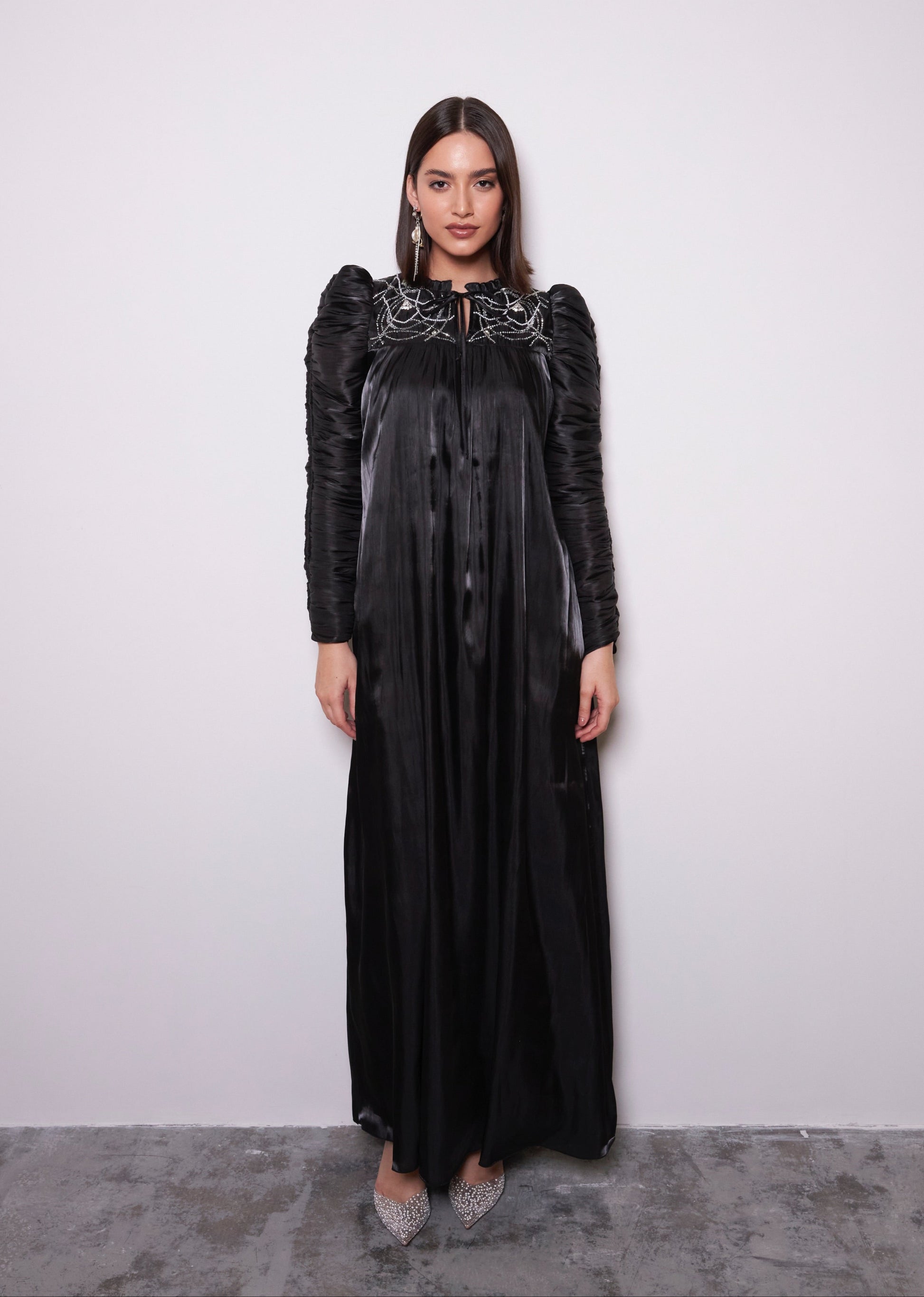 - أبرز التصميم: ياقة مطرزة يدويًا وأكمام منتفخة أنيقة.