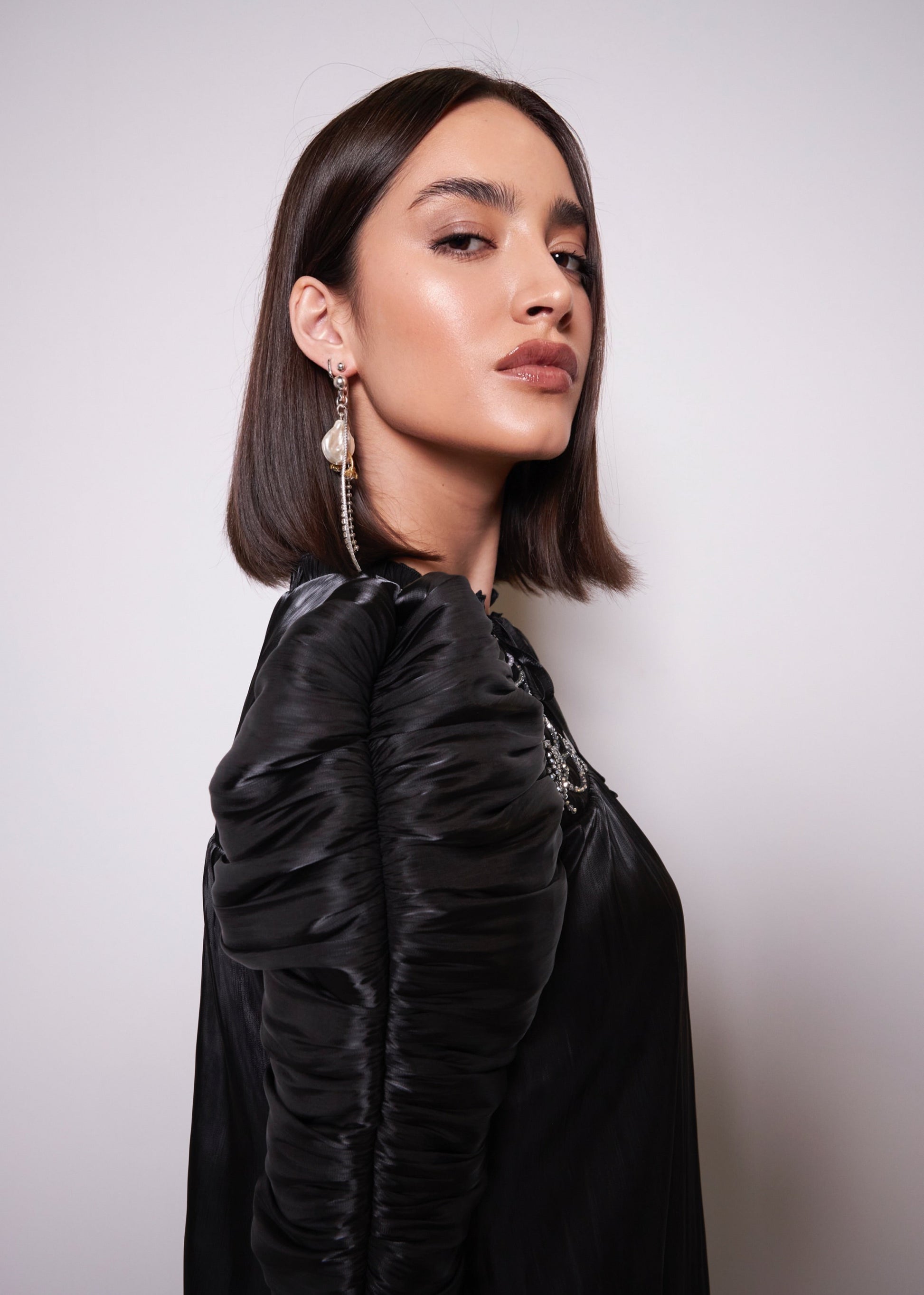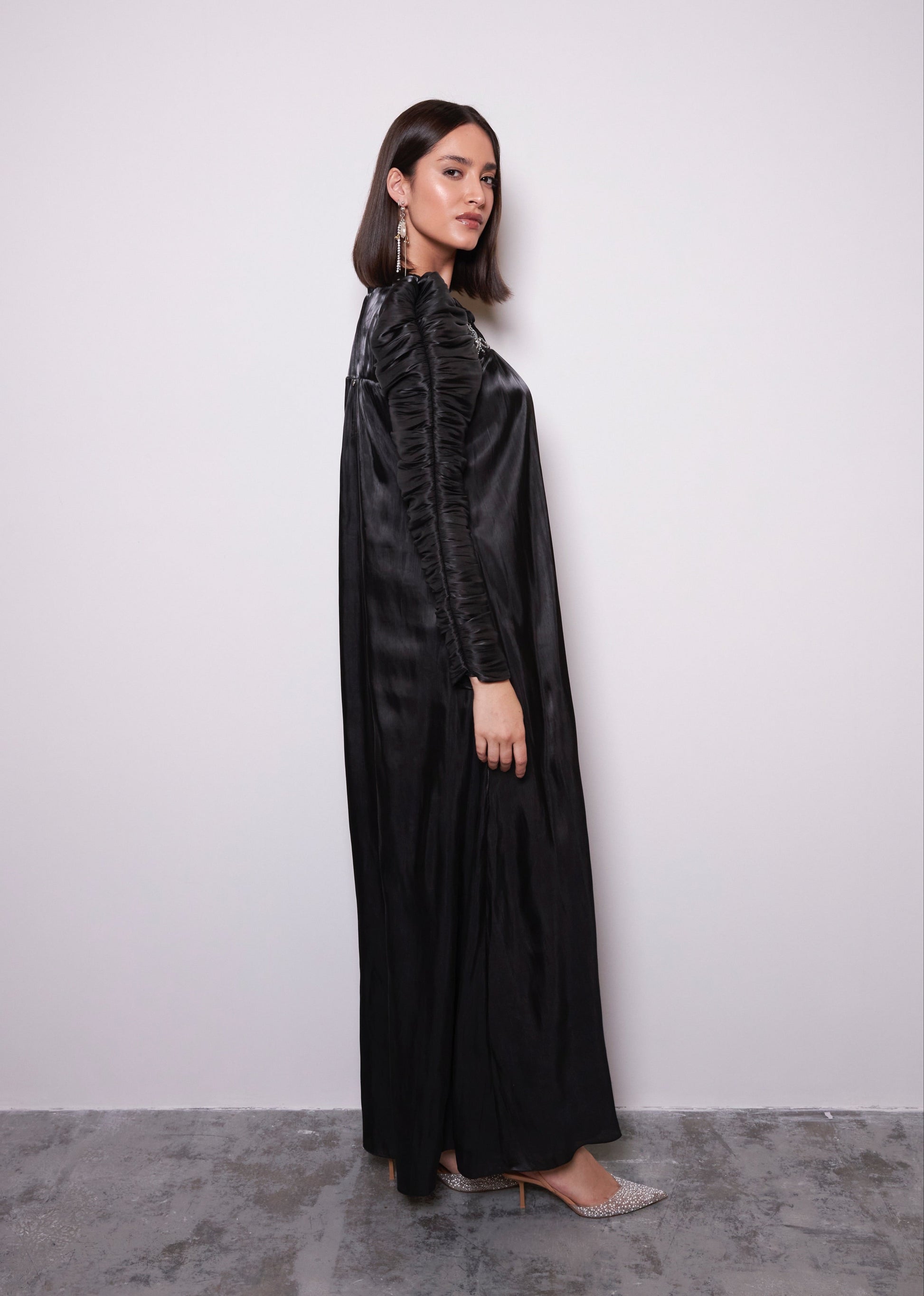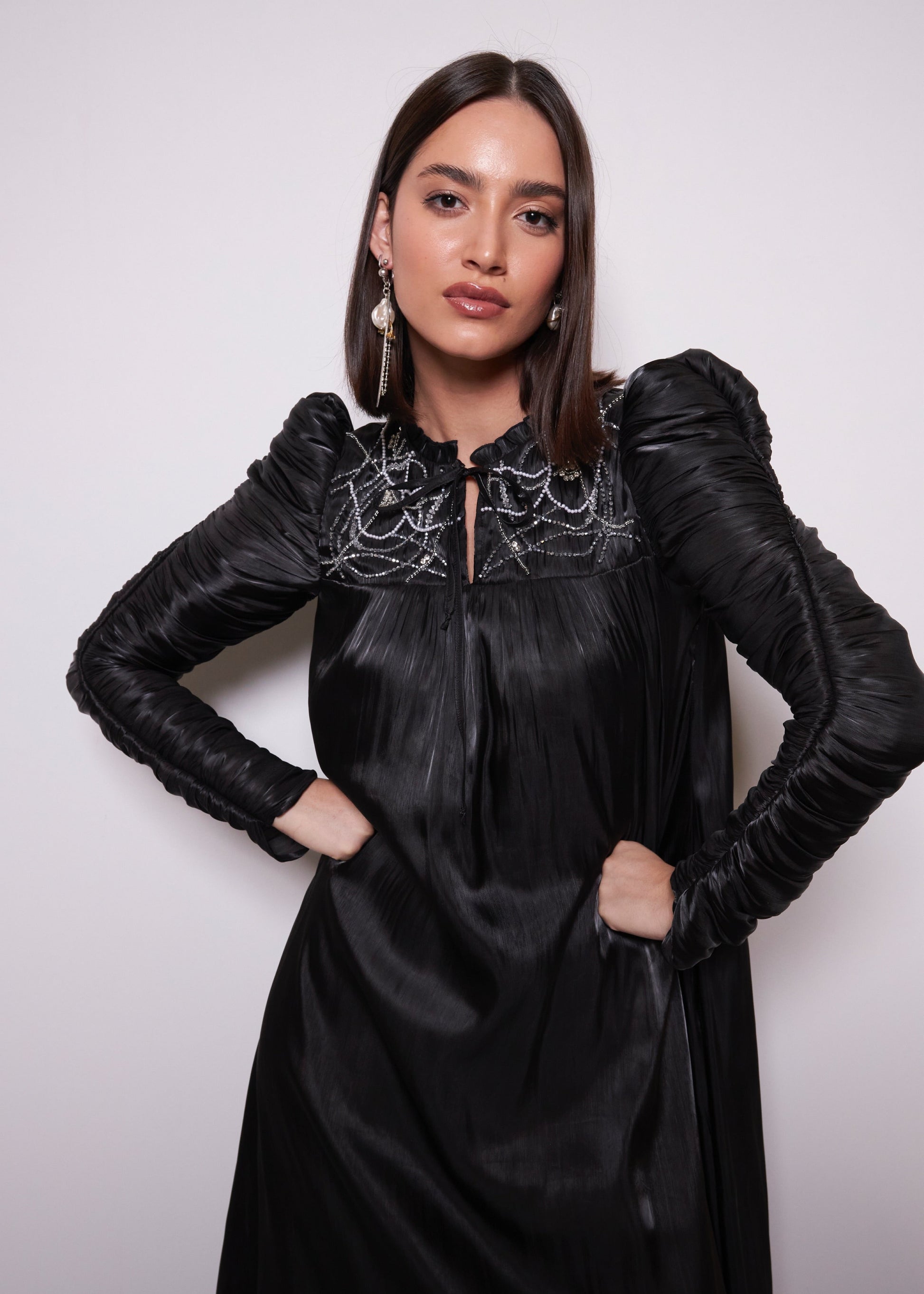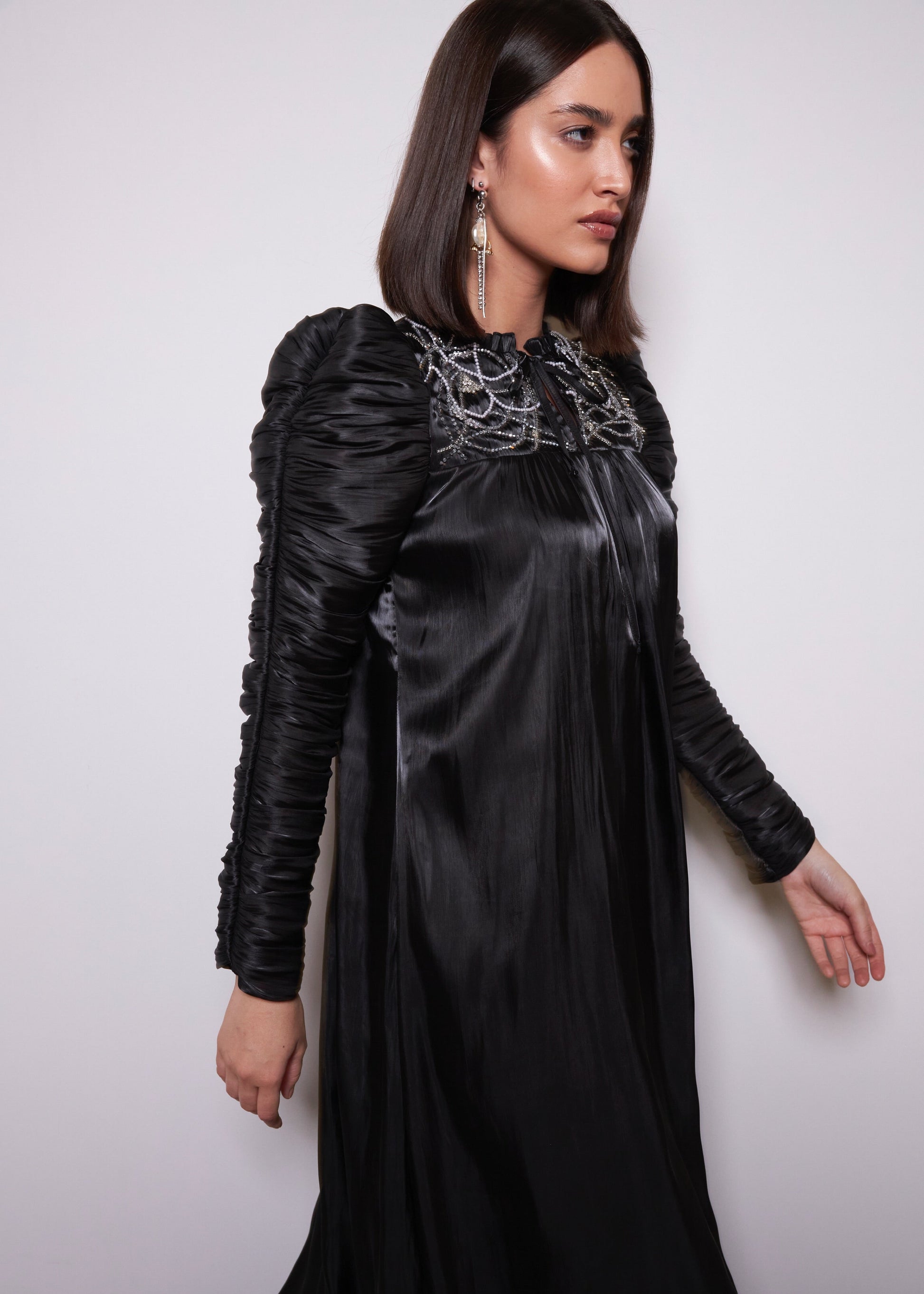 - أبرز التصميم: ياقة مطرزة يدويًا وأكمام منتفخة أنيقة.