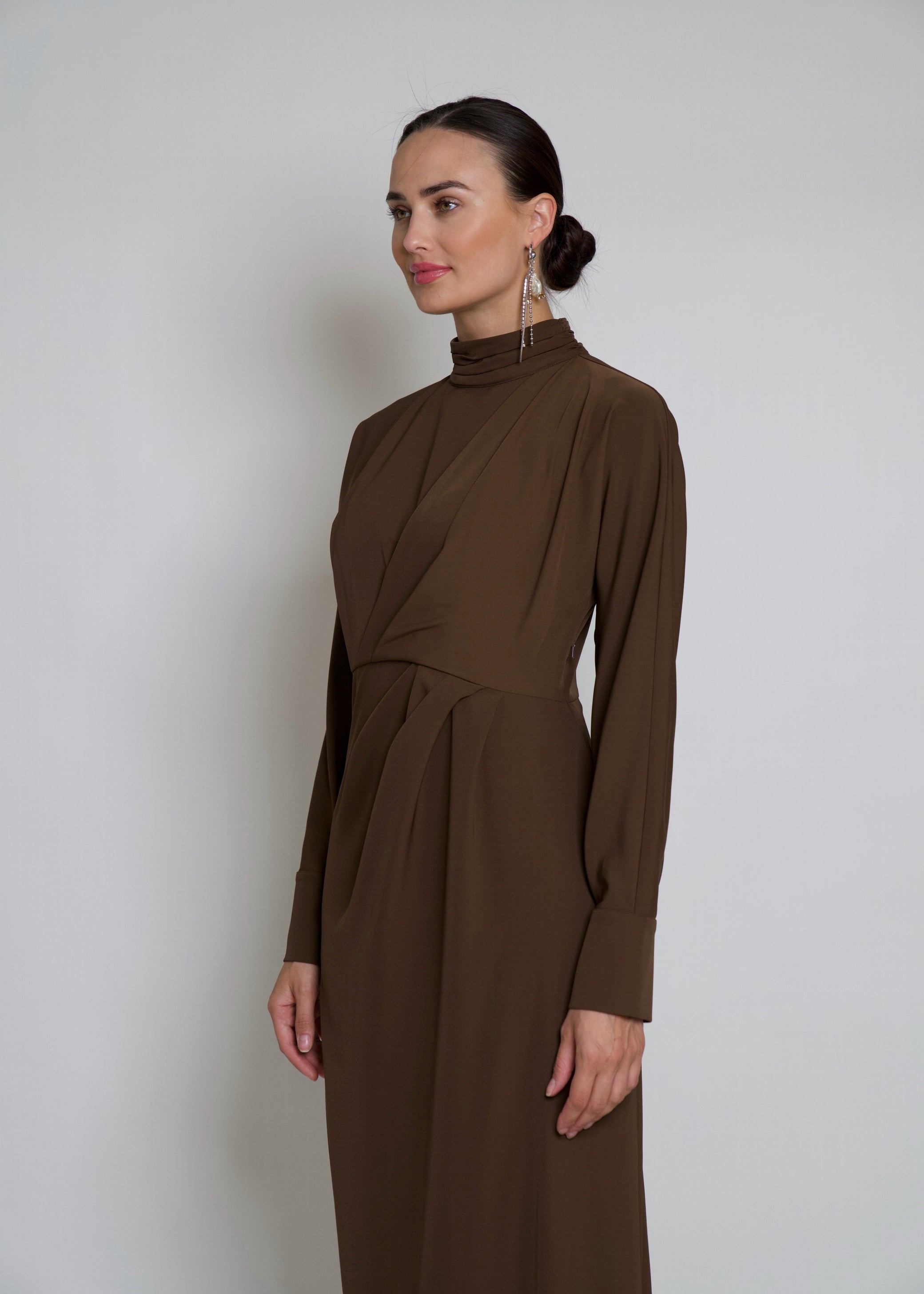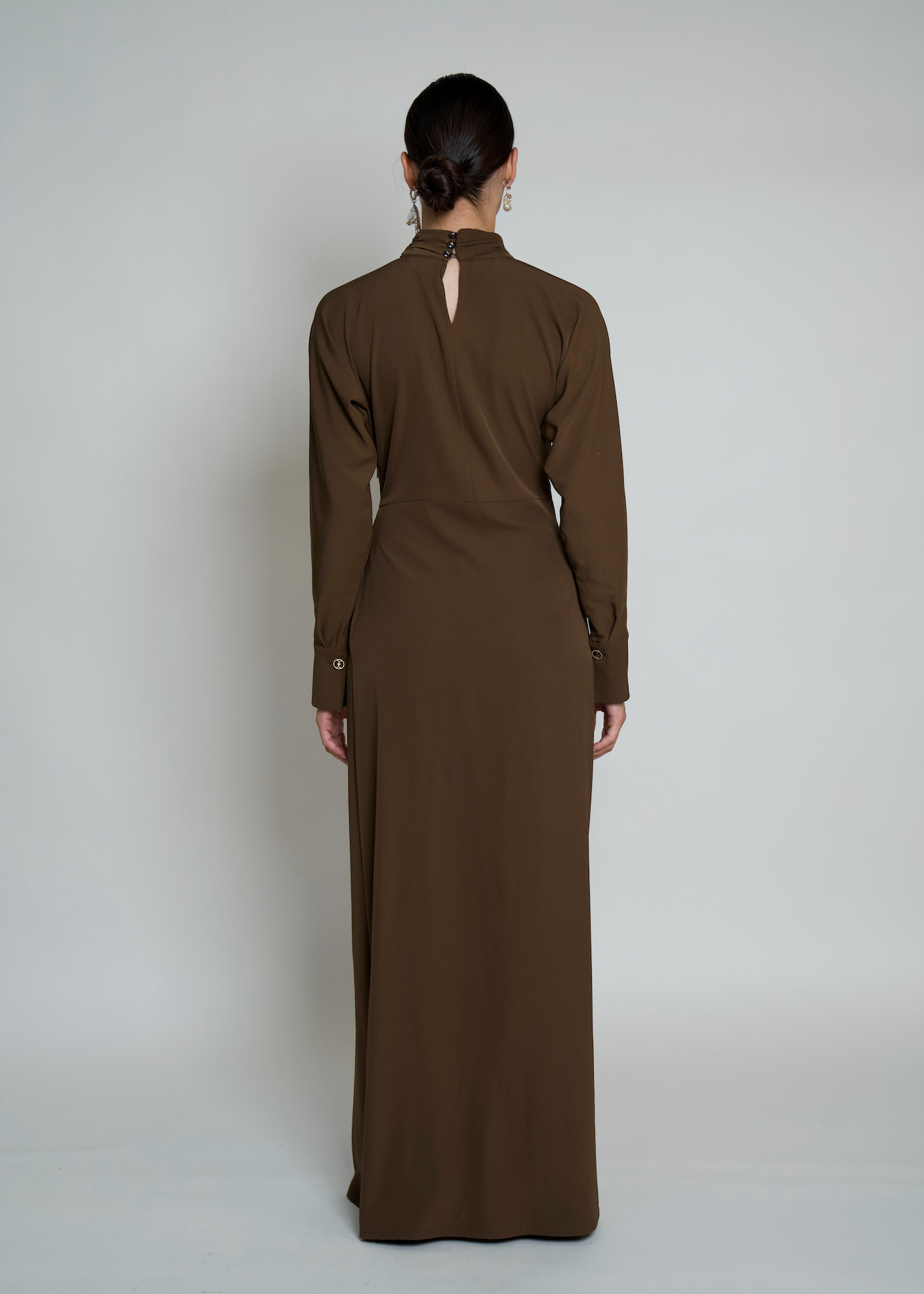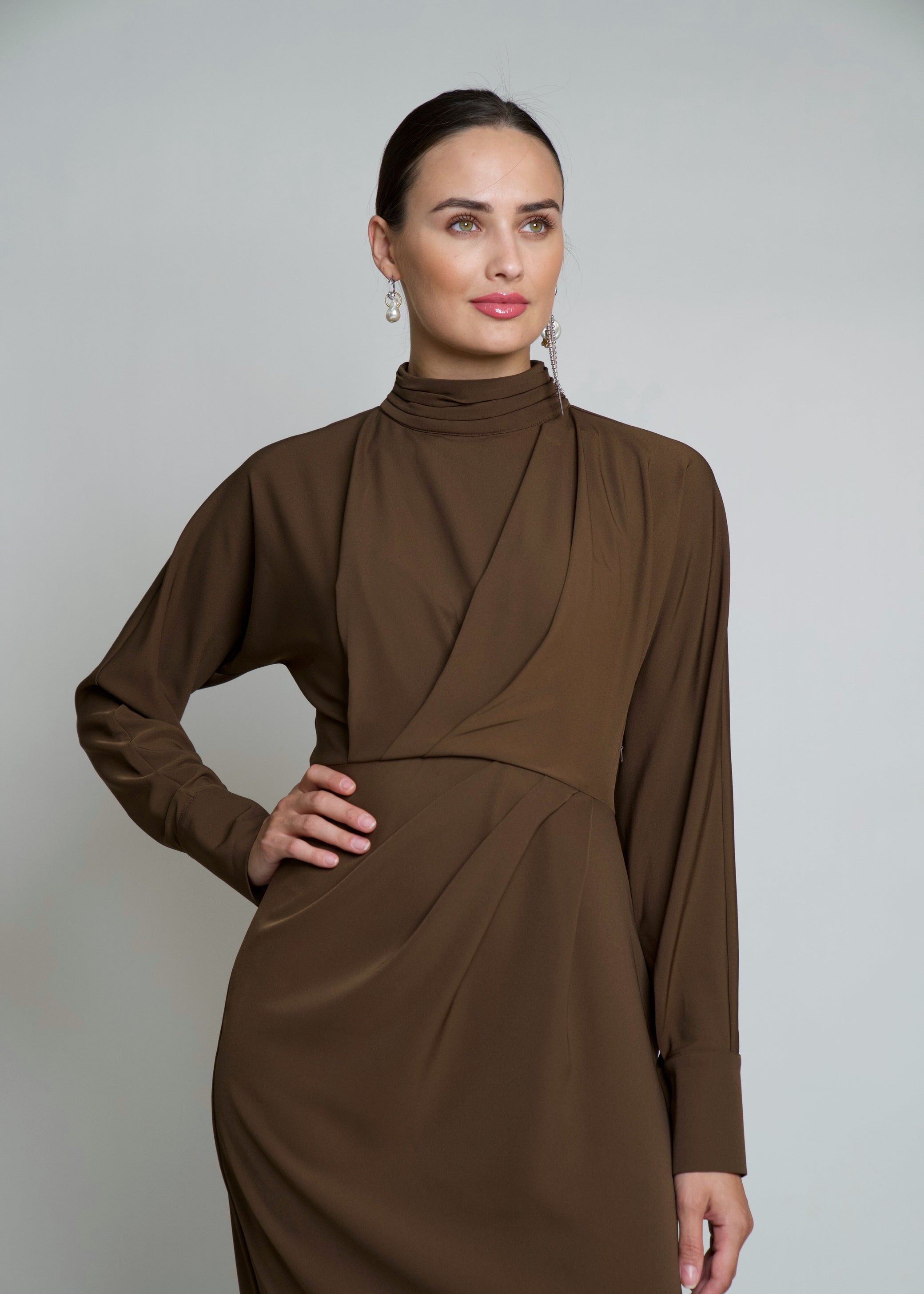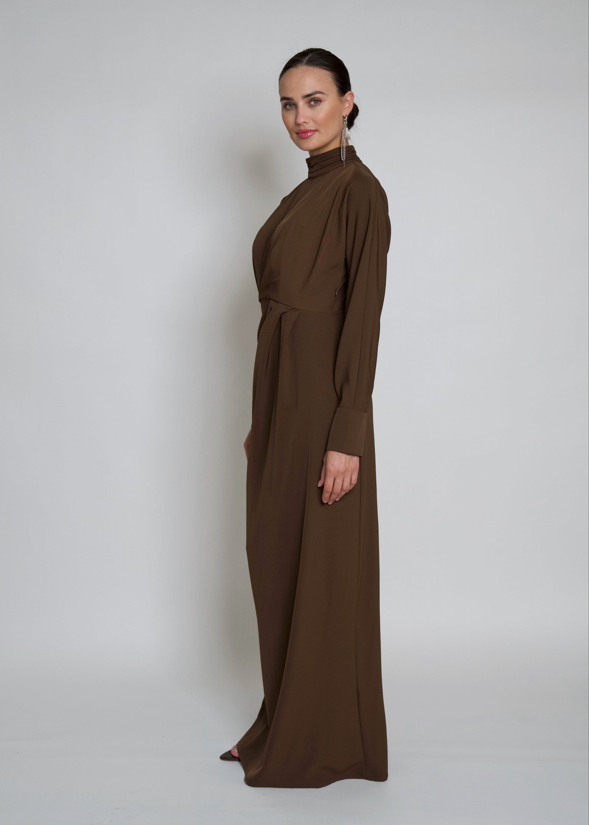Step into understated elegance with our Brown Minimalist Maxi Dress. This piece is designed for effortless chic, featuring a sophisticated high, draped neckline and a beautifully wrapped waist that creates a flattering silhouette.