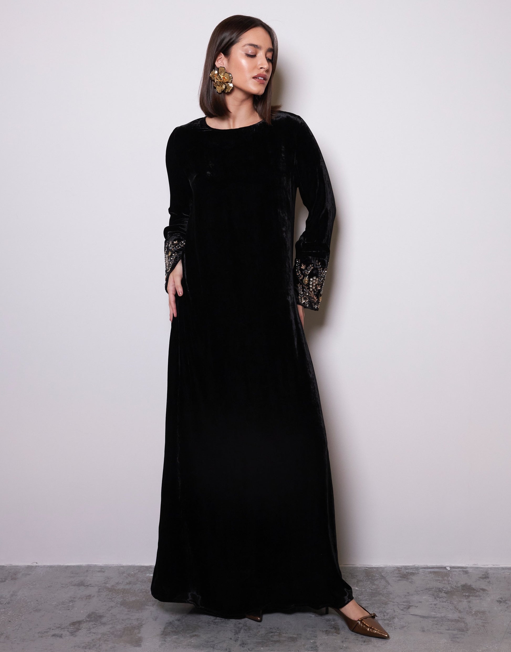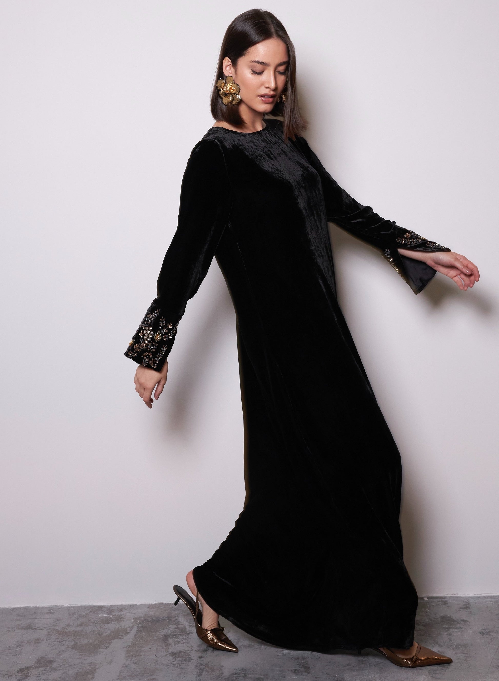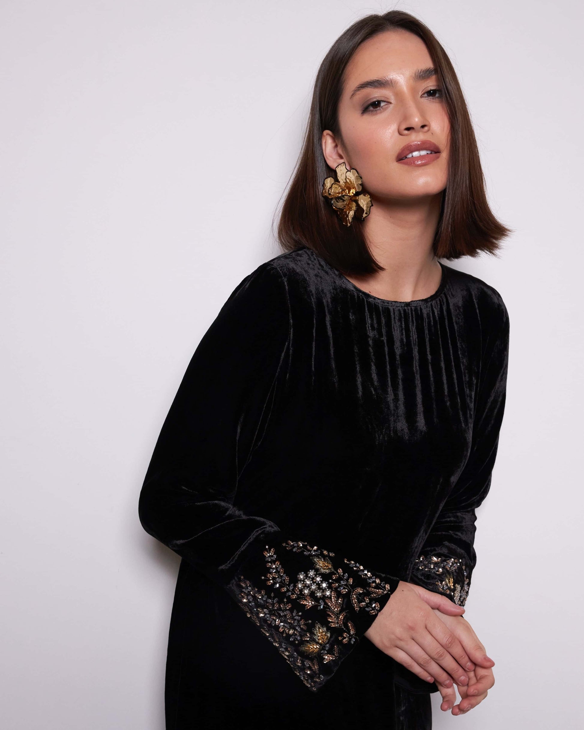 The Allure Dress in black is a timeless, elegant piece that radiates sophistication. With intricate gold and black floral embroidery on the sleeves, it’s designed to capture attention while offering a refined, luxurious silhouette.
