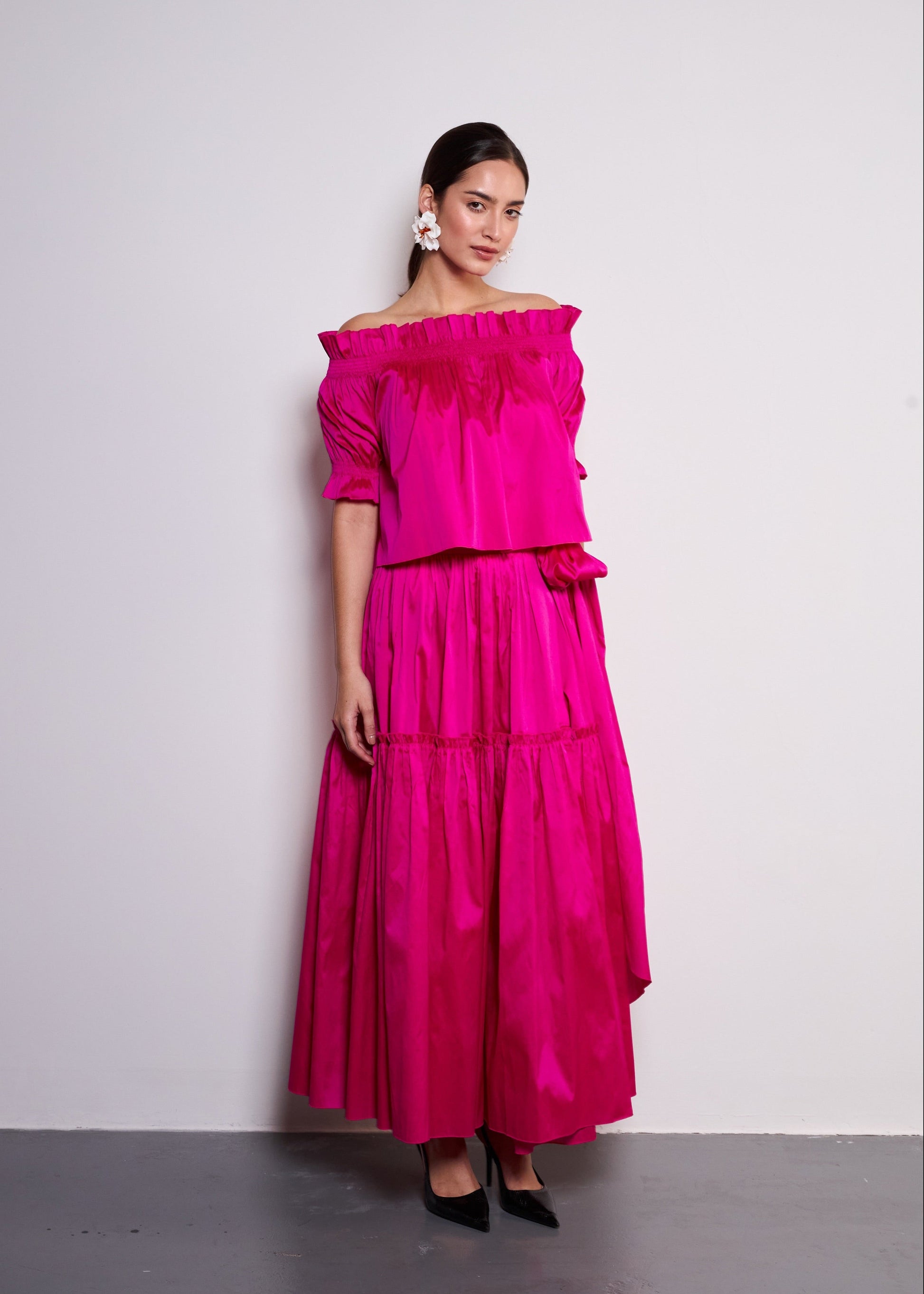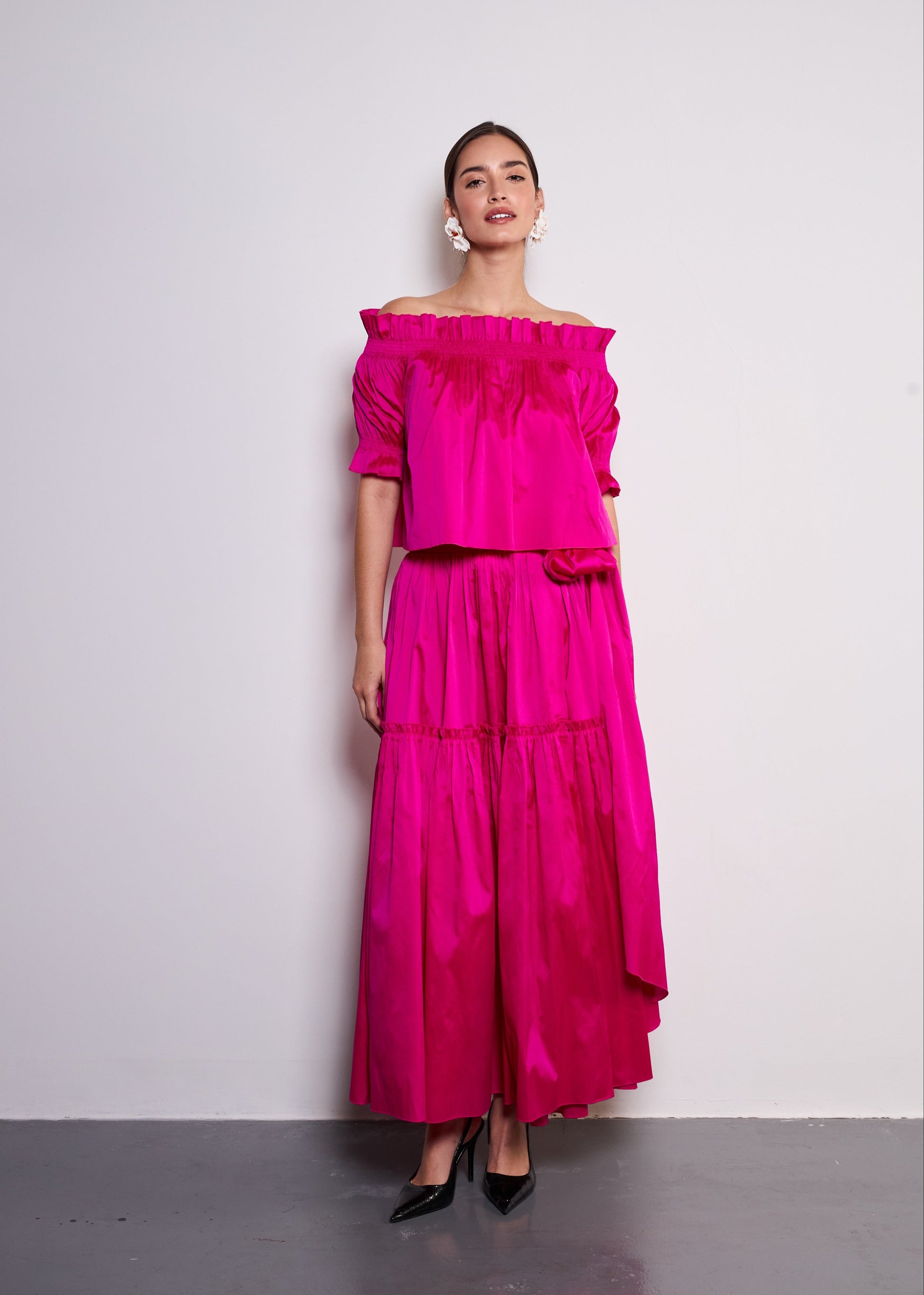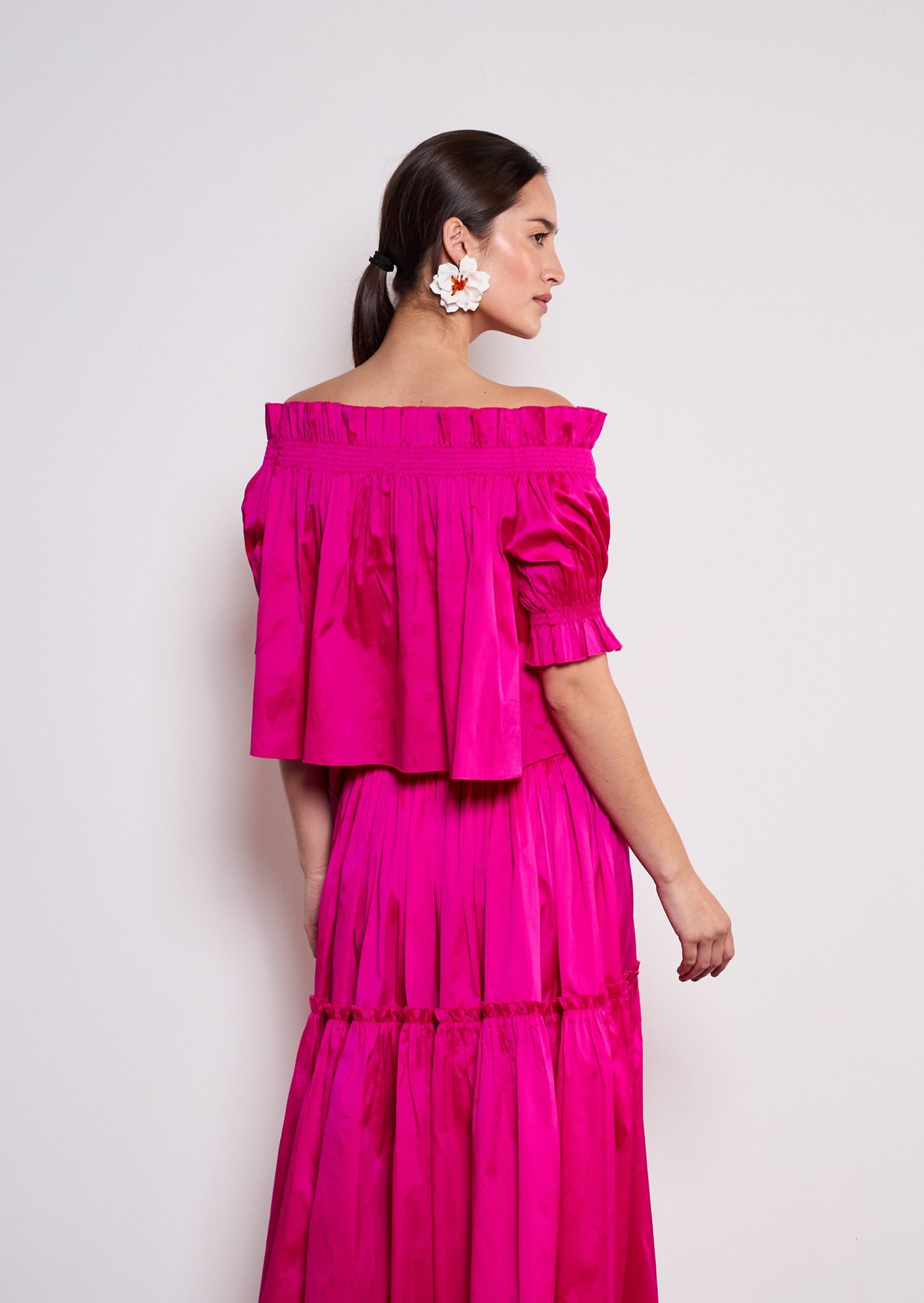 Make way for the fashion royalty! Barbie set features short sleeve off-the shoulders top and skirt with side belt.