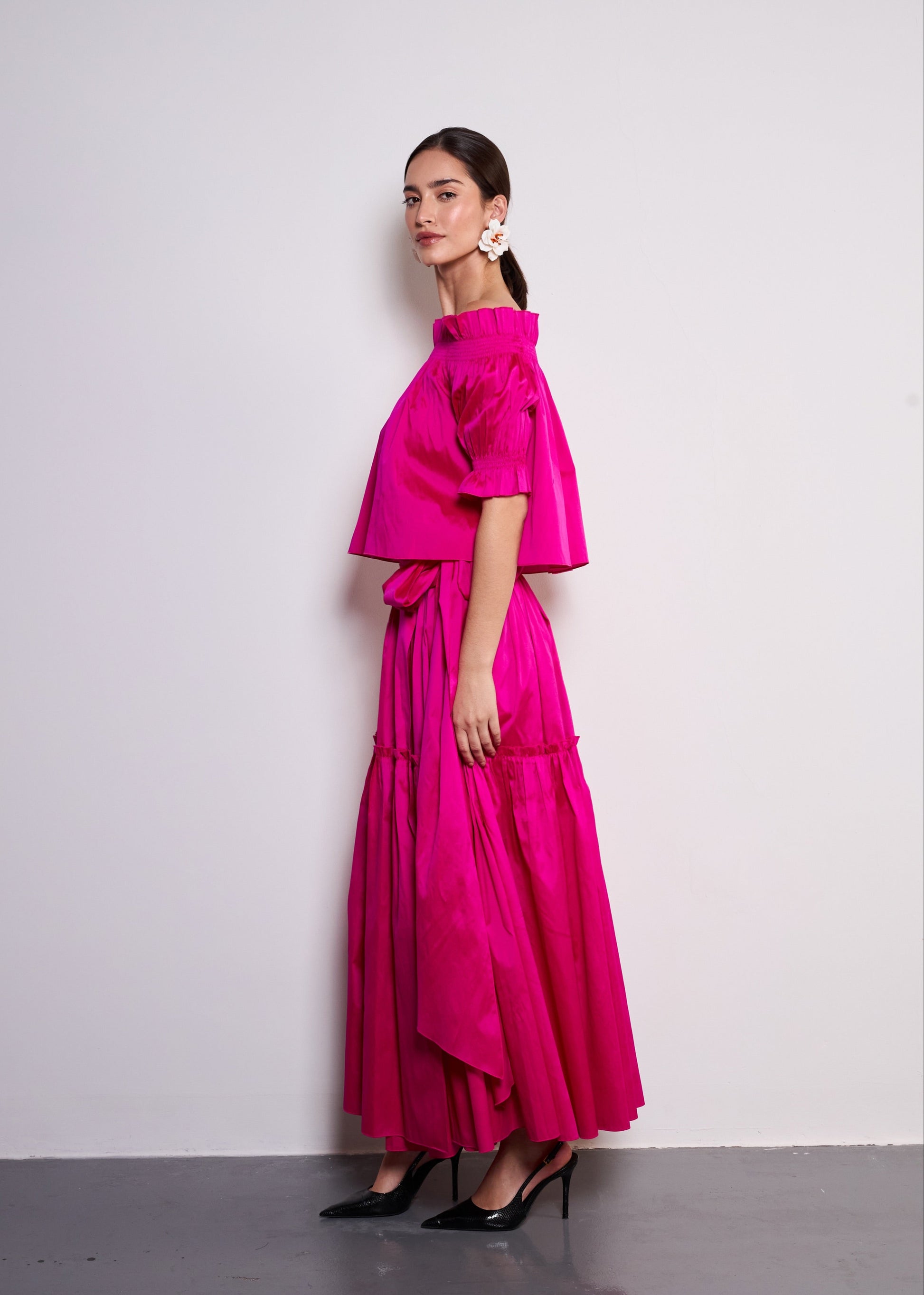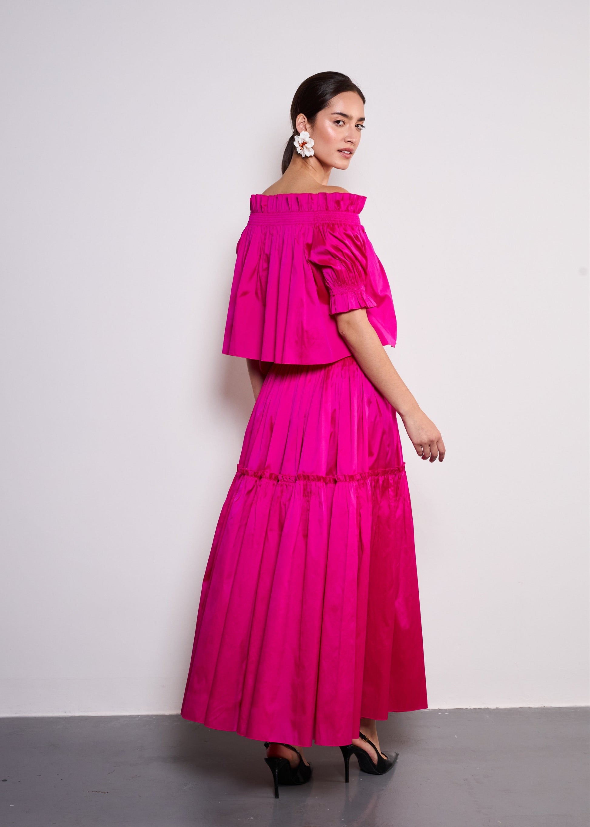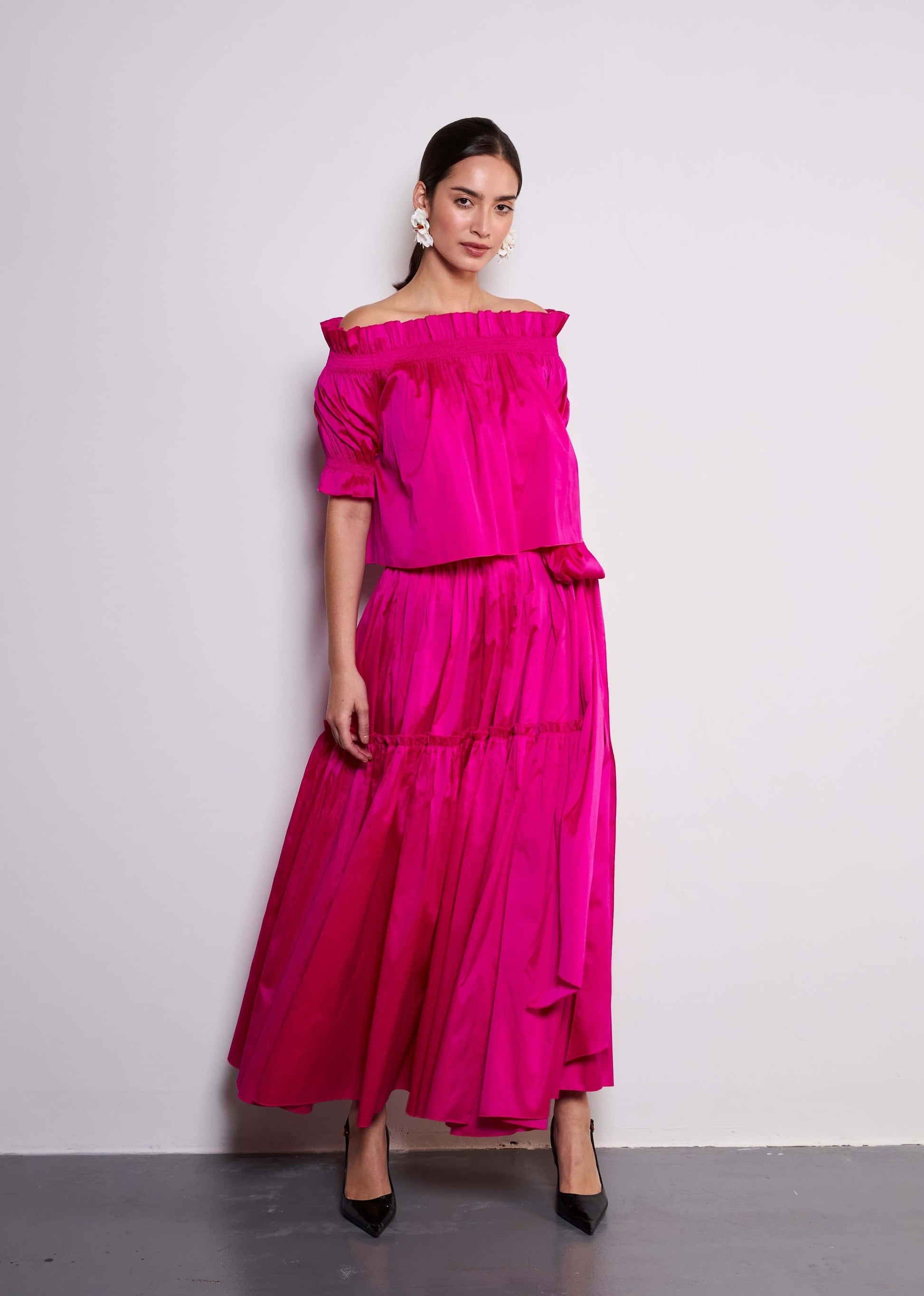 Make way for the fashion royalty! Barbie set features short sleeve off-the shoulders top and skirt with side belt.