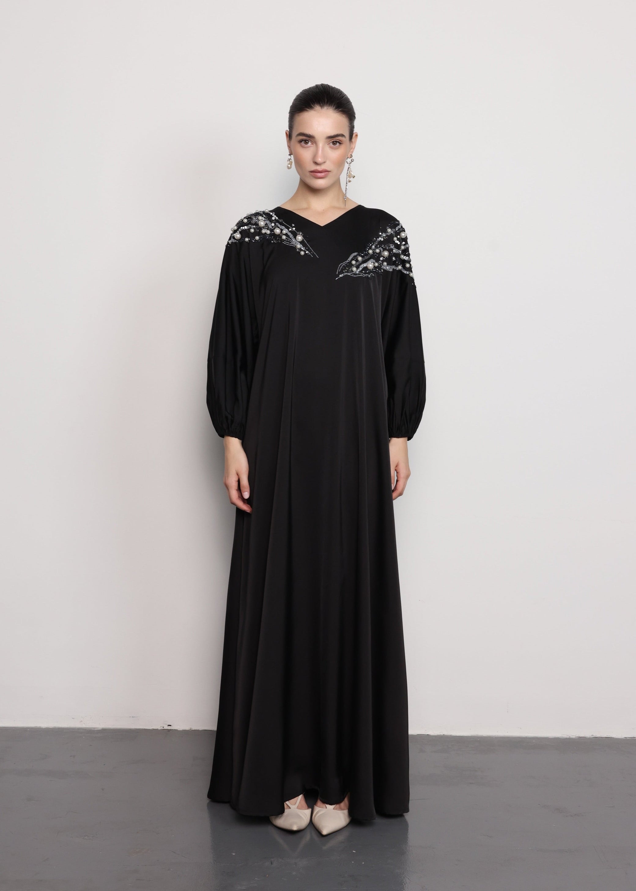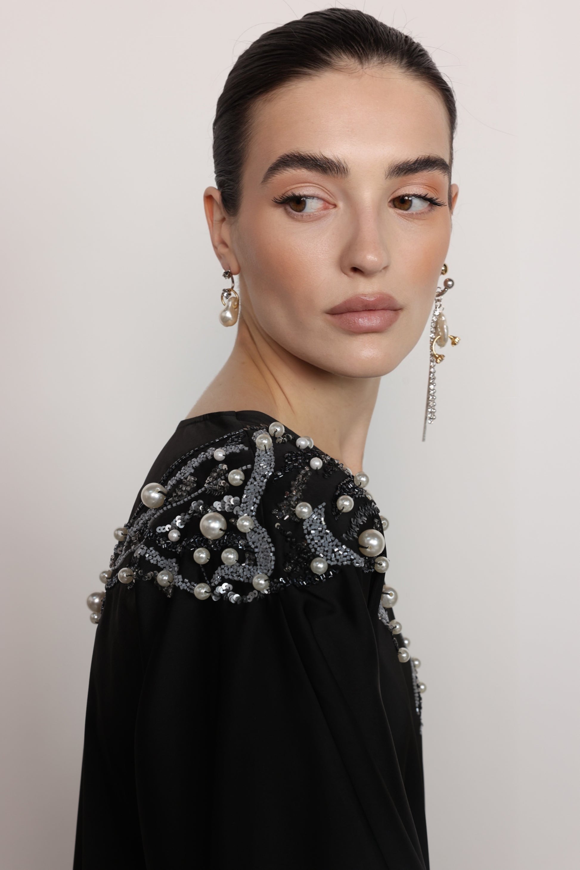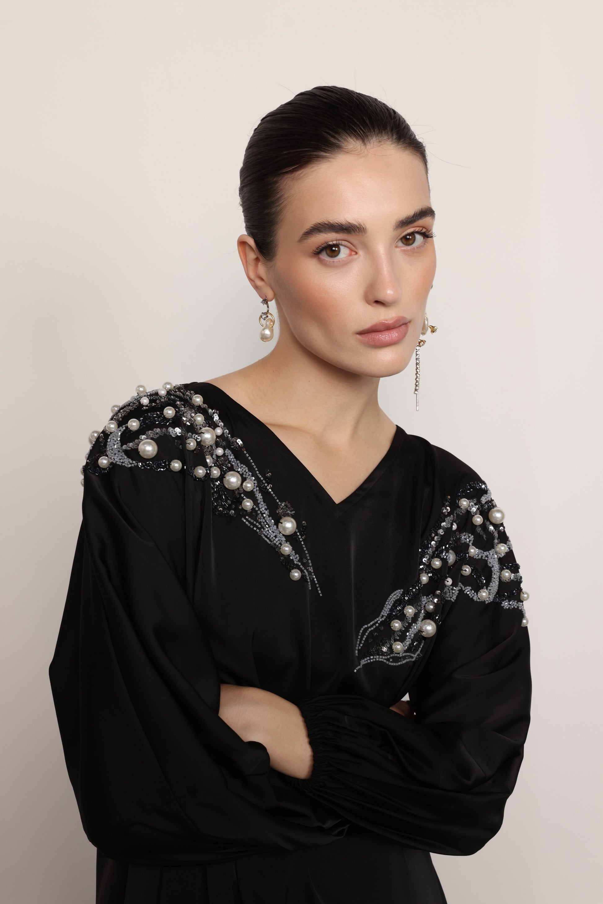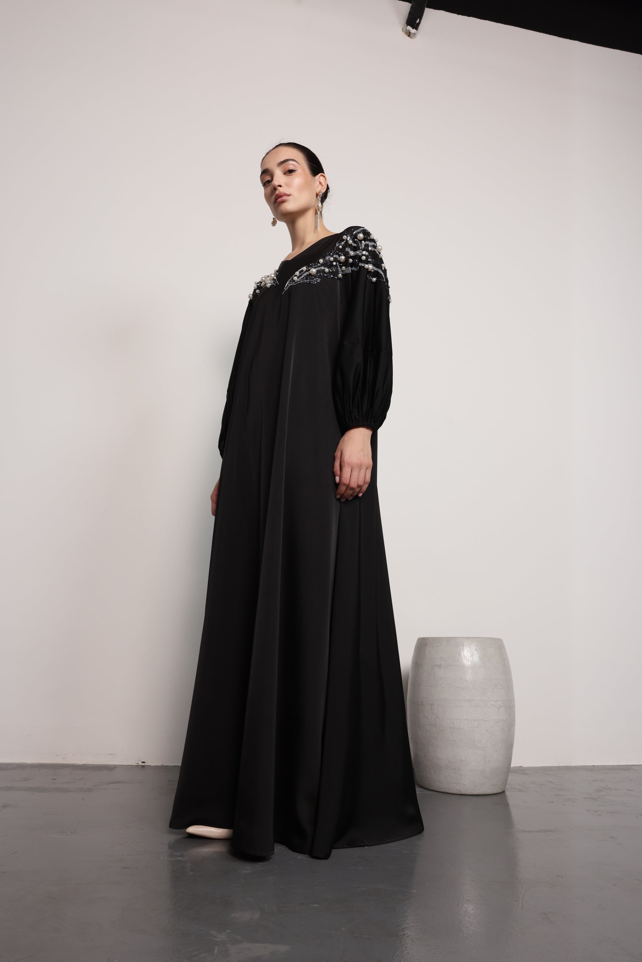 Crafted from Mulberry Satin, the Cleo dress features delicate pearl and bead embellishments across the shoulders, adding a refined sparkle to the timeless silhouette. The voluminous sleeves and flowing cut create an effortlessly regal look.