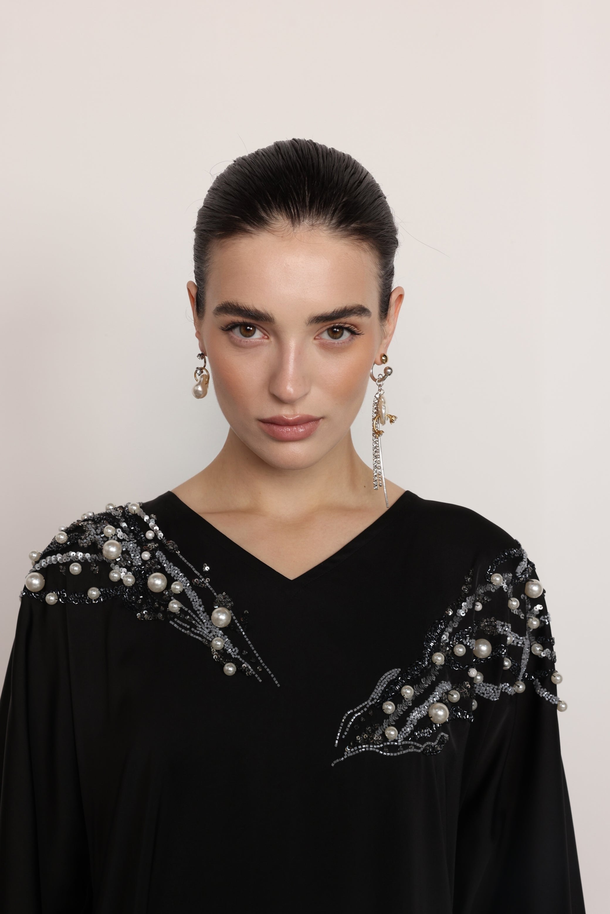 - Design Highlights: Pearl and bead embellishments, voluminous sleeves, V-neckline