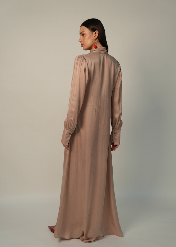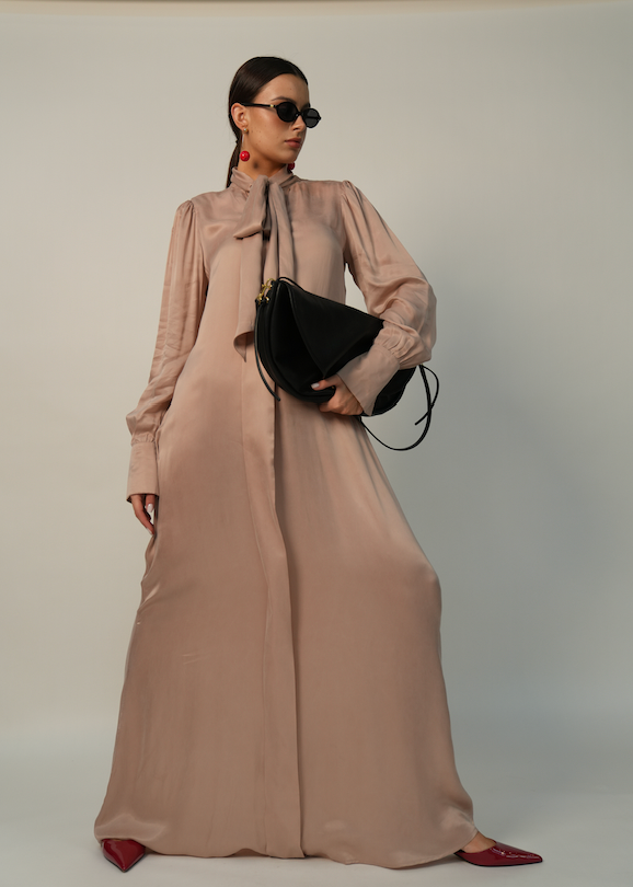 Masterfully draped in premium Escada silk with a luminous, champagne-tinted glow, the Creme dress offers a flawless transition from classic modesty to contemporary chic.