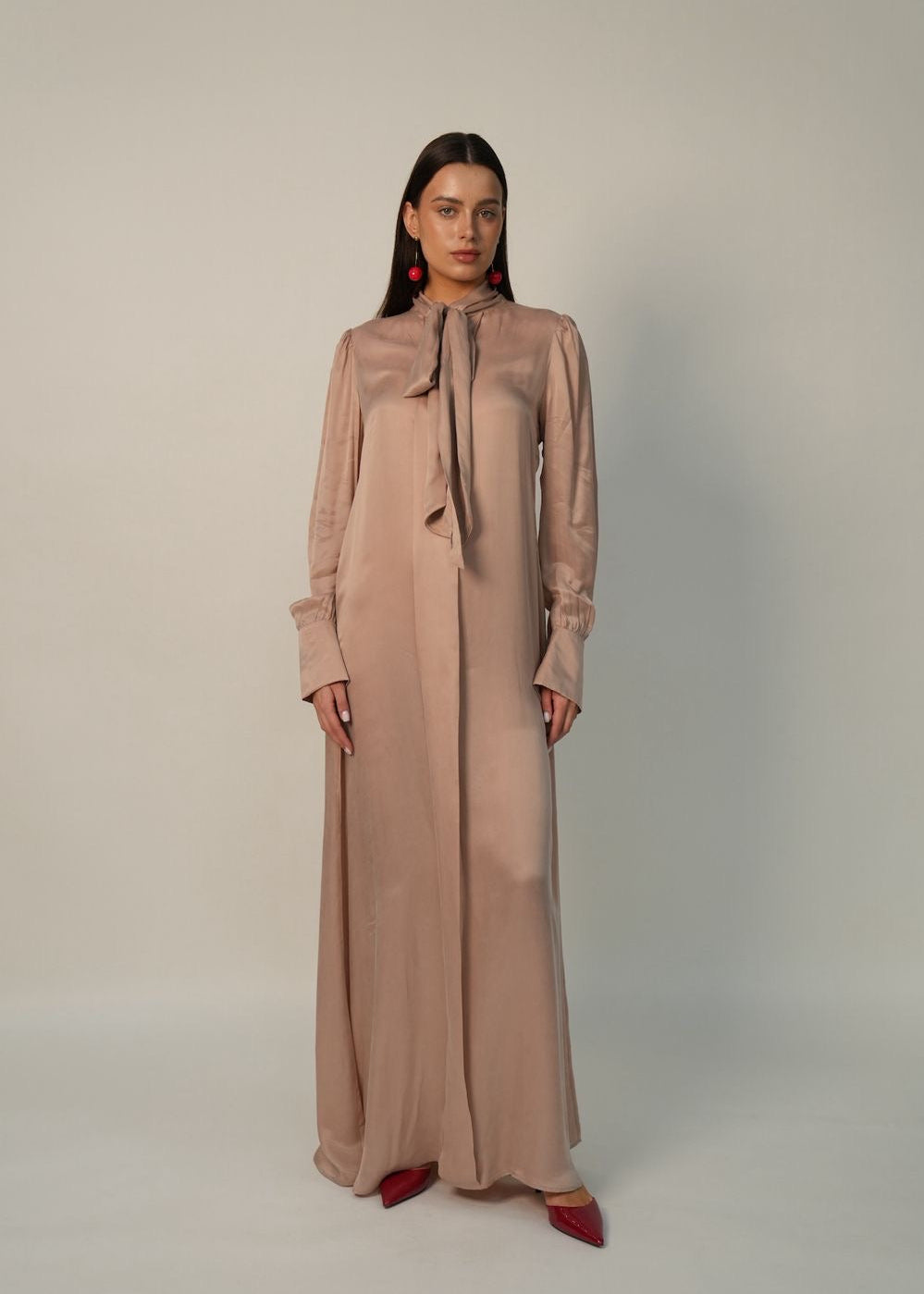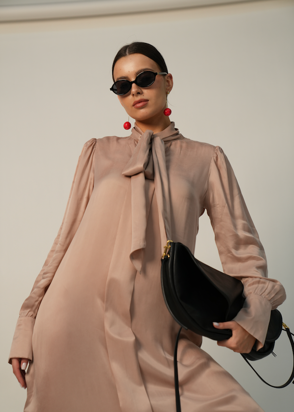 Style Tip: Pair the Creme Dress with deep red pointed flats and matching statement earrings to create a bold, modern contrast against the soft silk texture