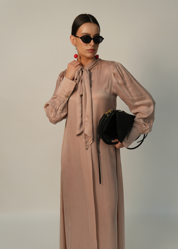 - Design Highlights: It features a dramatic pussy-bow neckline and high-buttoned cuffs, paired with a long, fluid silhouette that moves with effortless grace for a sophisticated, feminine touch.