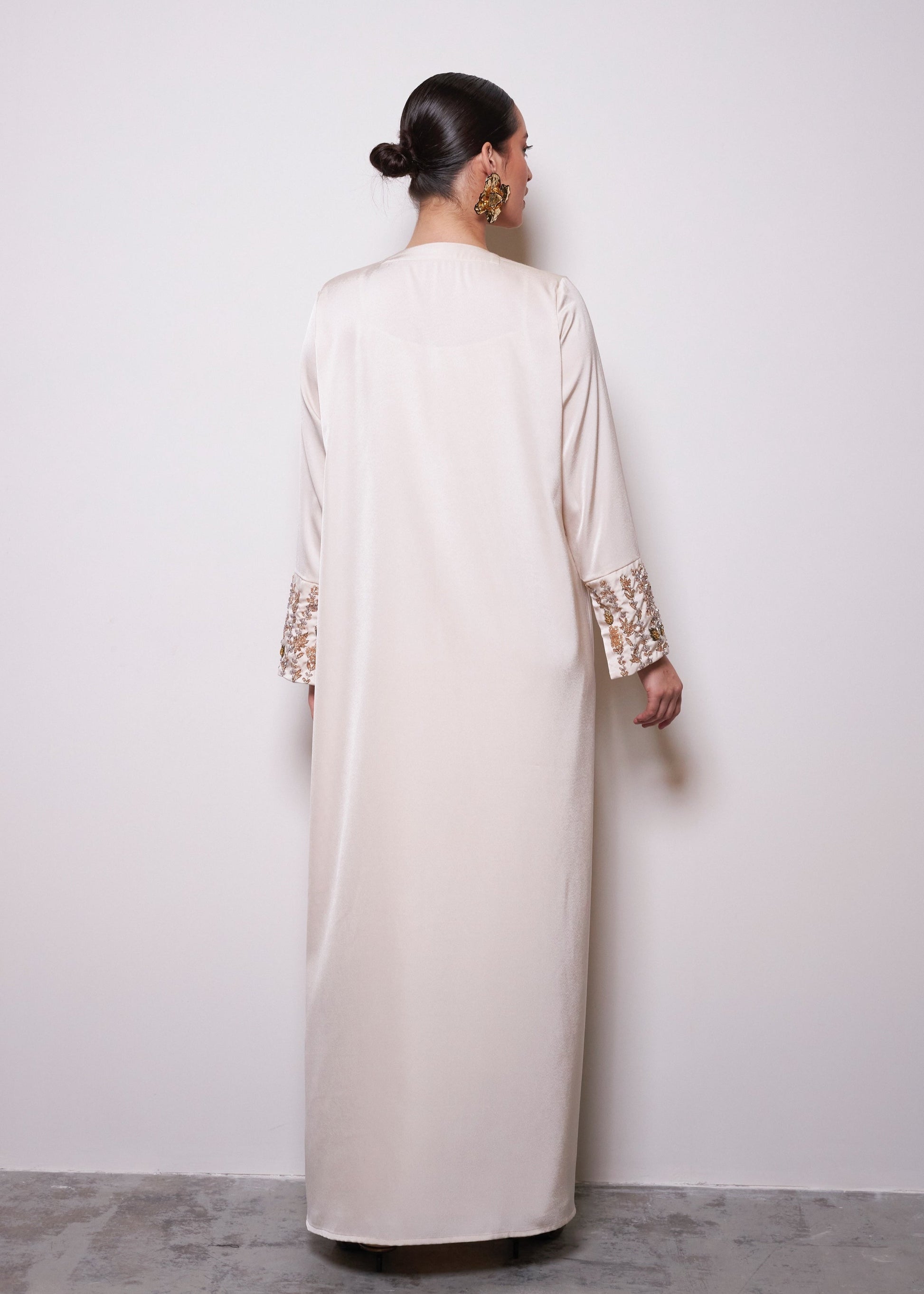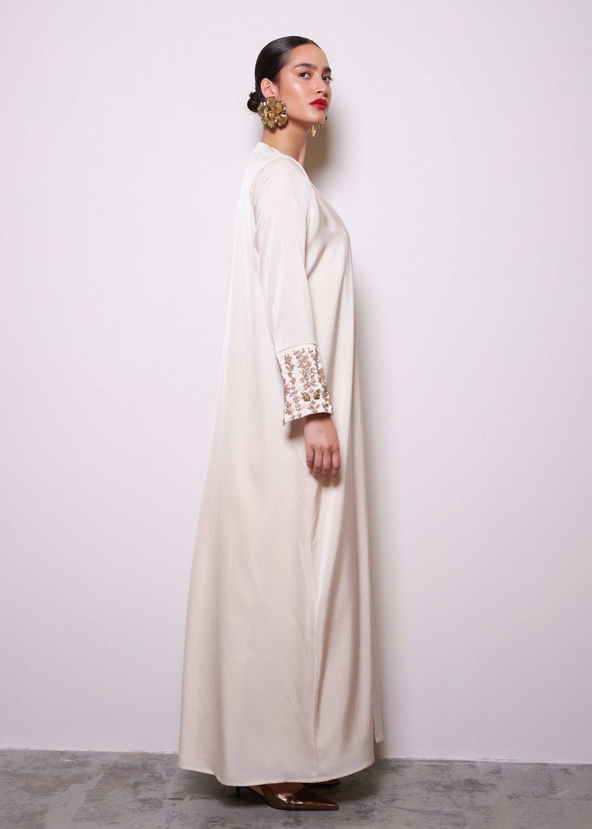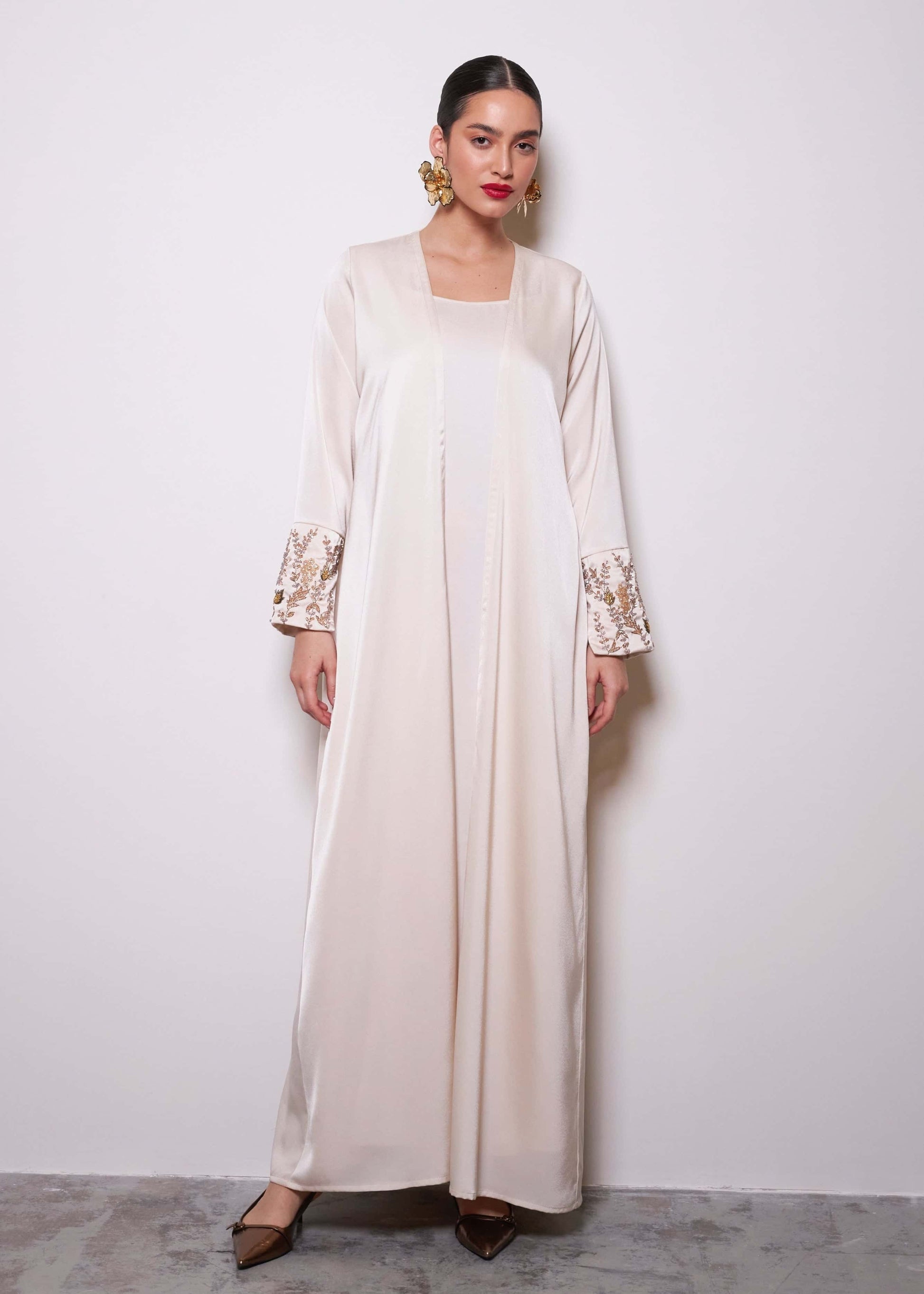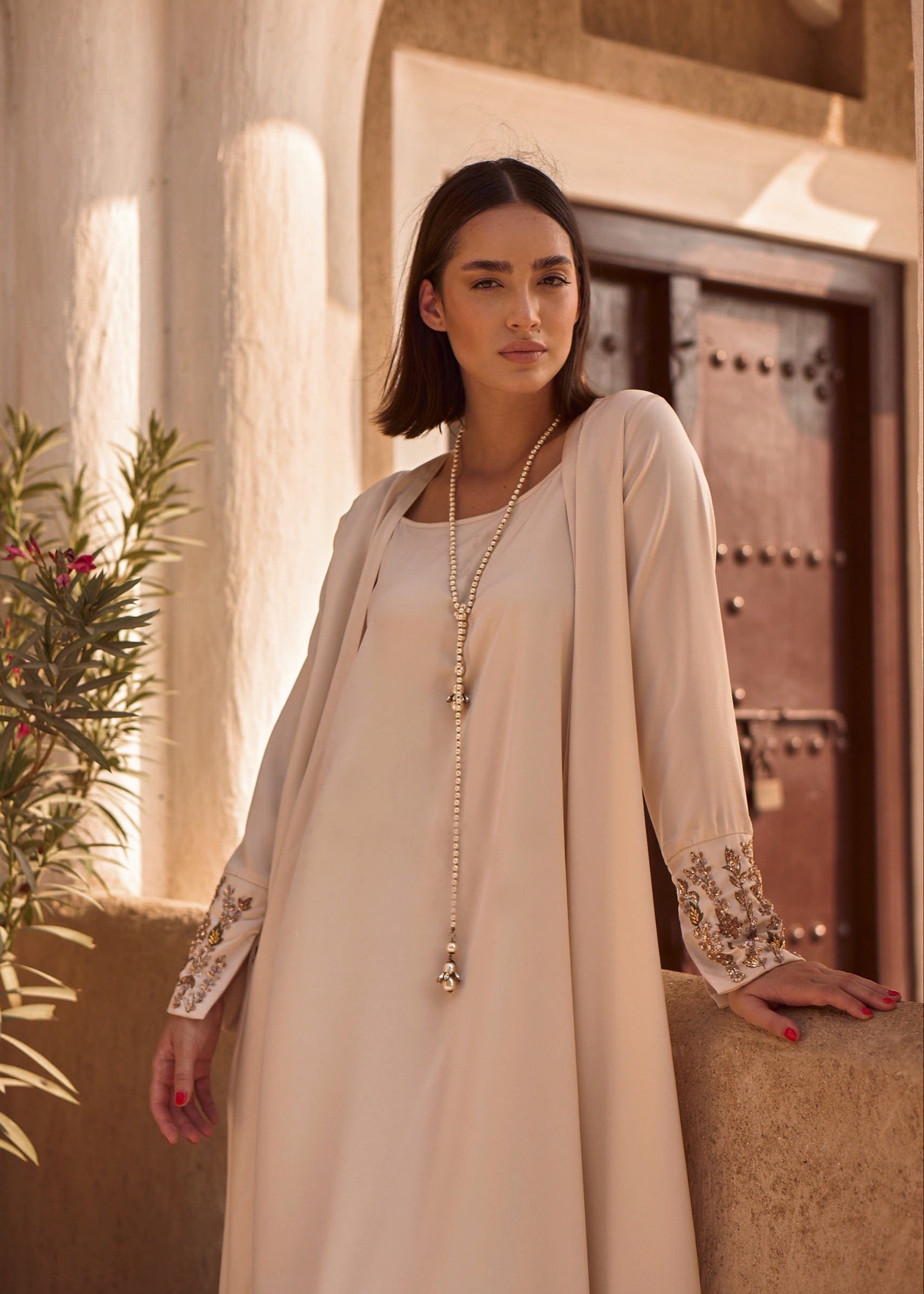 Redefine elegance with the Elly Rosa, designed from luxurious mulberry silk. Available in cream and black, this abaya is the epitome of understated sophistication, perfect for any special event.