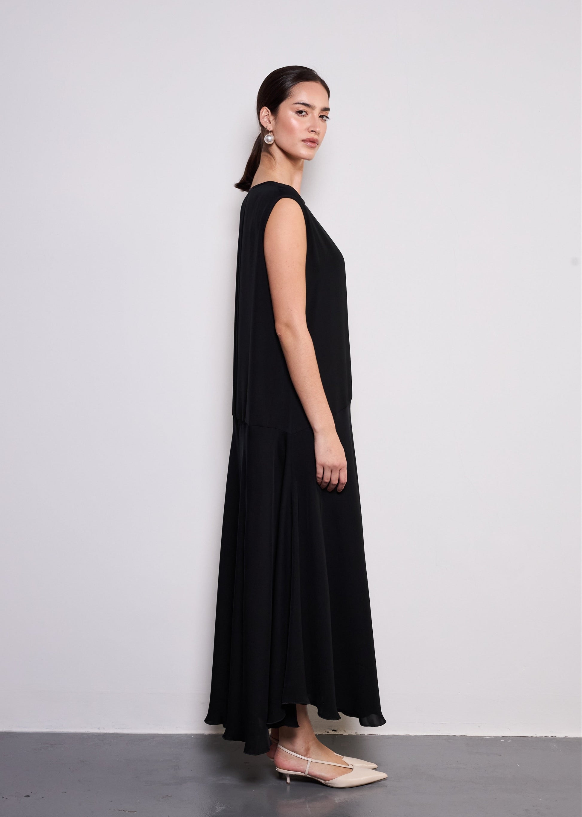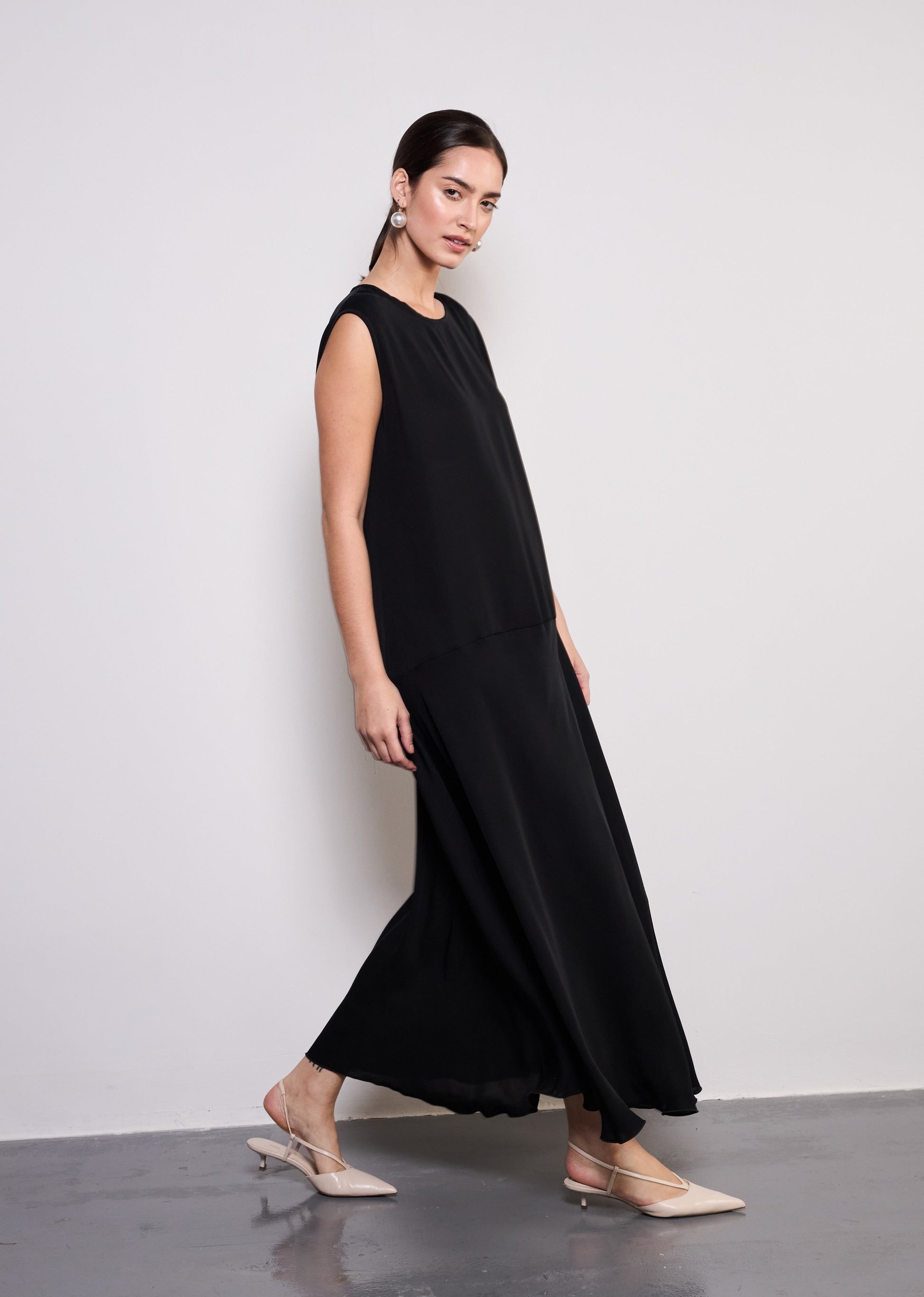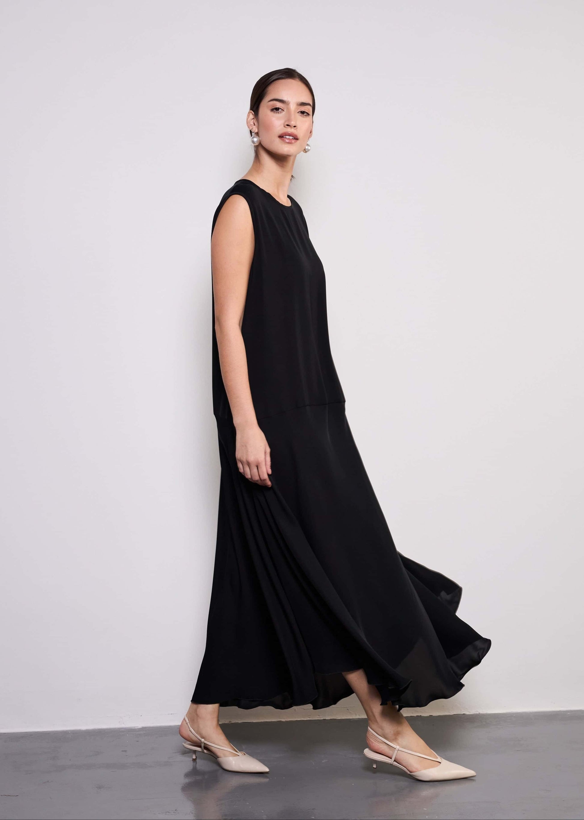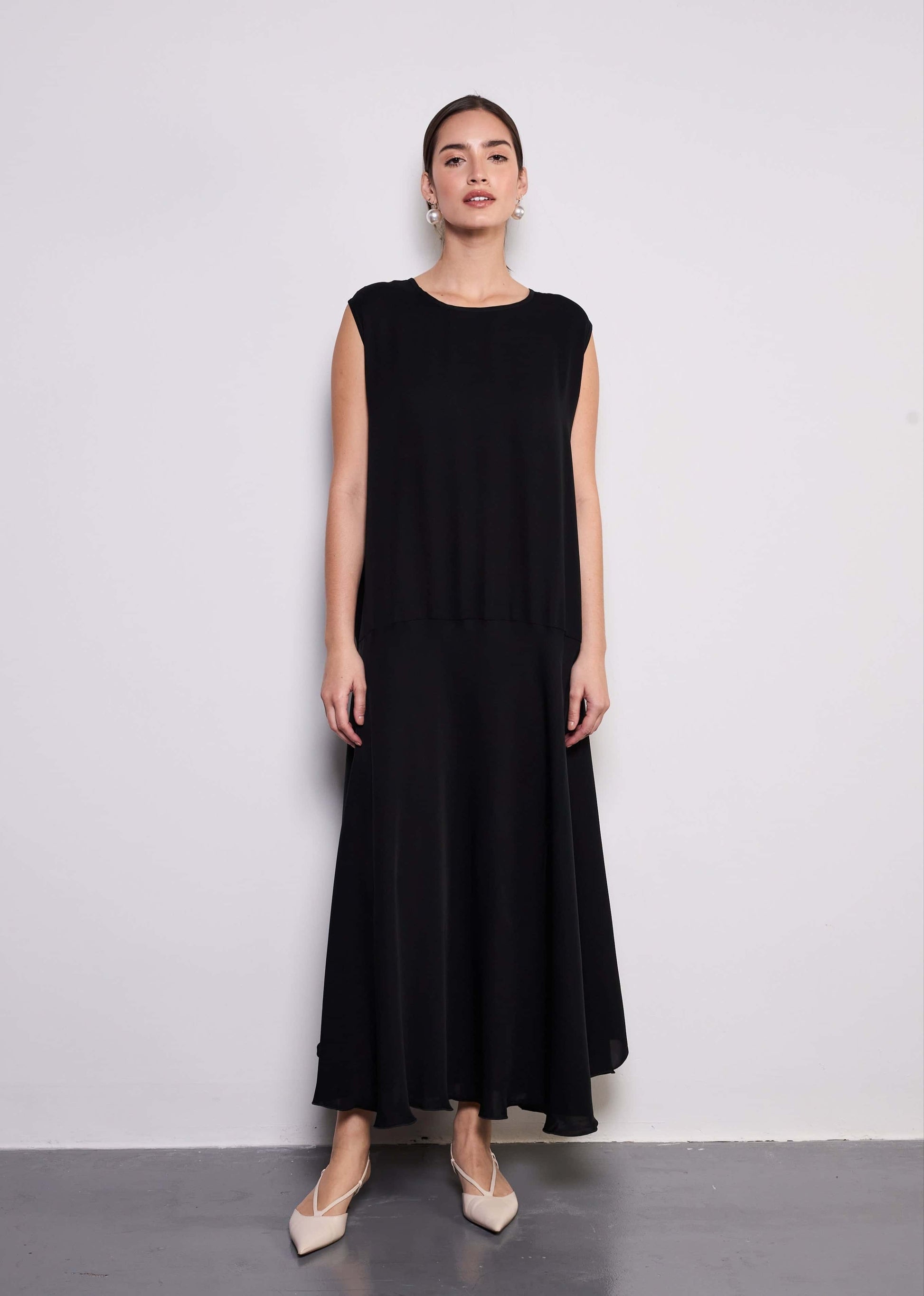 A timeless staple in every modest wardrobe, this flowy black dress is designed with a clean, sleeveless cut and a soft, fluid silhouette that moves with grace. Whether worn on its own for a minimalist look or layered under your favorite abaya, it brings a sense of effortless refinement to any outfit.
