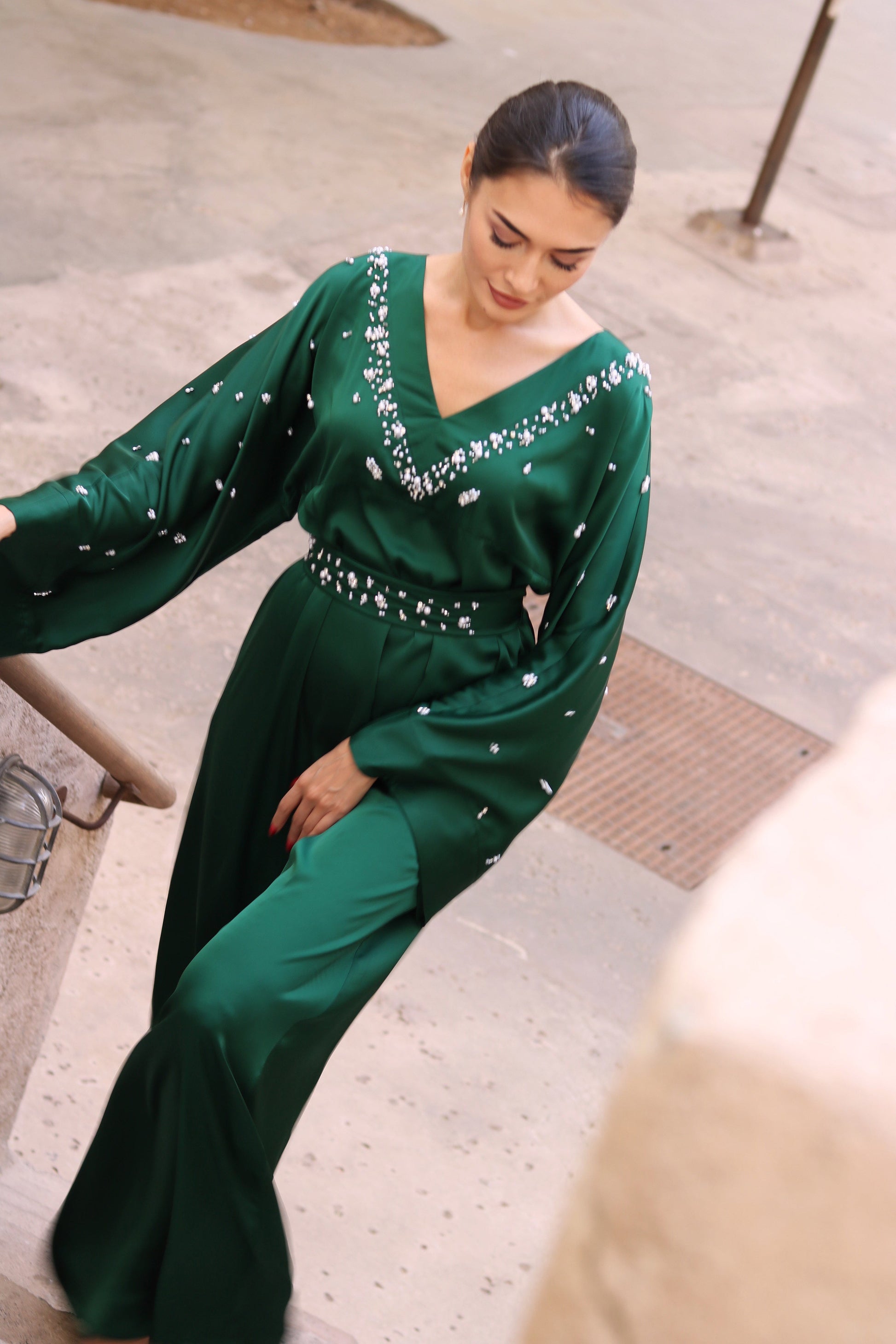 The Habibi Kaftan, crafted from premium Italian silk for a smooth, luxurious feel. Featuring delicate hand embroidery on the neckline and a detachable belt, this versatile piece allows for both a structured and flowy silhouette.