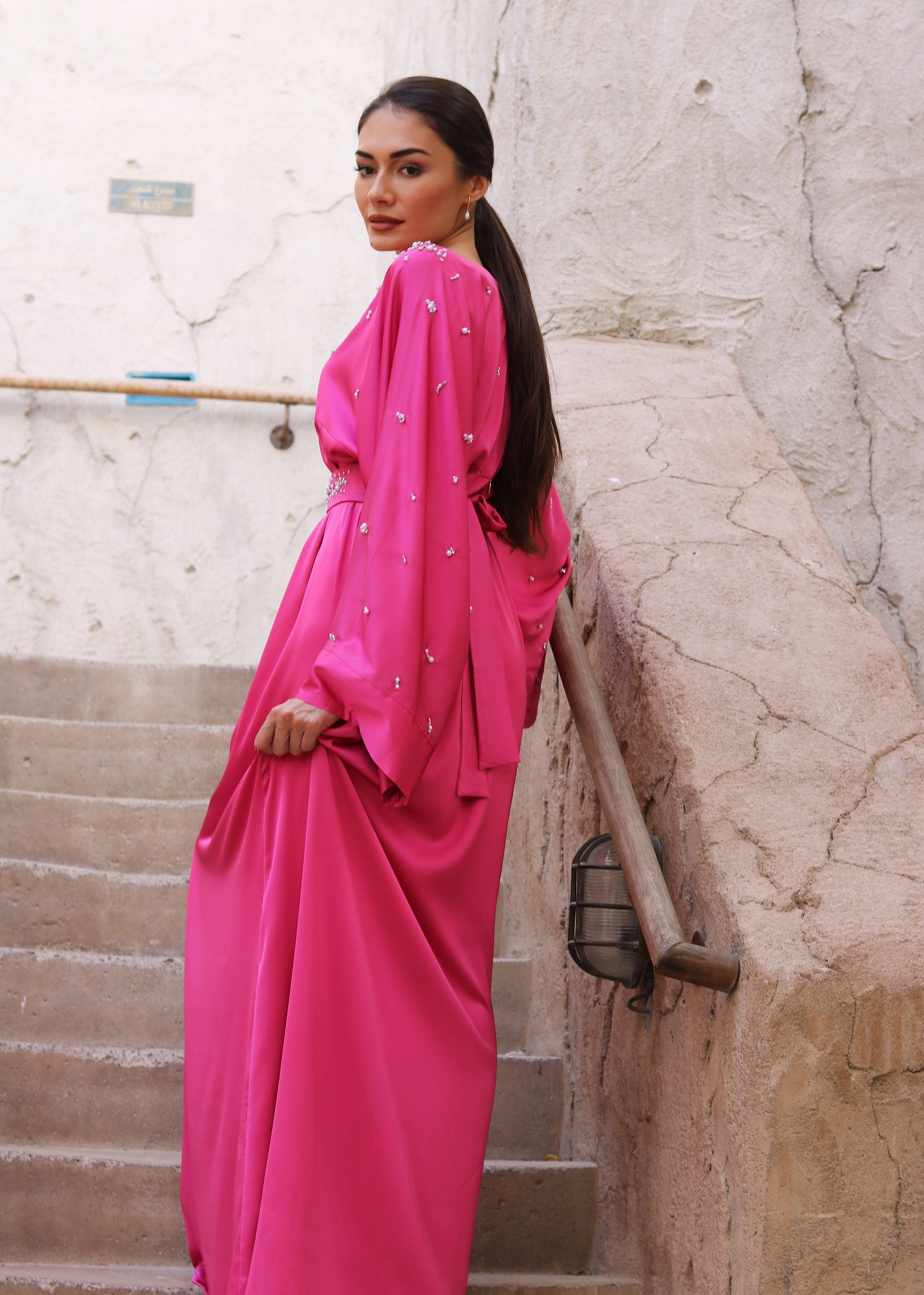The Habibi Kaftan, crafted from premium Italian silk for a smooth, luxurious feel. Featuring delicate hand embroidery on the neckline and a detachable belt, this versatile piece allows for both a structured and flowy silhouette.