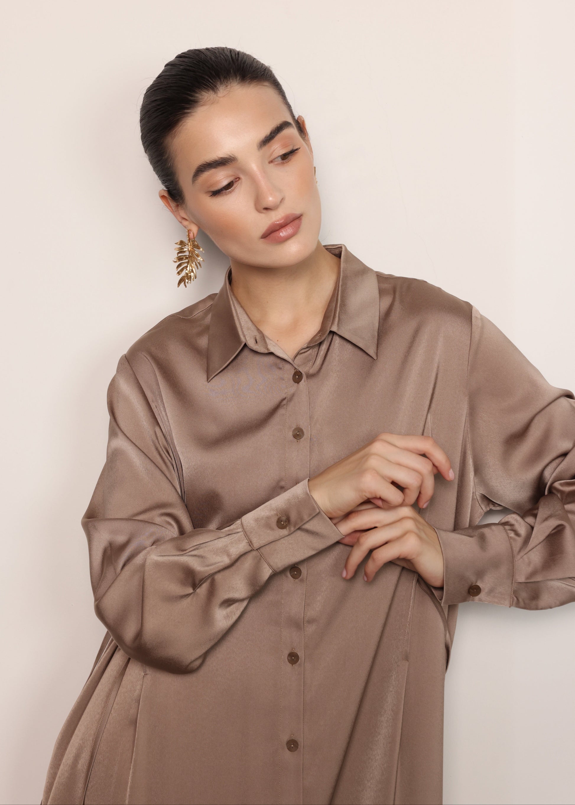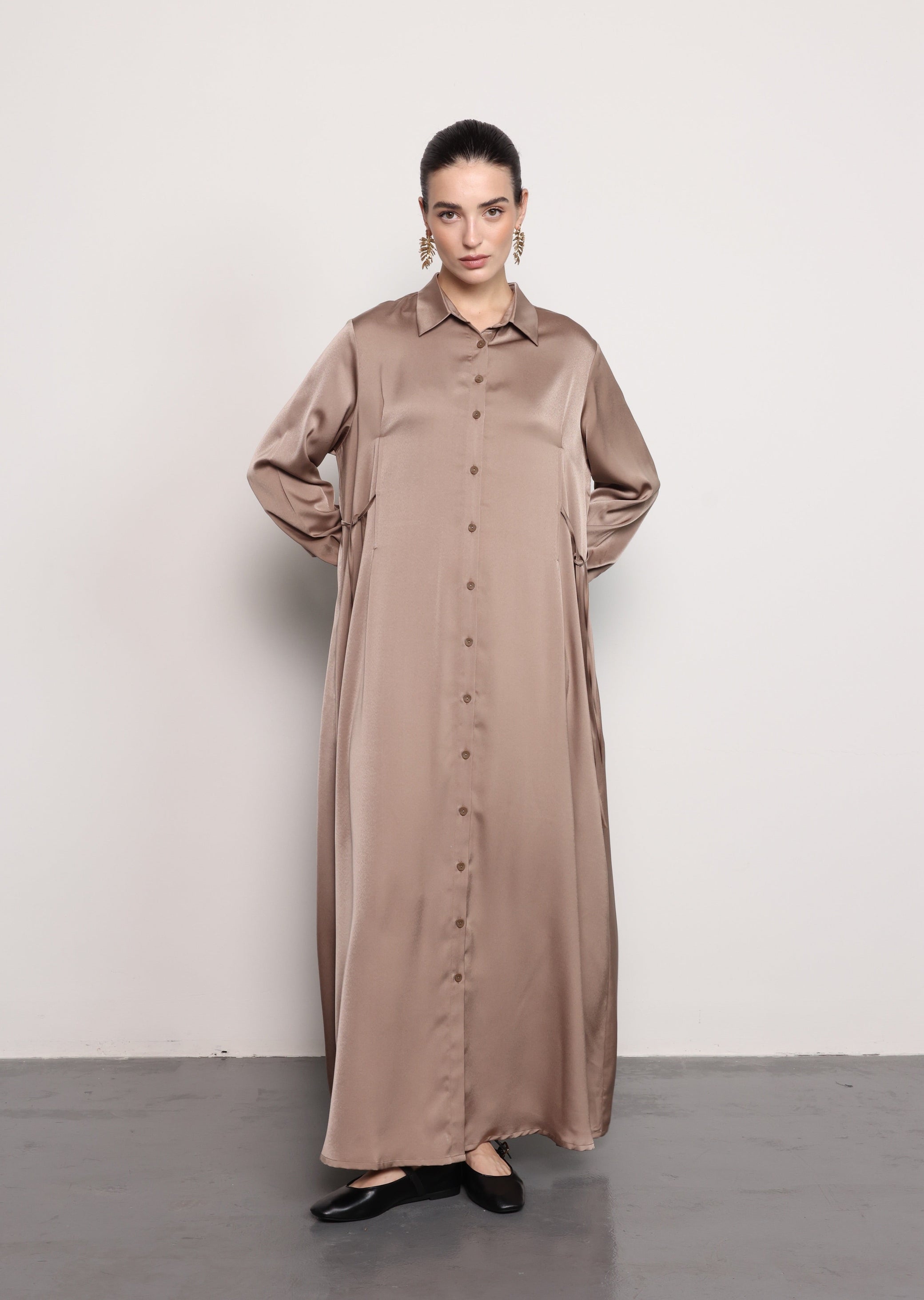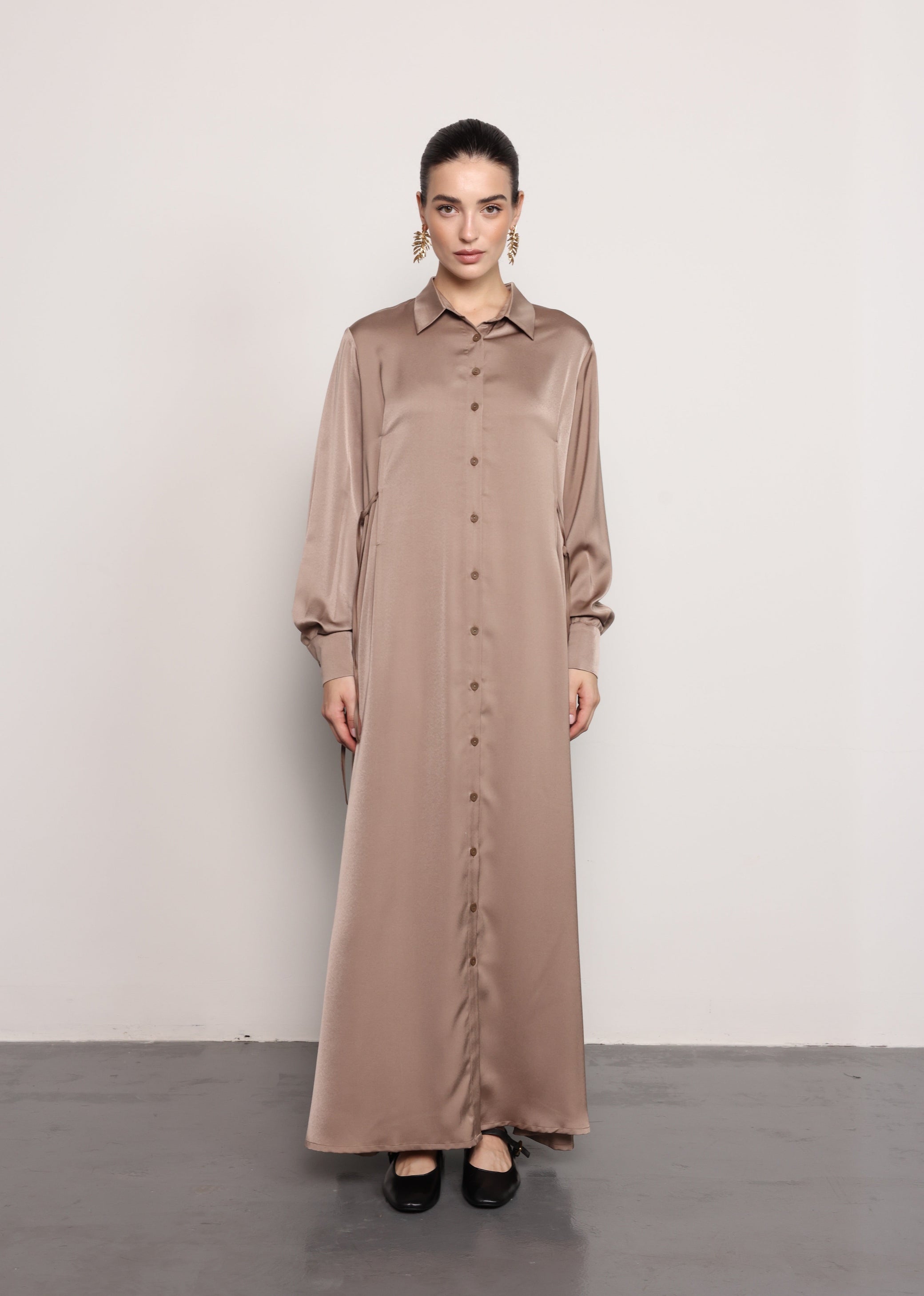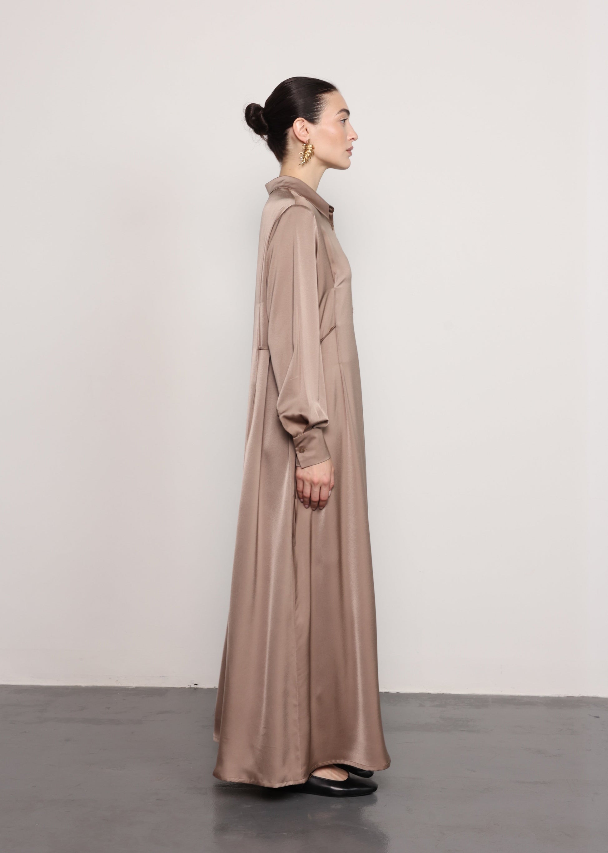 Crafted in a smooth mulberry satin fabric, this maxi shirt dress features a fluid, straight silhouette designed for effortless elegance. The button-down front and classic shirt collar create a timeless structure, while the long sleeves and soft drape enhance its refined, minimalist appeal.
