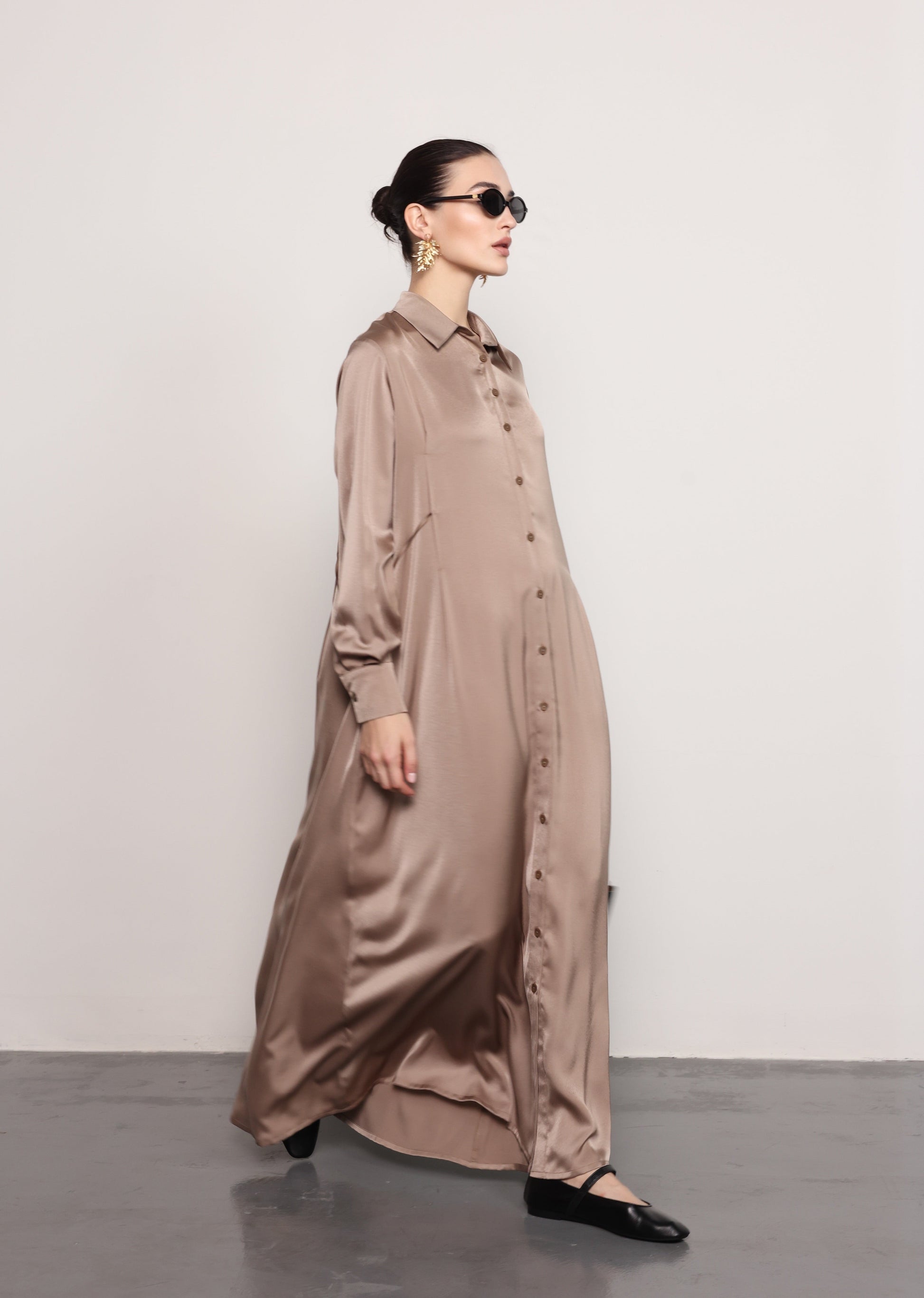 - Design Highlights: Straight maxi length, Button-down front, Shirt collar, Long sleeves, Subtle satin sheen
