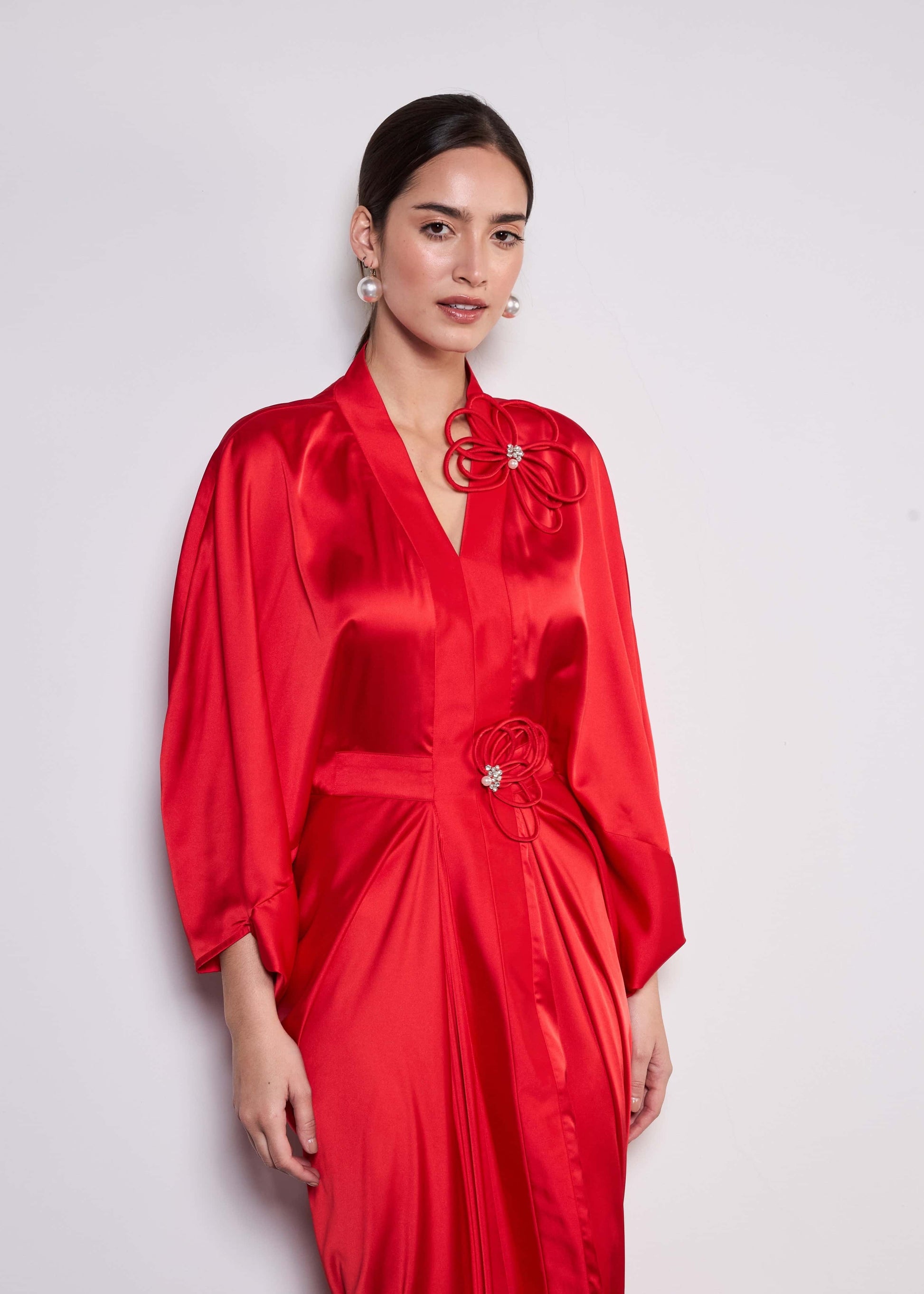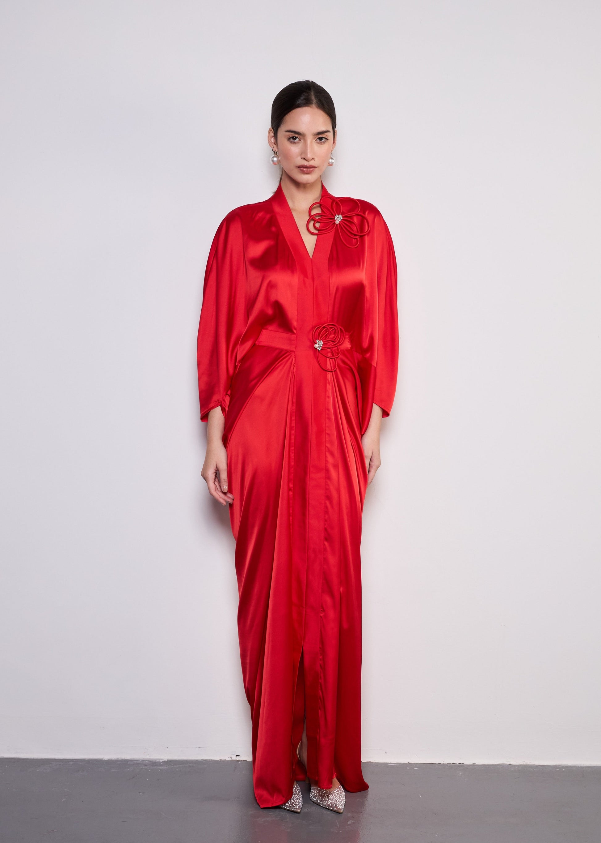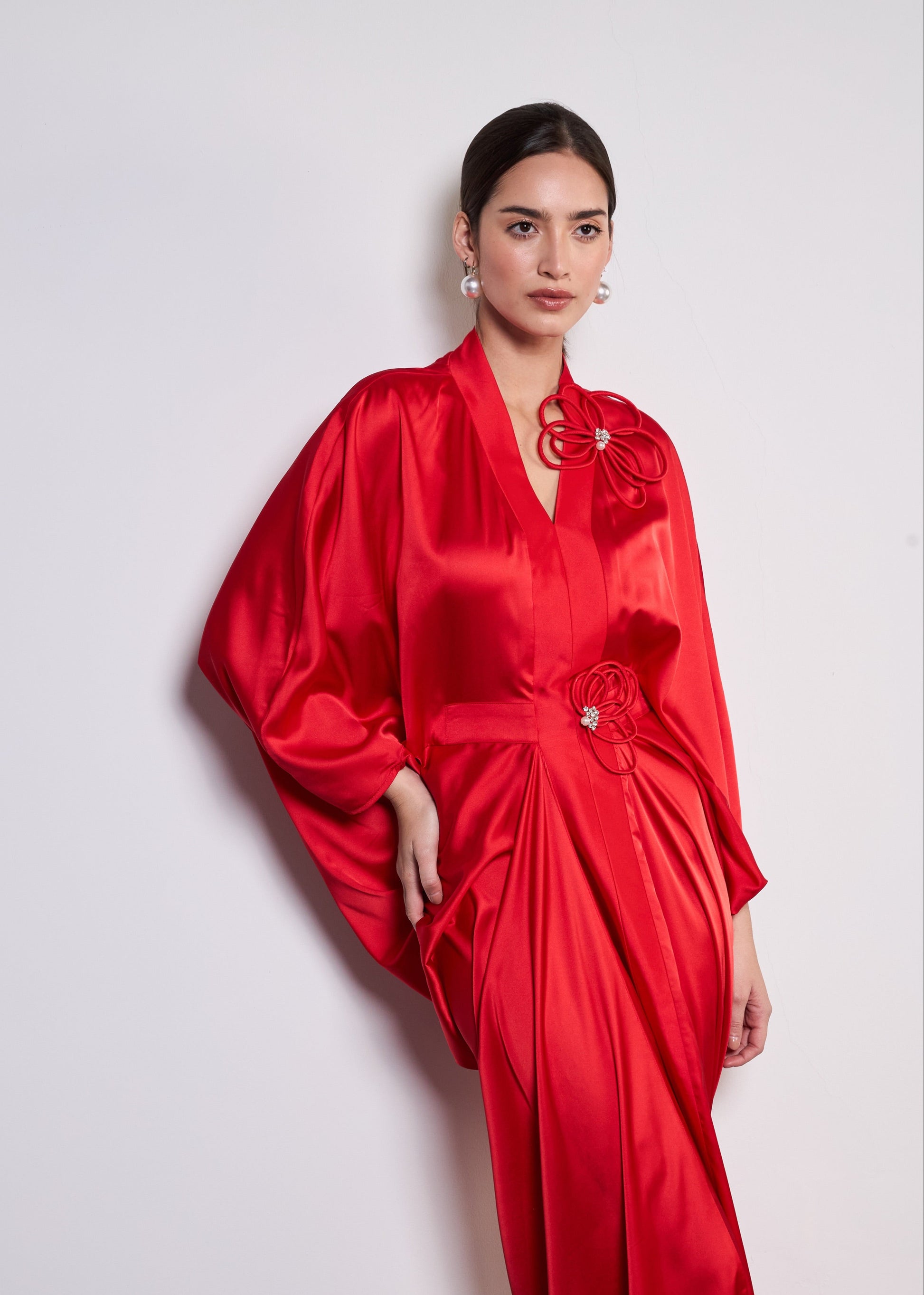 - Design Highlights: Draped silhouette, flowy batwing sleeves, and matching satin belt with floral brooch accents