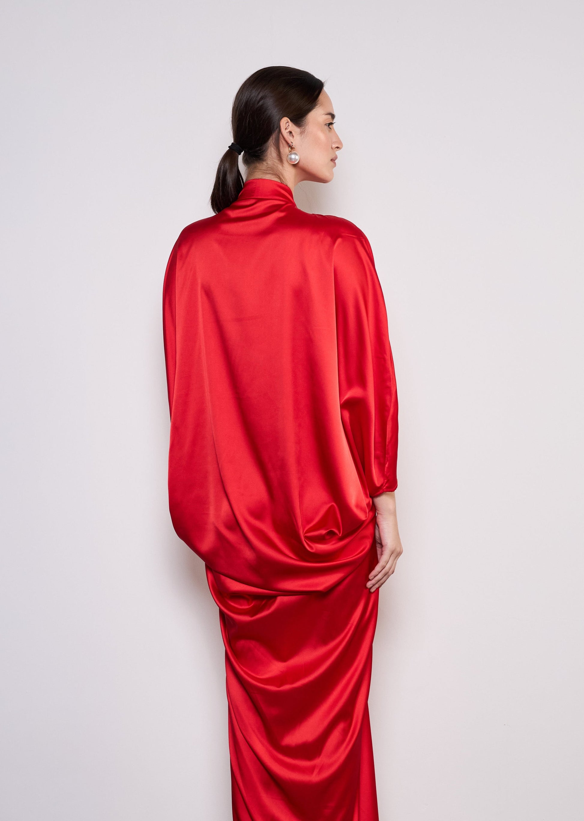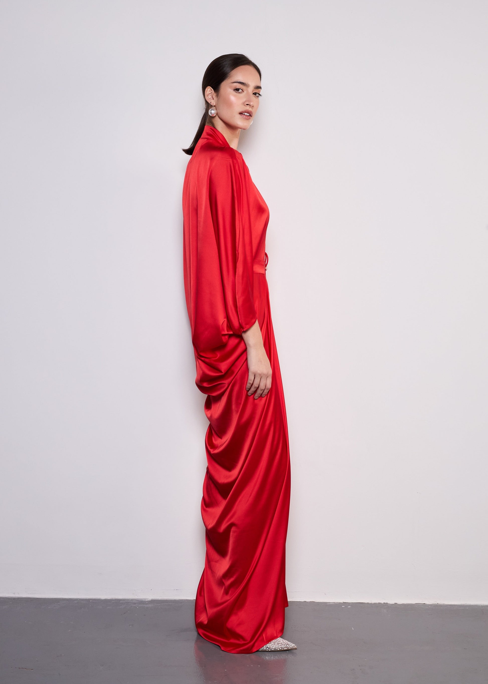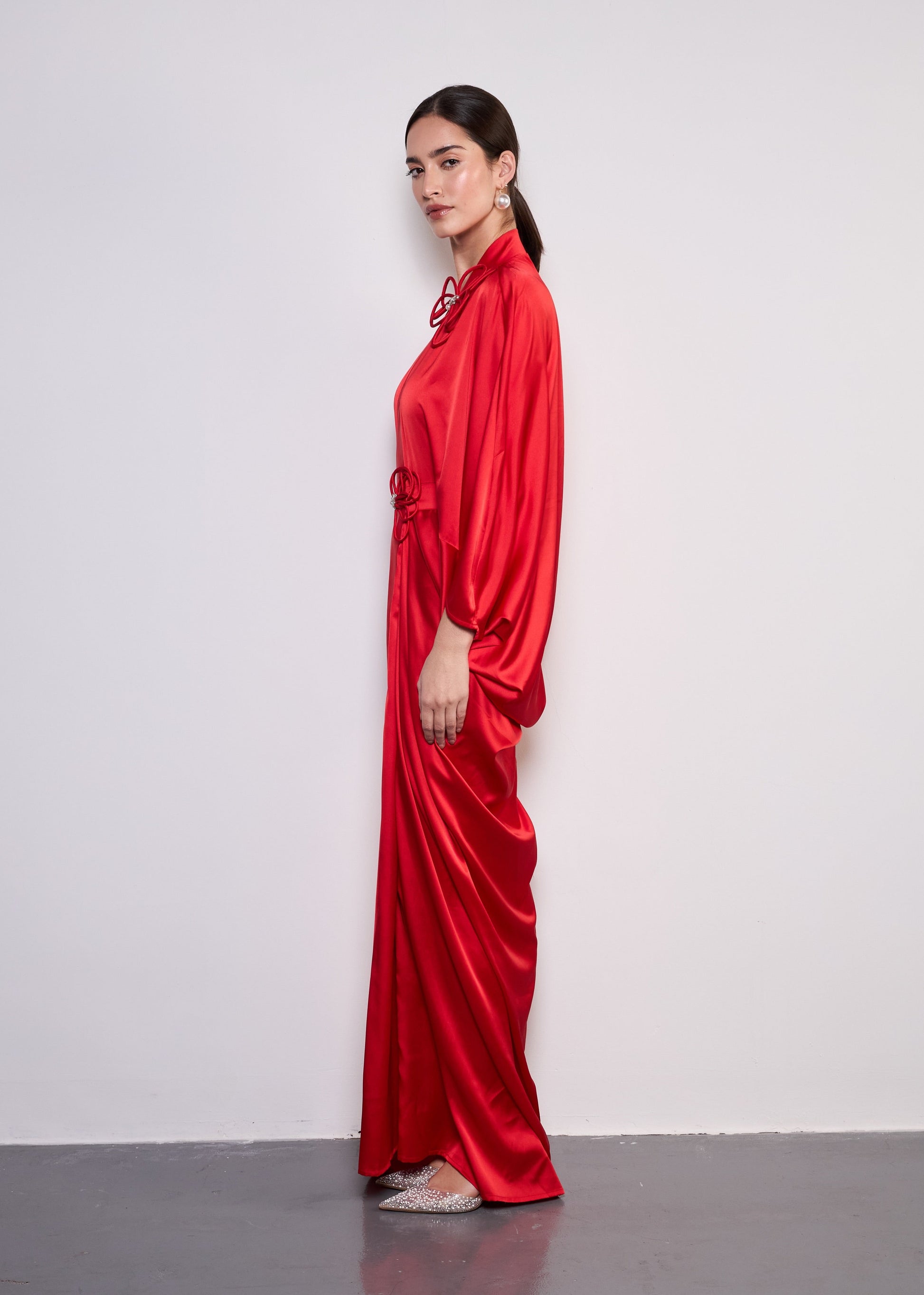 - Design Highlights: Draped silhouette, flowy batwing sleeves, and matching satin belt with floral brooch accents