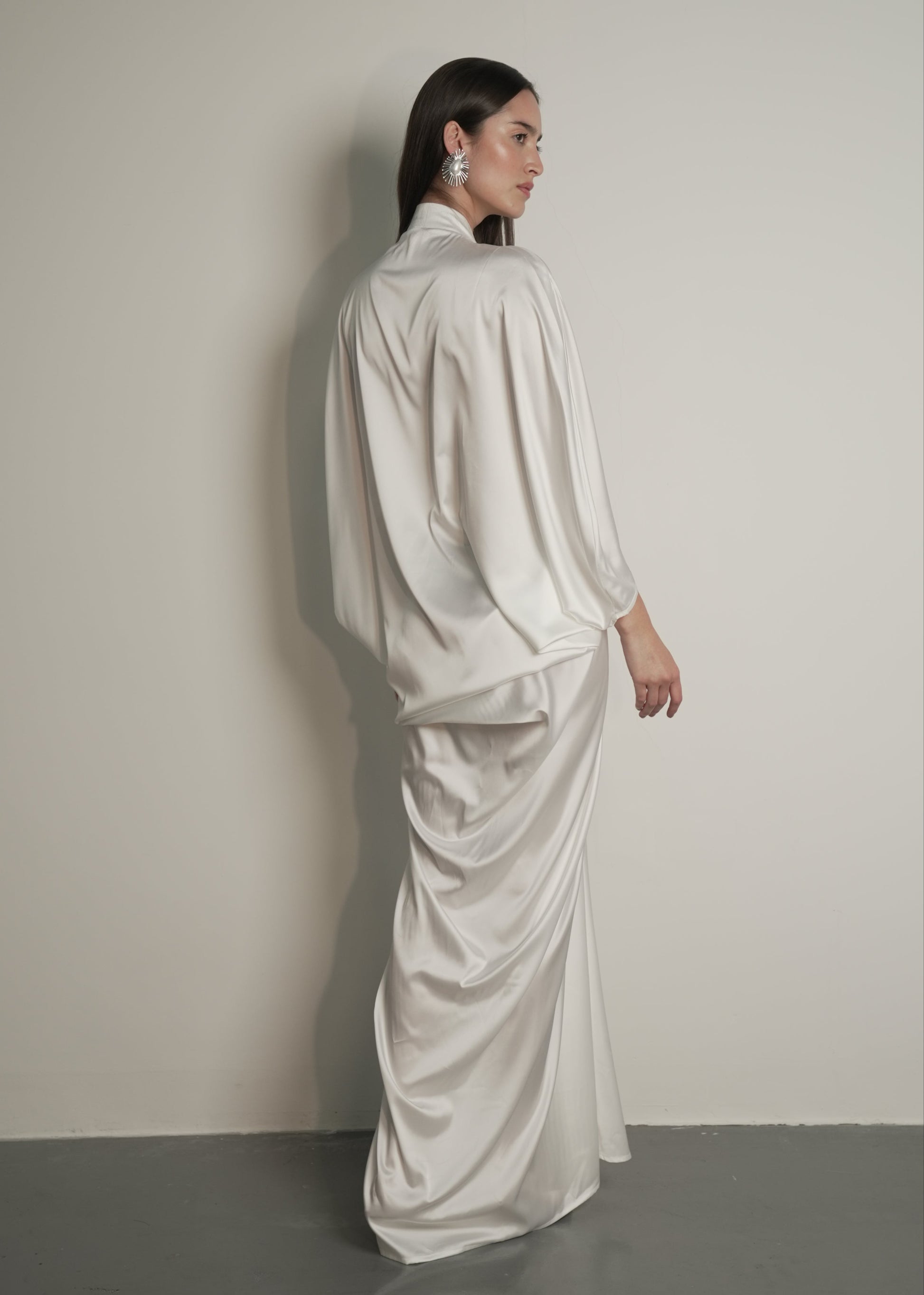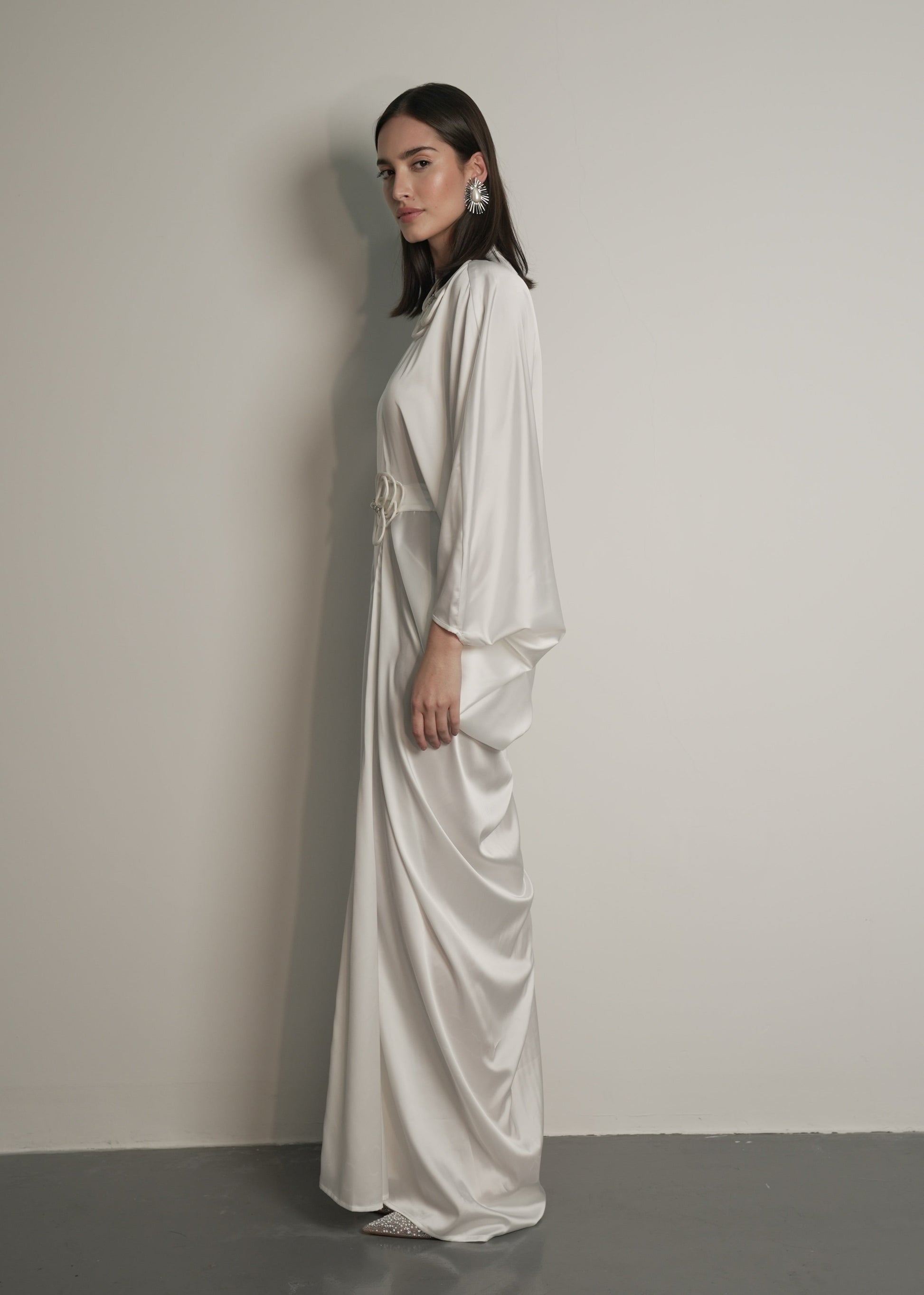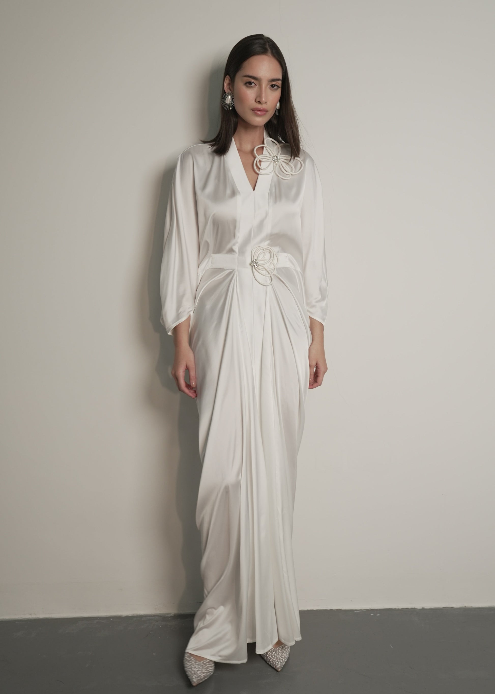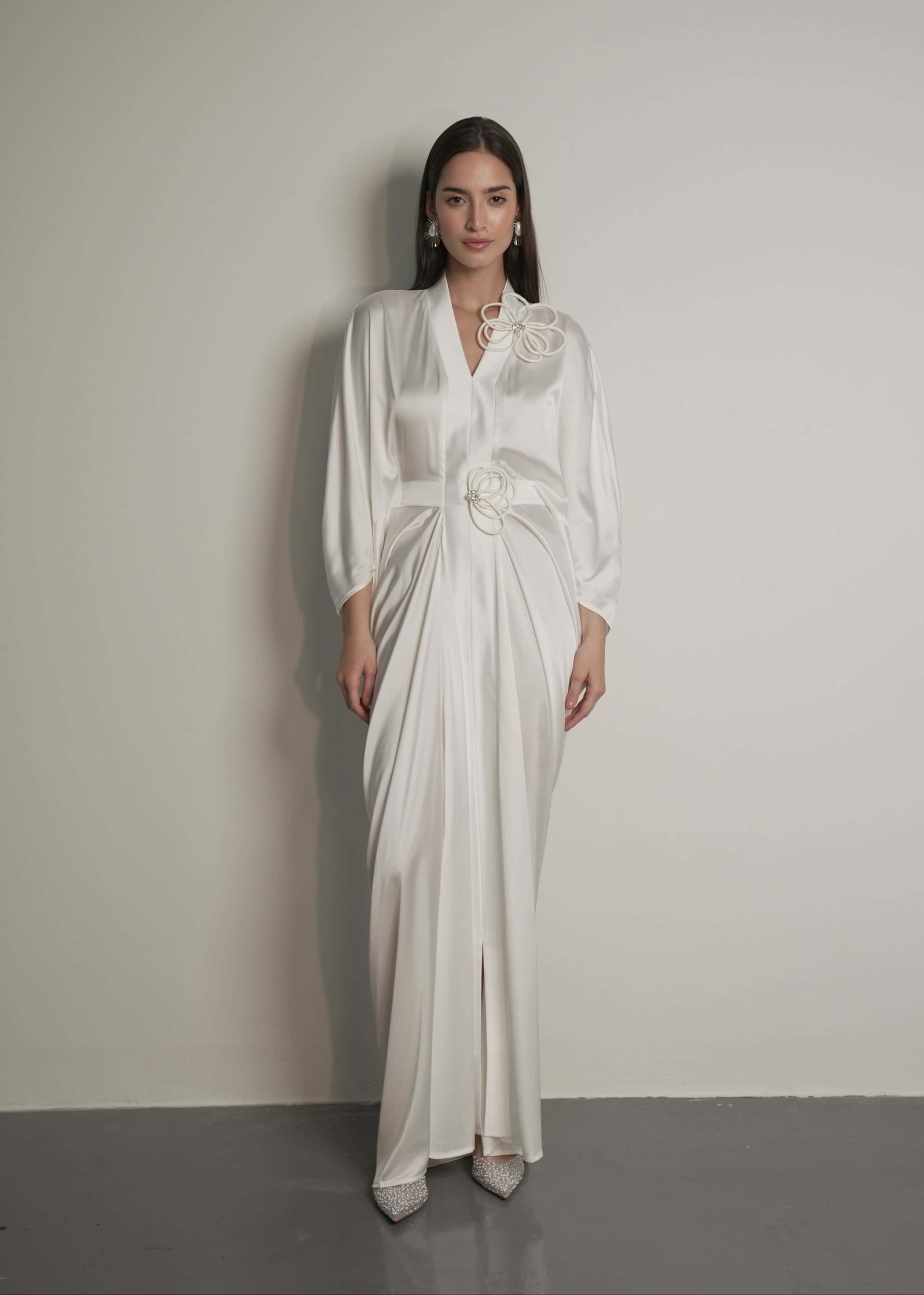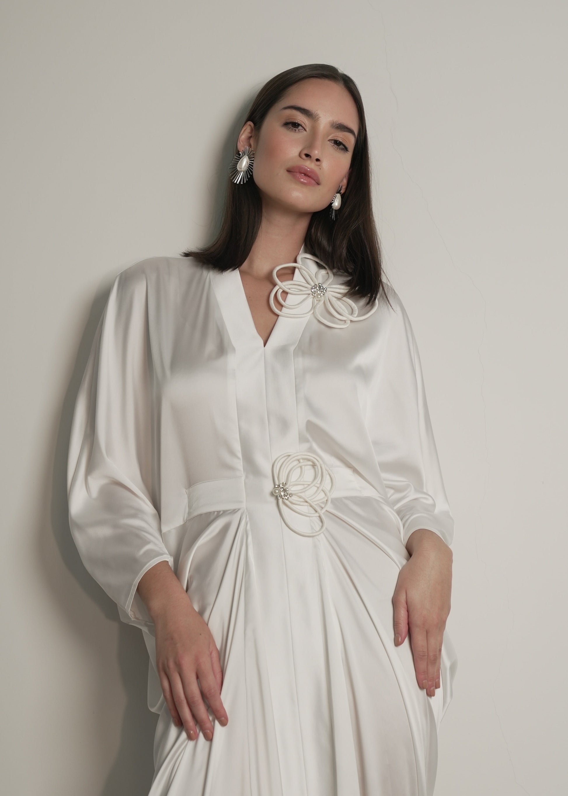 - Design Highlights: Draped silhouette, flowy batwing sleeves, and matching satin belt with floral brooch accents