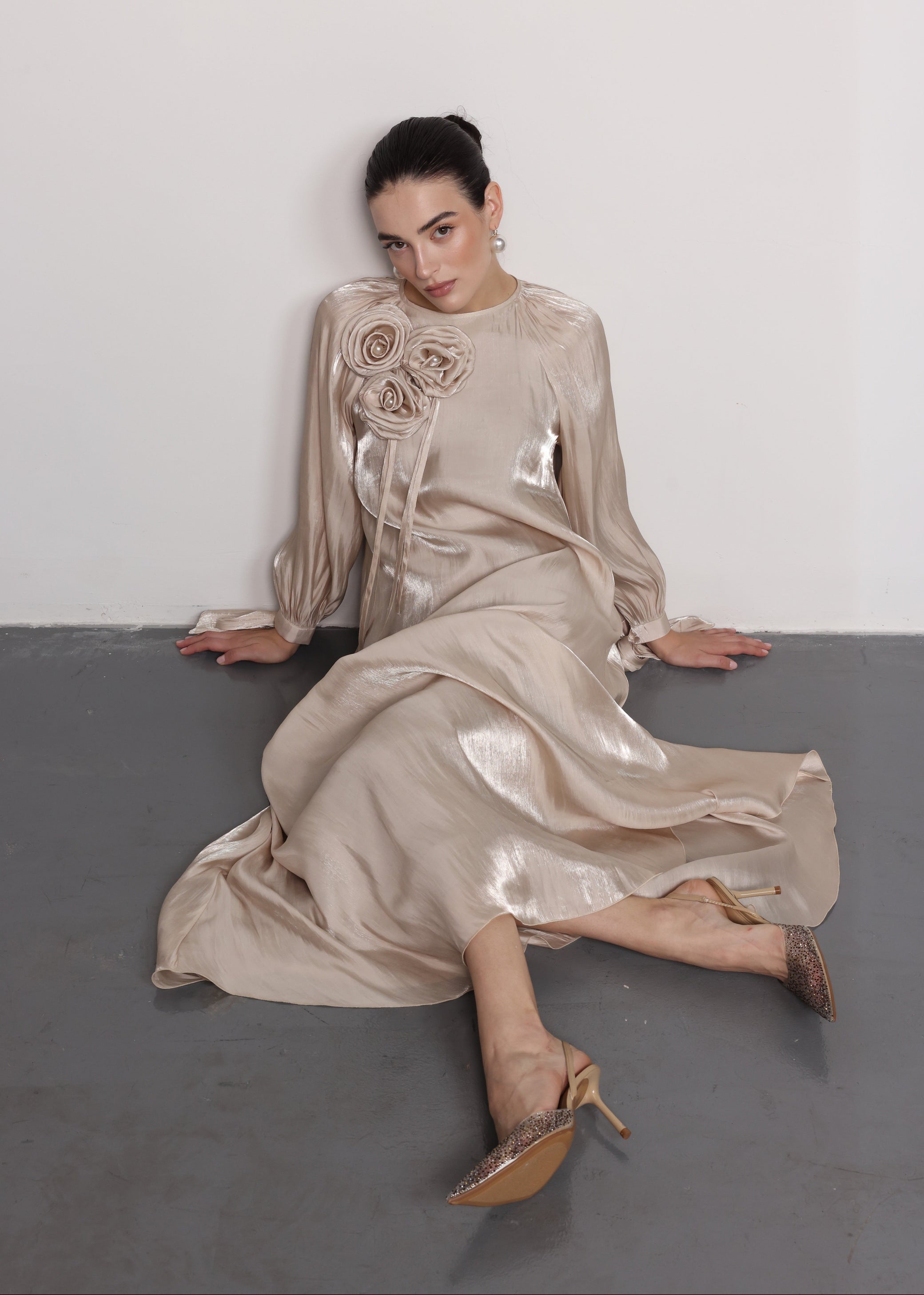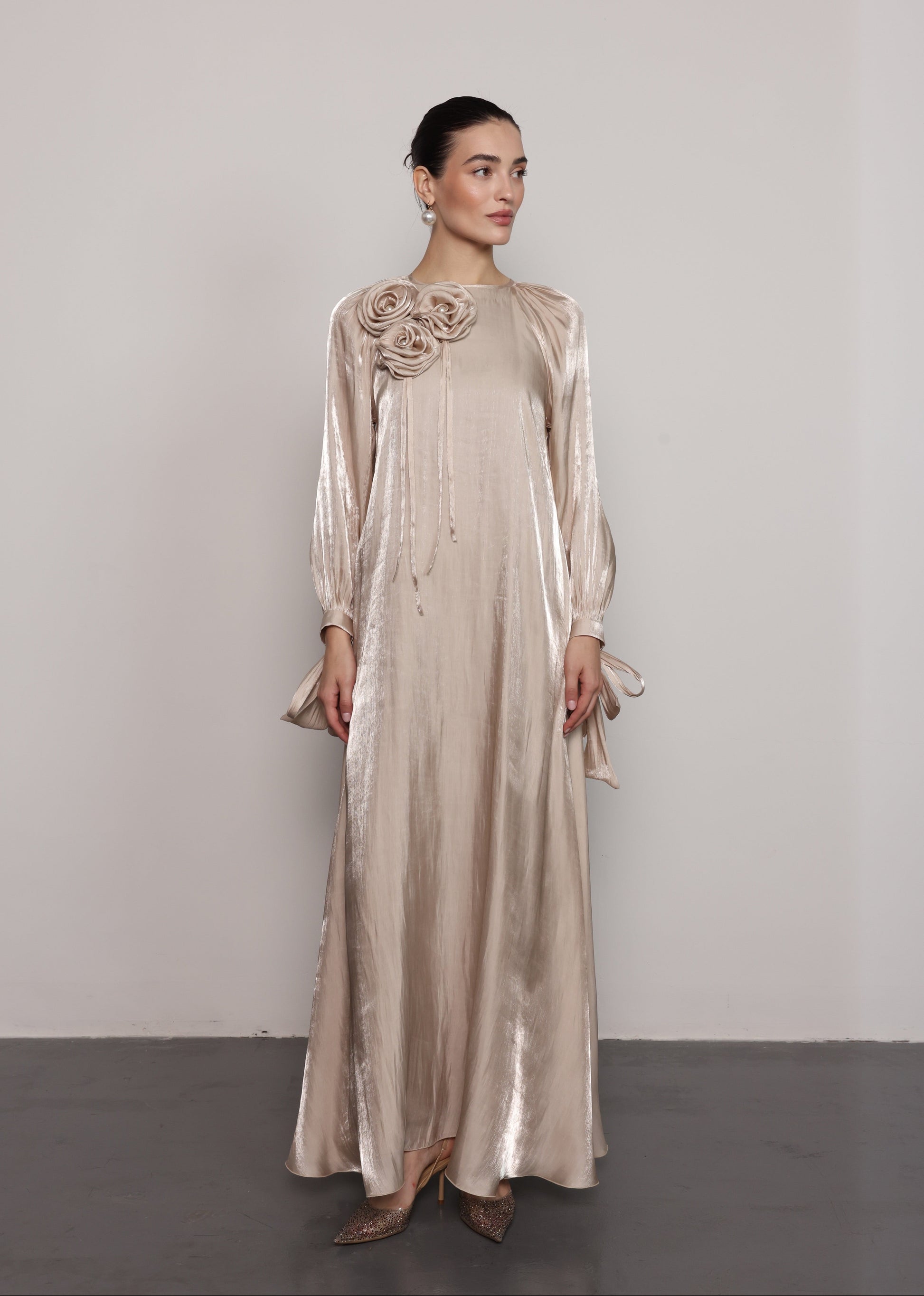 - Design Highlights: Statement roses embellishments and sculpted sleeves for a feminine touch.