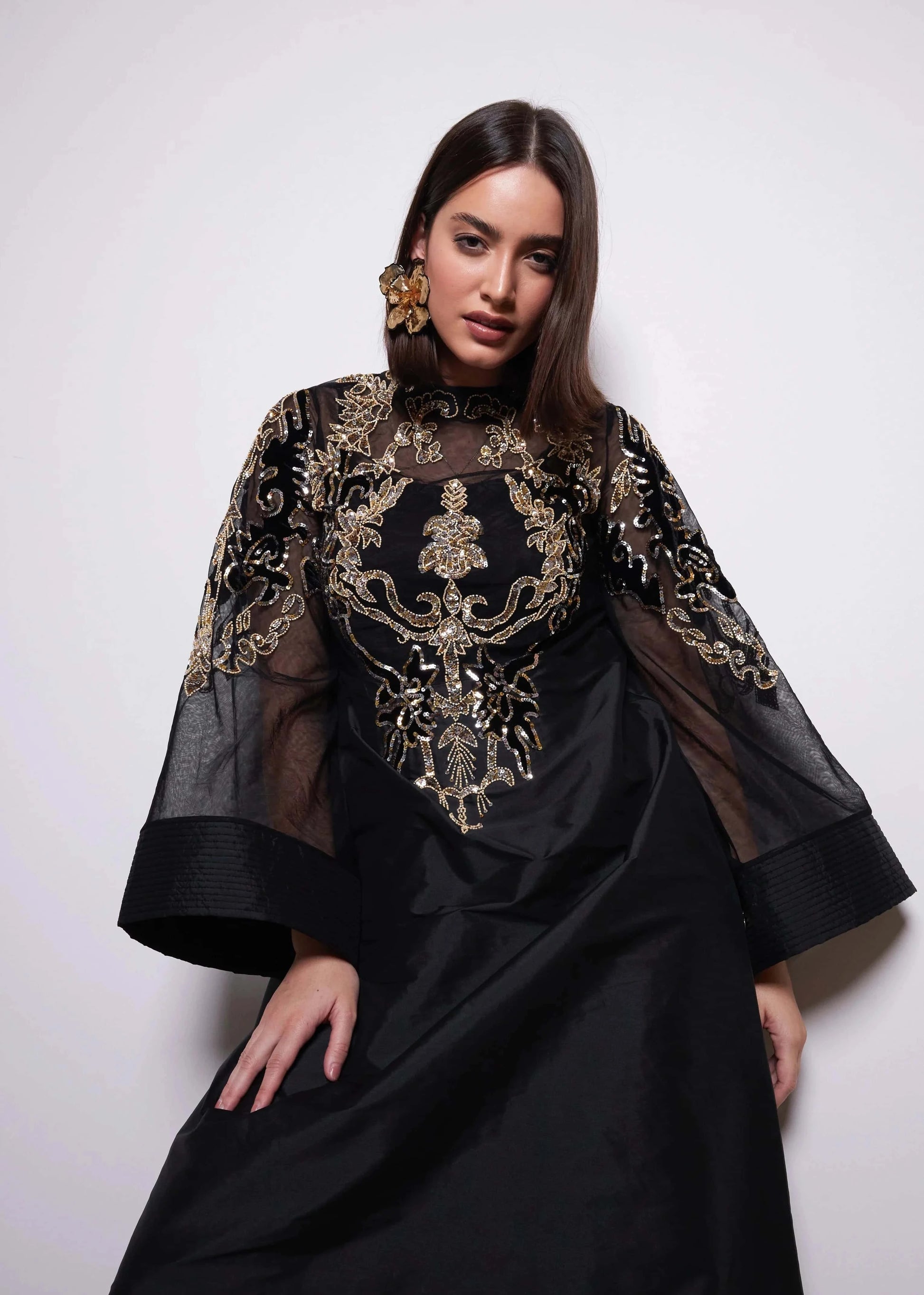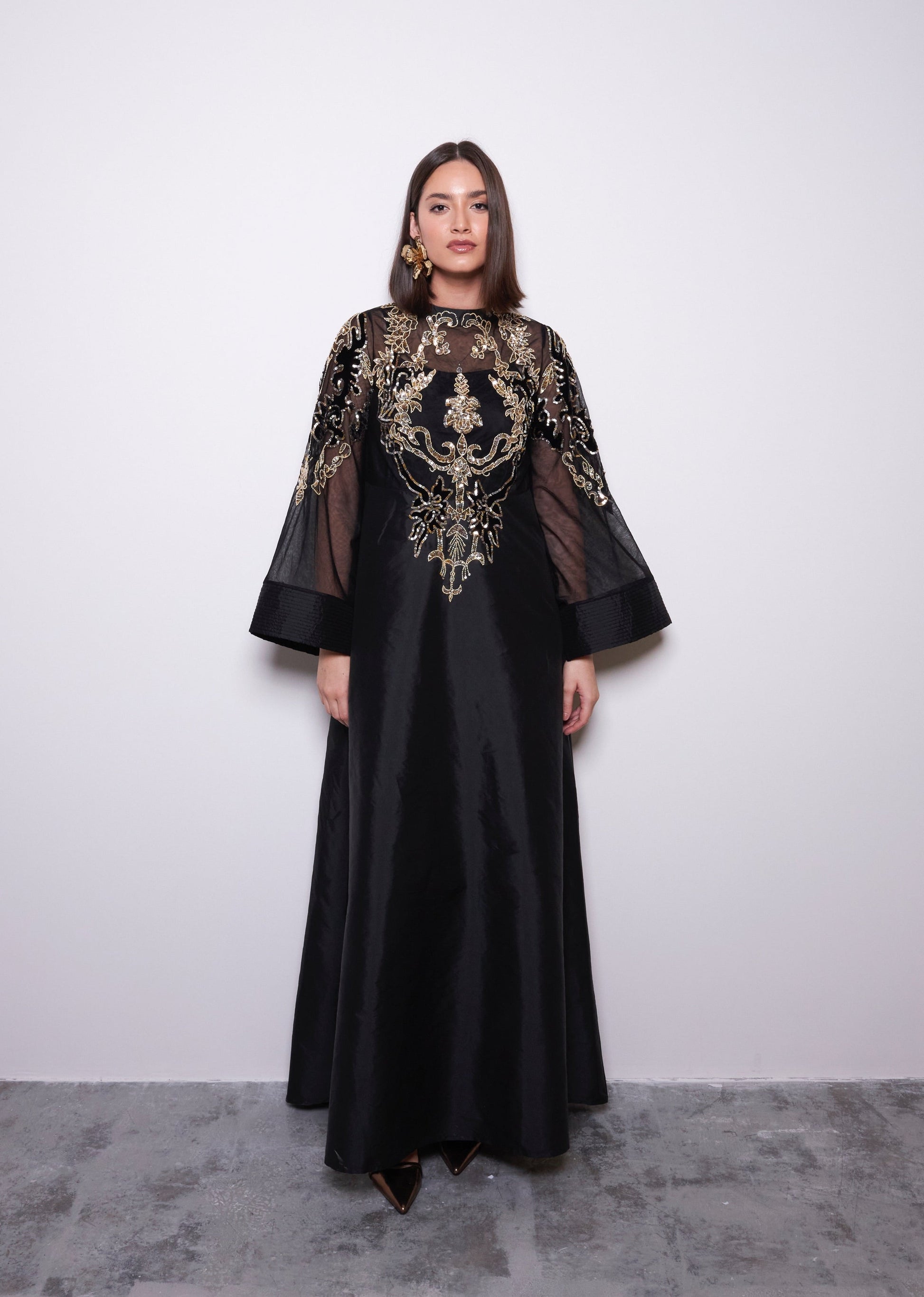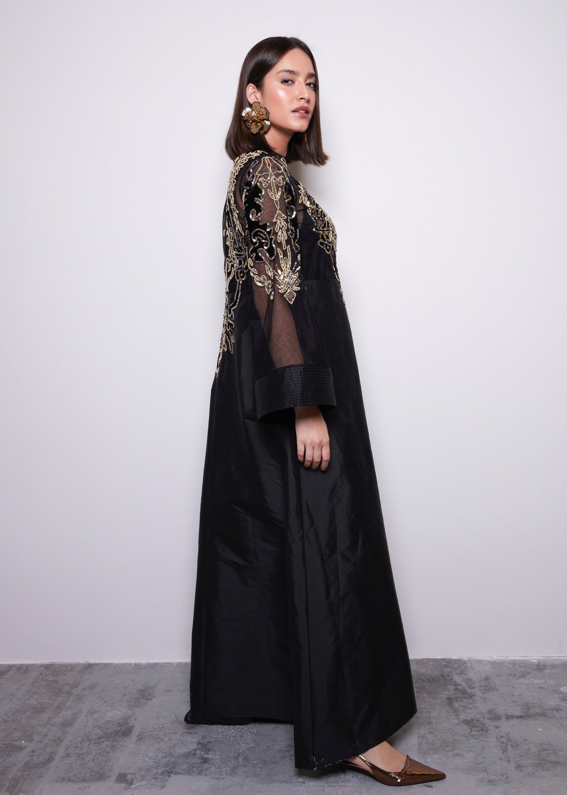 Indulge in refined luxury with the Lady Elly dress, expertly crafted from the finest taffeta fabric for a smooth and lustrous finish. This striking design features intricate hand-embroidery on the front, sleeves, and back, adding an elegant touch to its graceful silhouette.