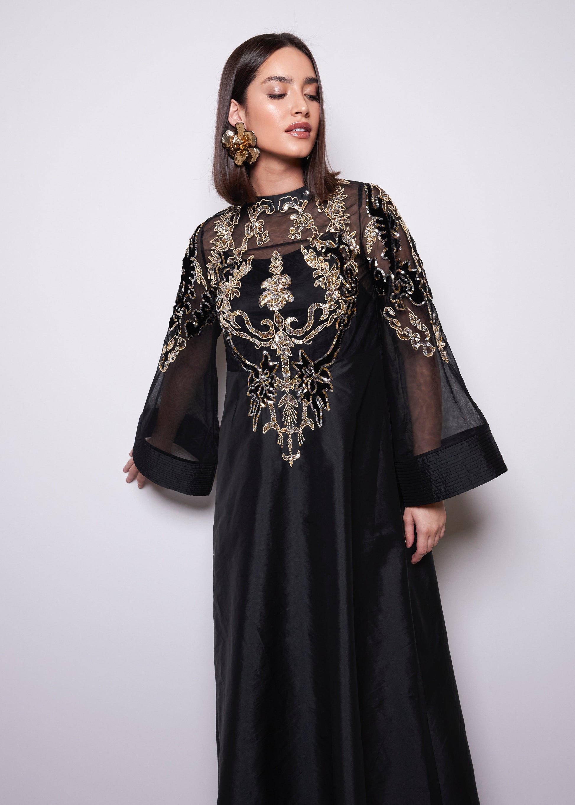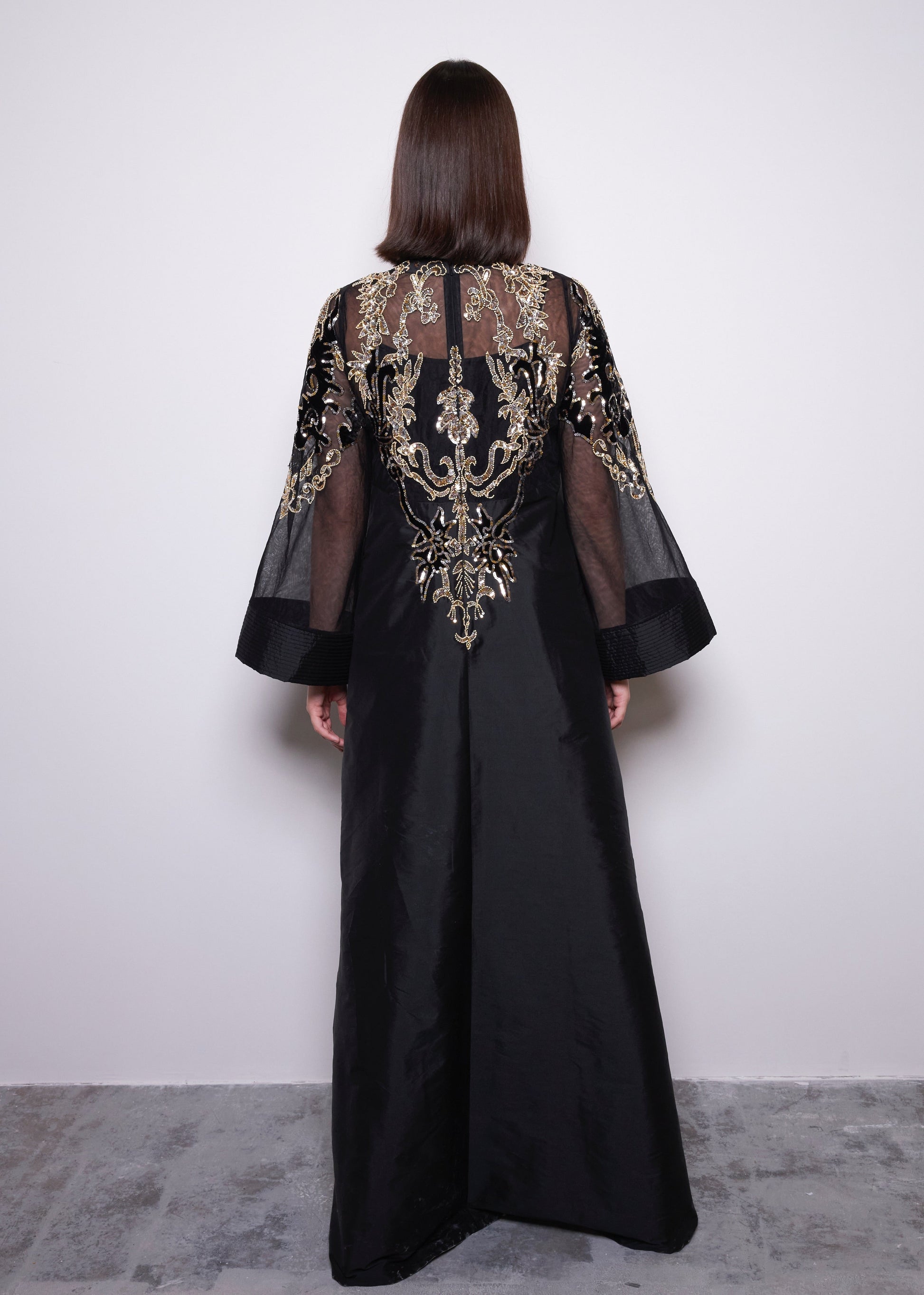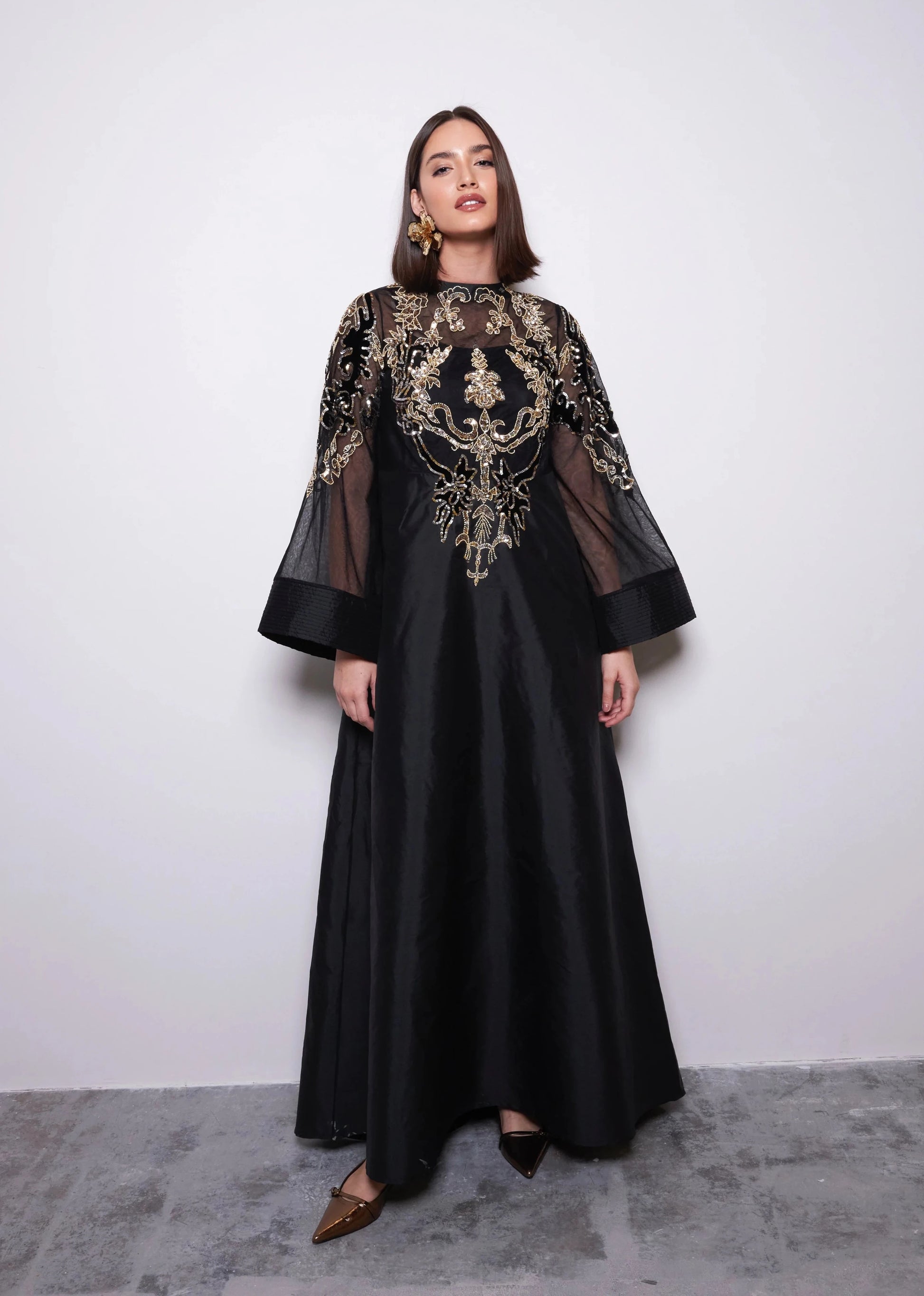 Indulge in refined luxury with the Lady Elly dress, expertly crafted from the finest taffeta fabric for a smooth and lustrous finish. This striking design features intricate hand-embroidery on the front, sleeves, and back, adding an elegant touch to its graceful silhouette.