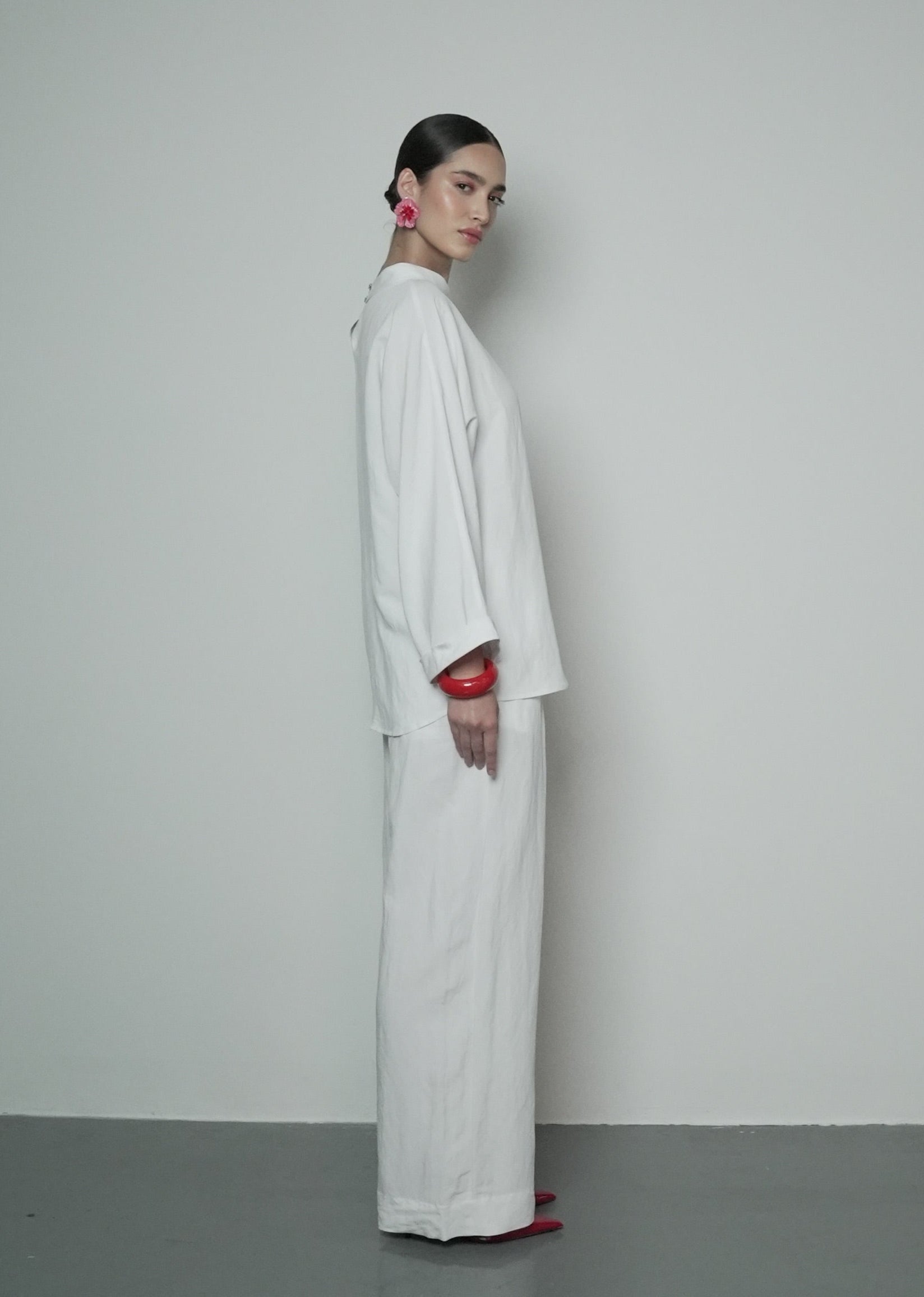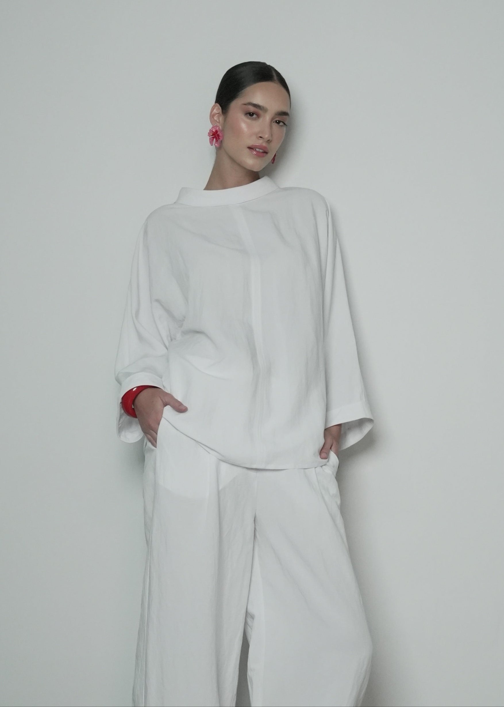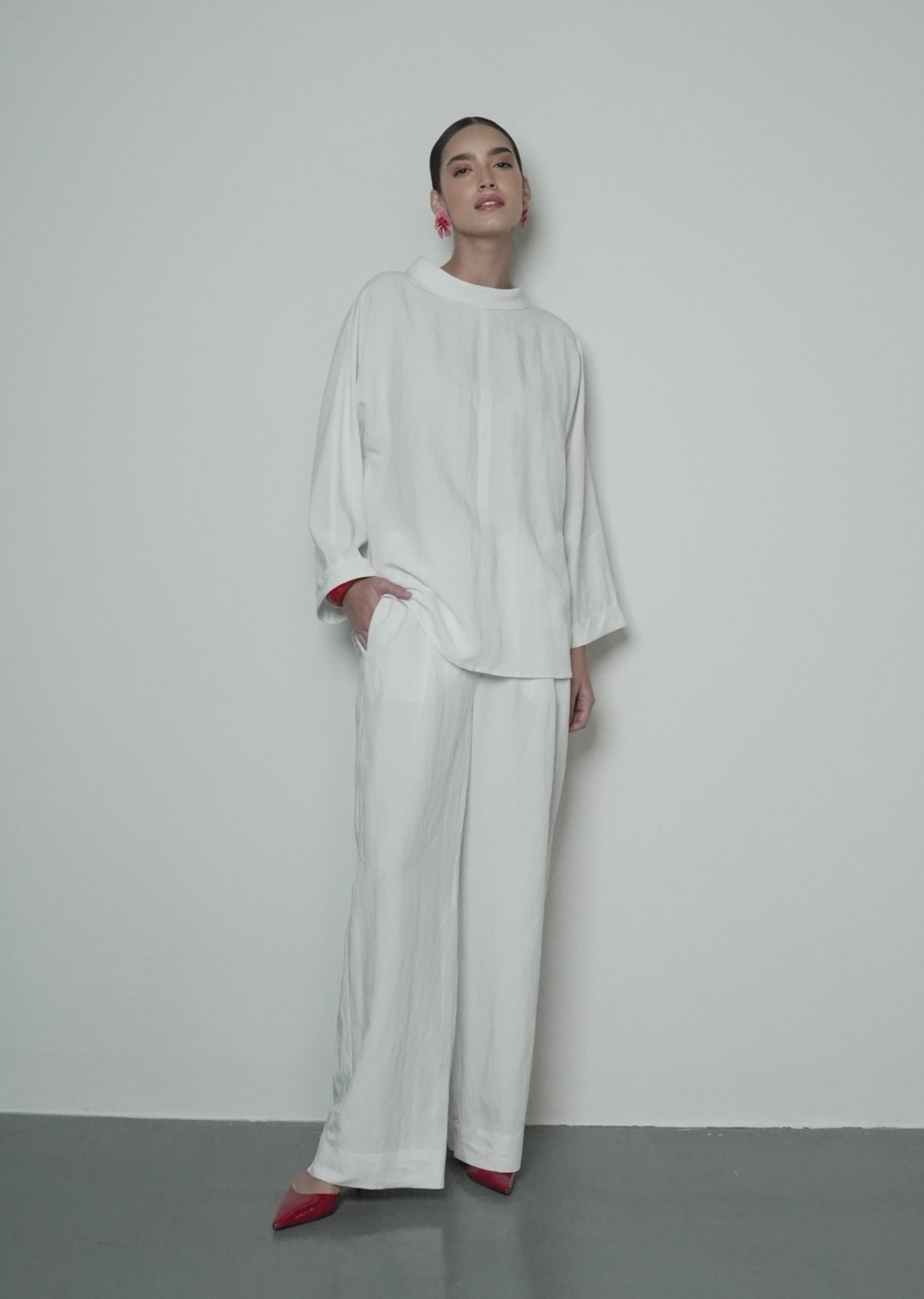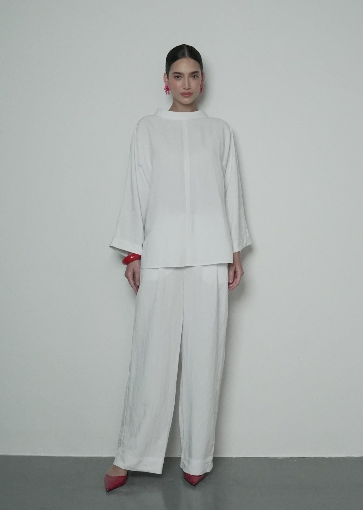 Introduce a touch of serene sophistication to your wardrobe with our Lana Set, crafted entirely from breathable linen fabric. This beautifully coordinated ensemble features a high-neck, relaxed-fit top with elegant bell sleeves, perfectly paired with comfortable wide-leg trousers. Designed for a fluid silhouette, the Lana Set offers both effortless style and ultimate comfort for a refined look.