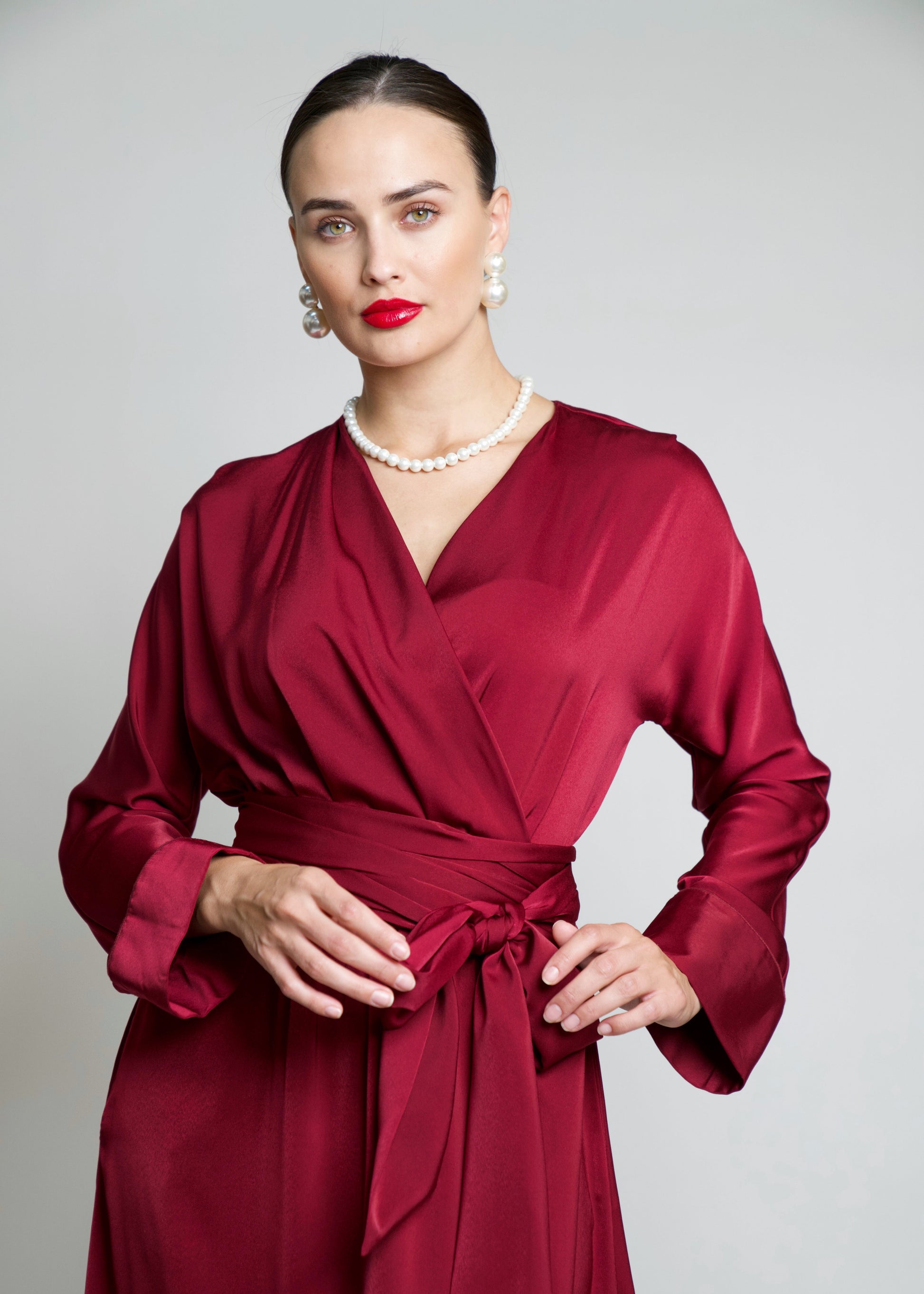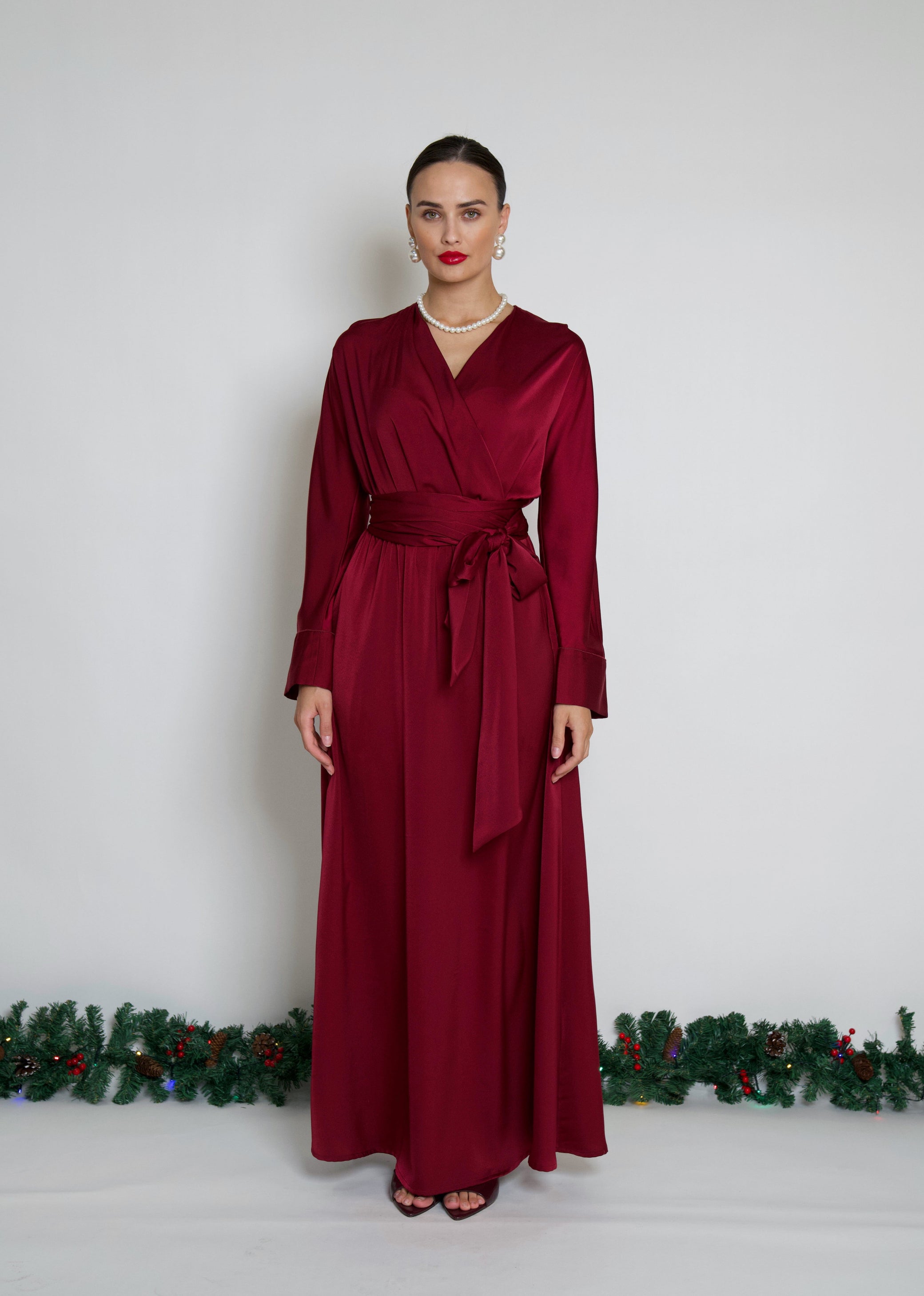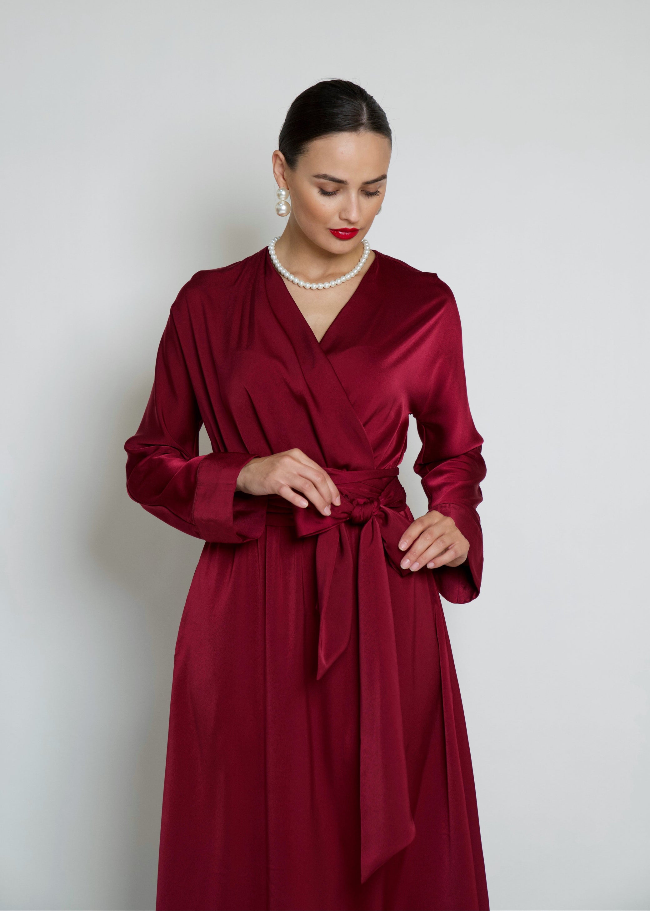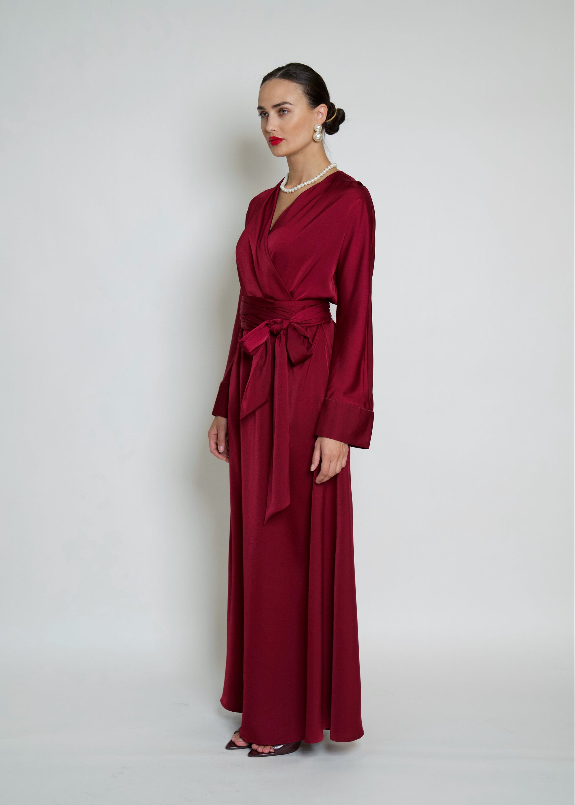 The Mayra is designed to flatter with effortless elegance. Crafted from a softly flowing fabric, it features a classic wrap-style bodice with a deep V-neckline that creates a refined silhouette. The long sleeves add sophistication, while the adjustable self-tie waist belt cinches the figure for a tailored yet comfortable fit.