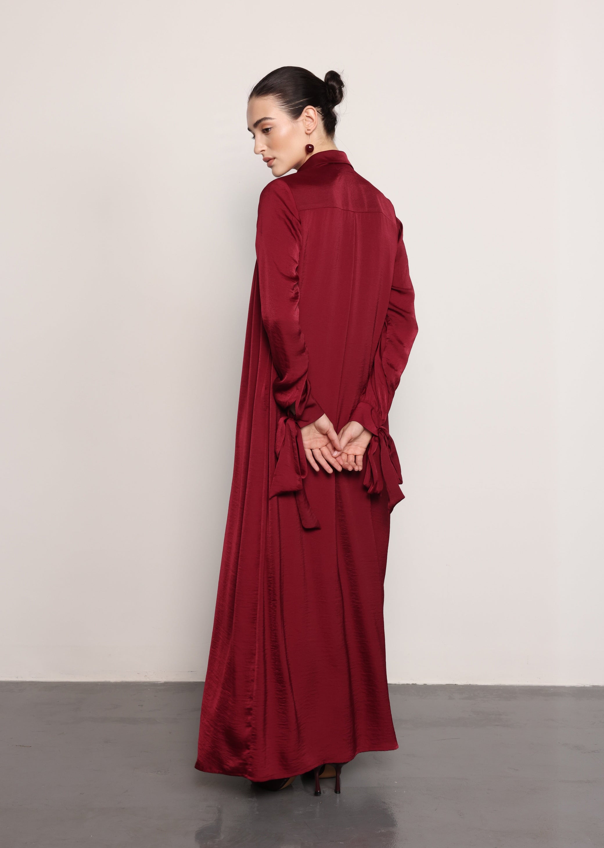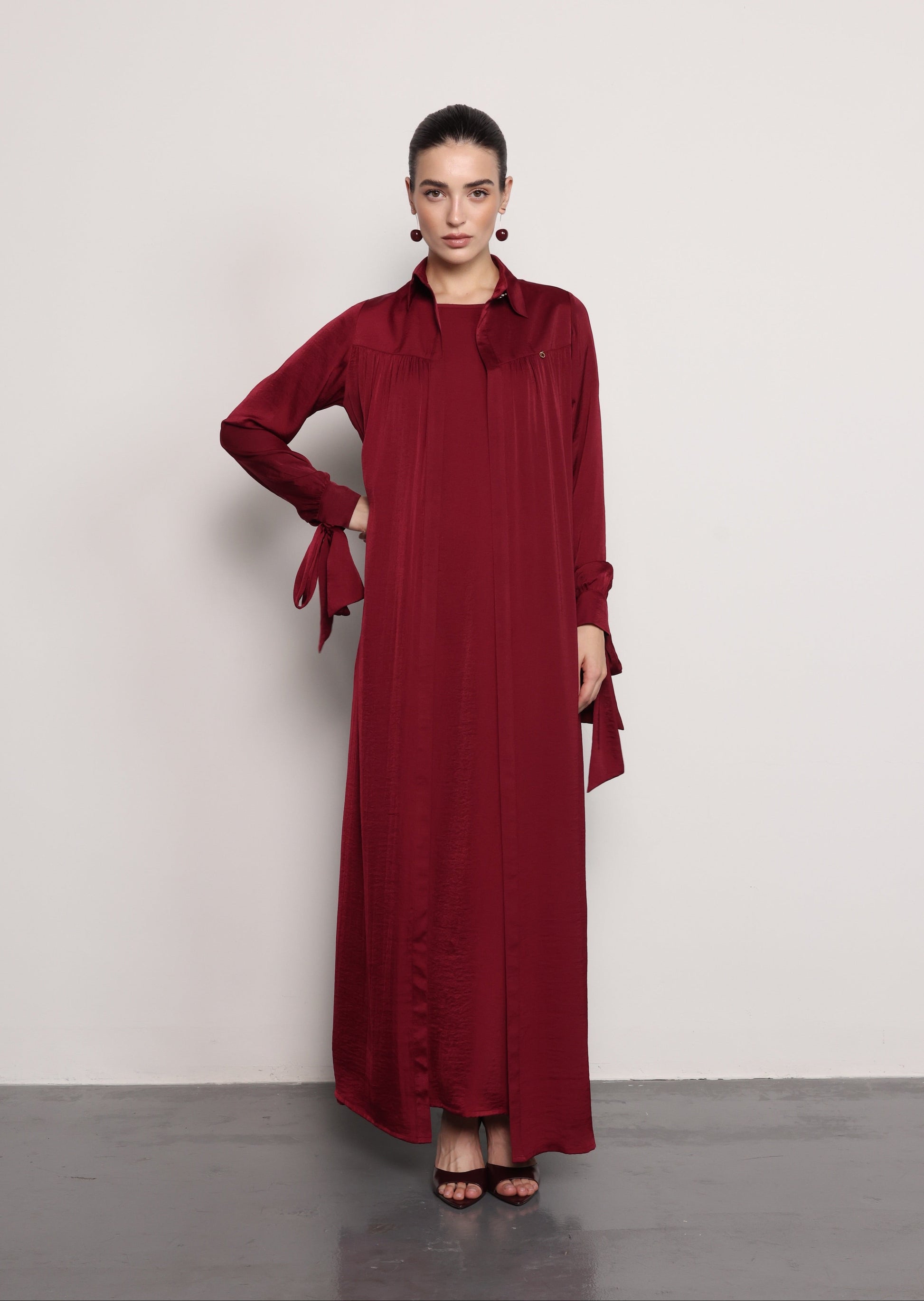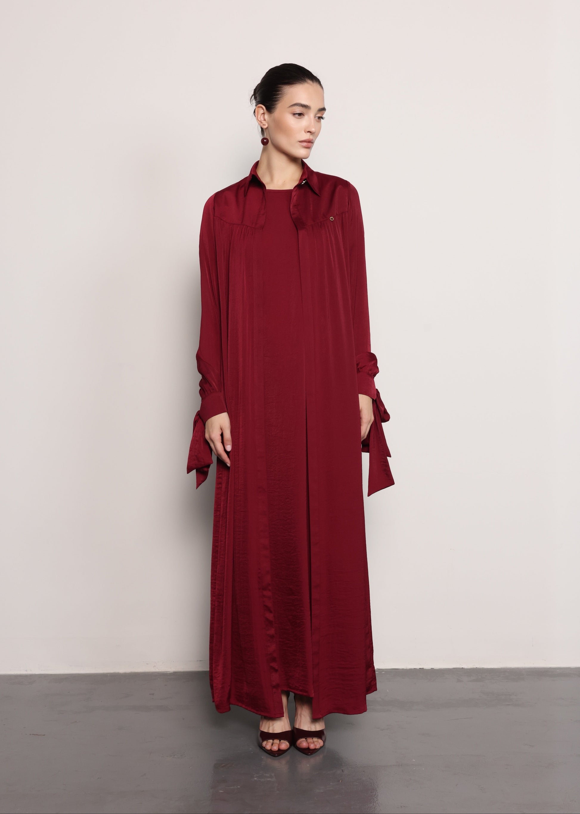 Crafted in Crêpe Céline Mix fabric, this elegant set features a minimalist base dress layered with a flowing outer piece for a refined and contemporary silhouette. The clean lines of the inner dress are complemented by subtle pleated detailing on the upper front, while the outer layer is finished with tie details at the sleeves, adding a modern feminine touch.