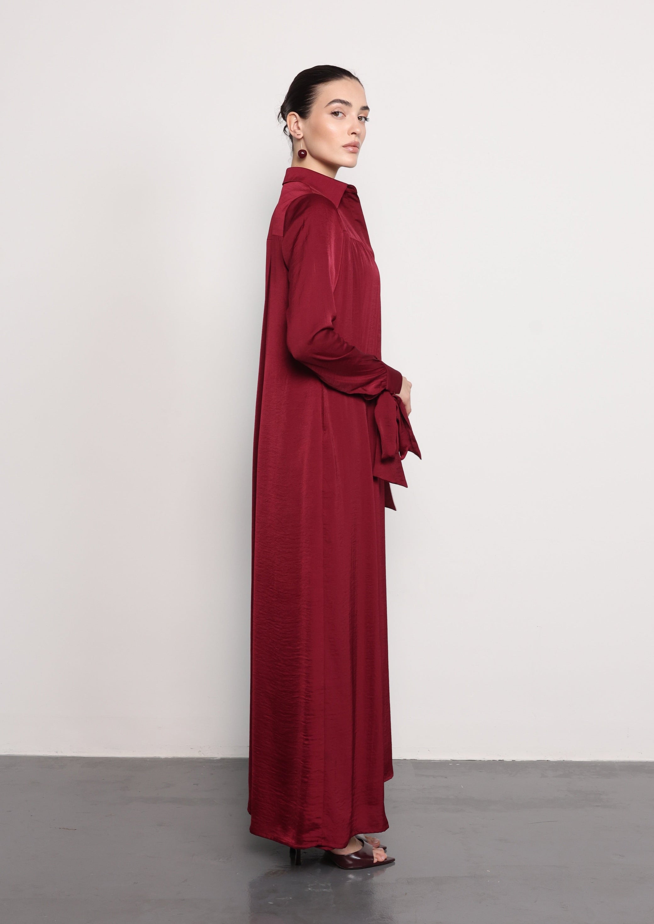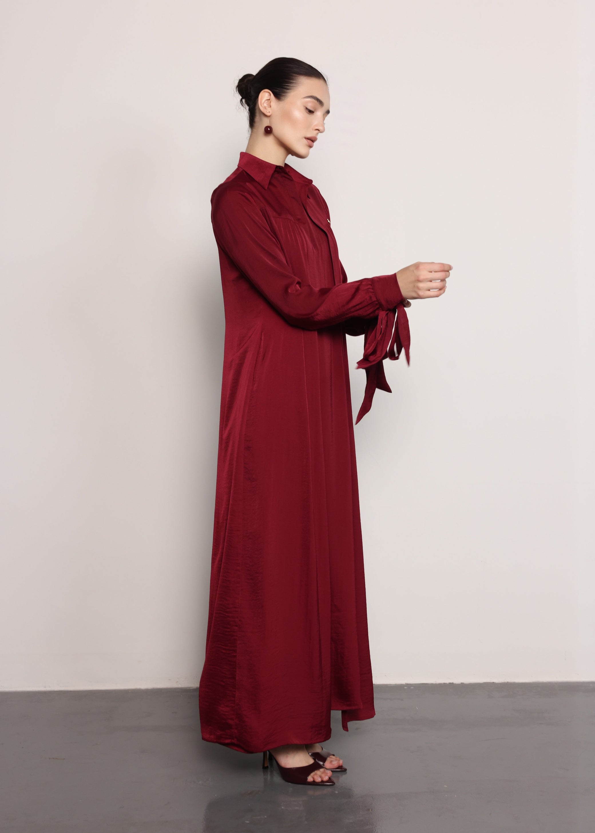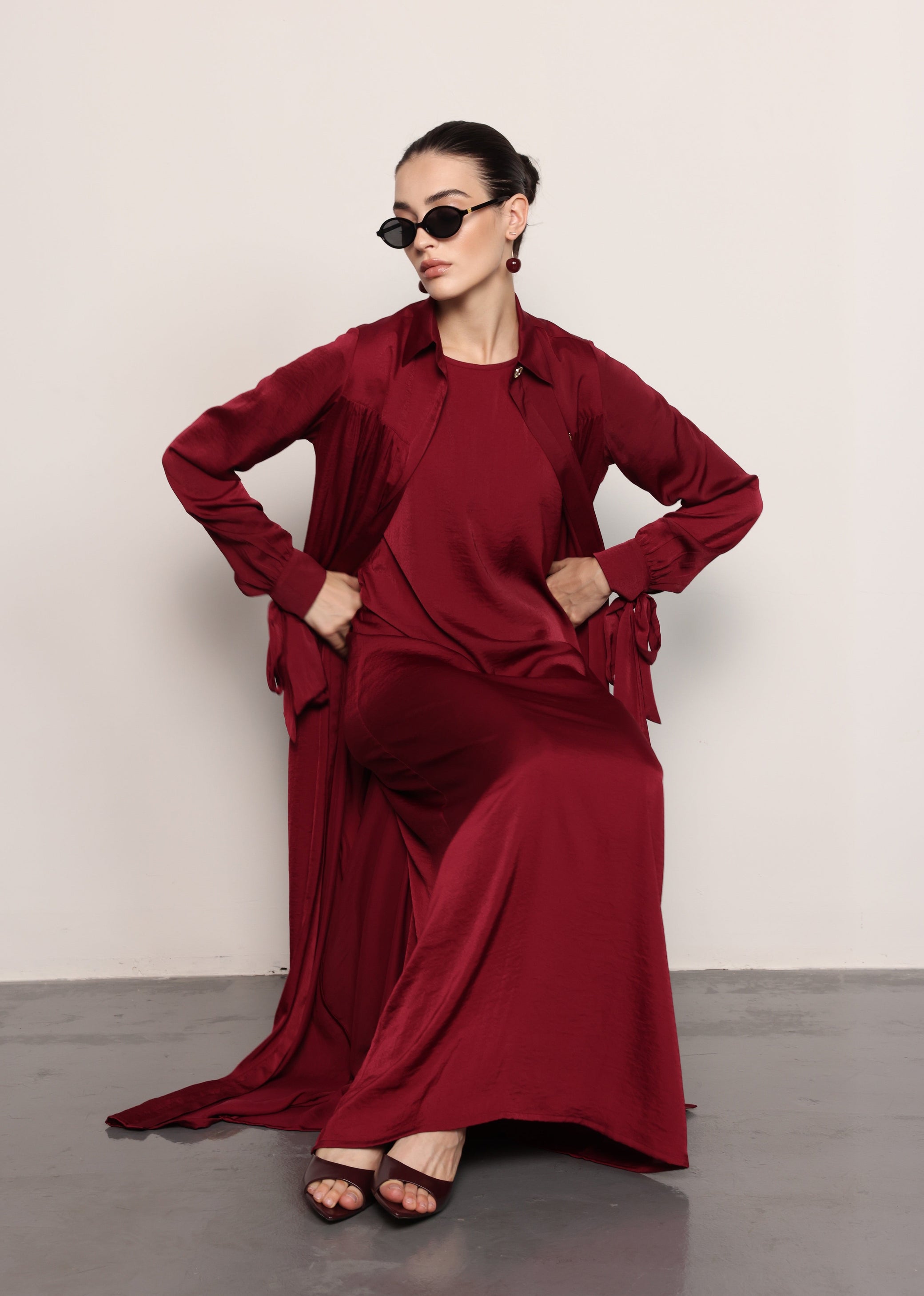 Crafted in Crêpe Céline Mix fabric, this elegant set features a minimalist base dress layered with a flowing outer piece for a refined and contemporary silhouette. The clean lines of the inner dress are complemented by subtle pleated detailing on the upper front, while the outer layer is finished with tie details at the sleeves, adding a modern feminine touch.
