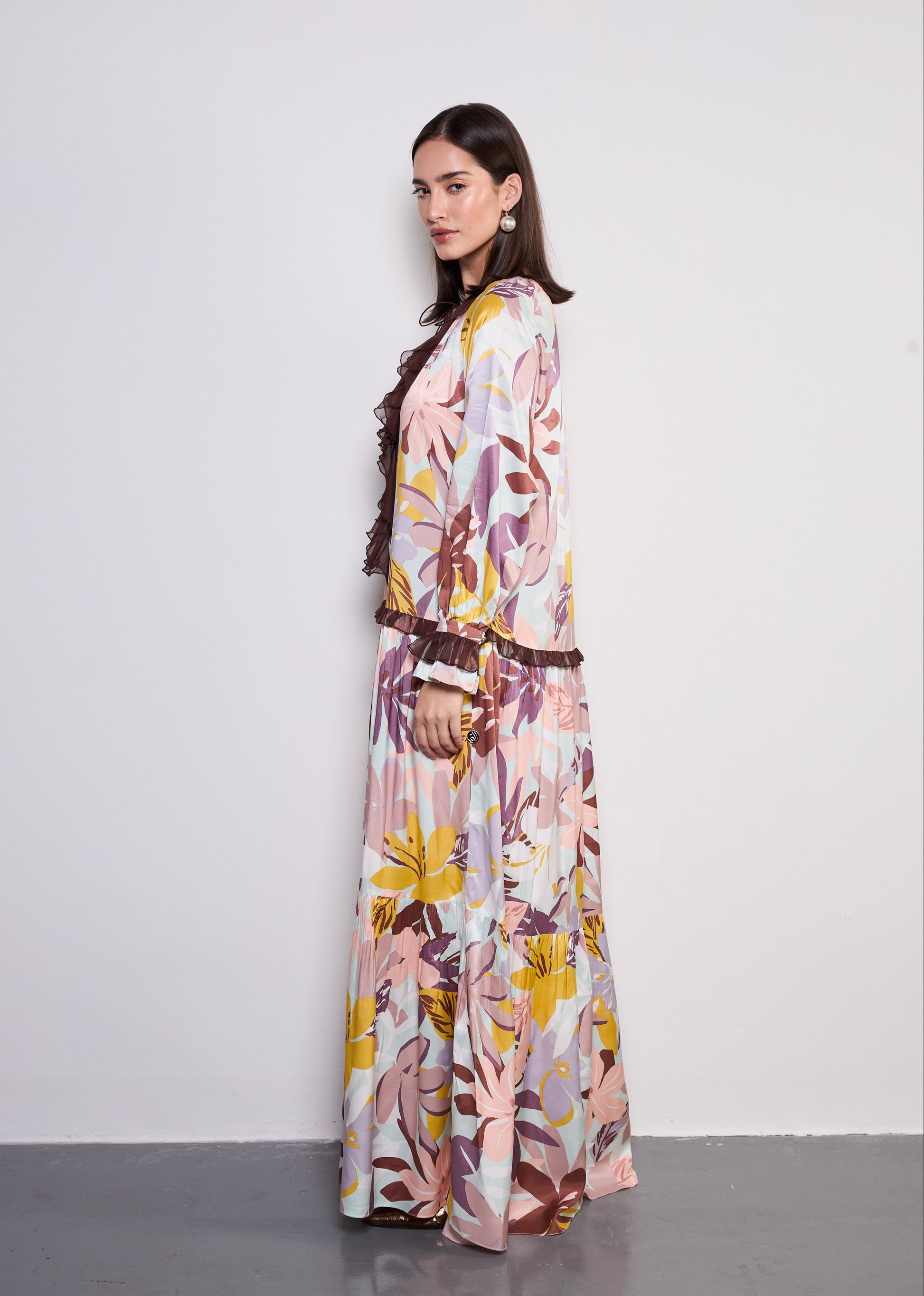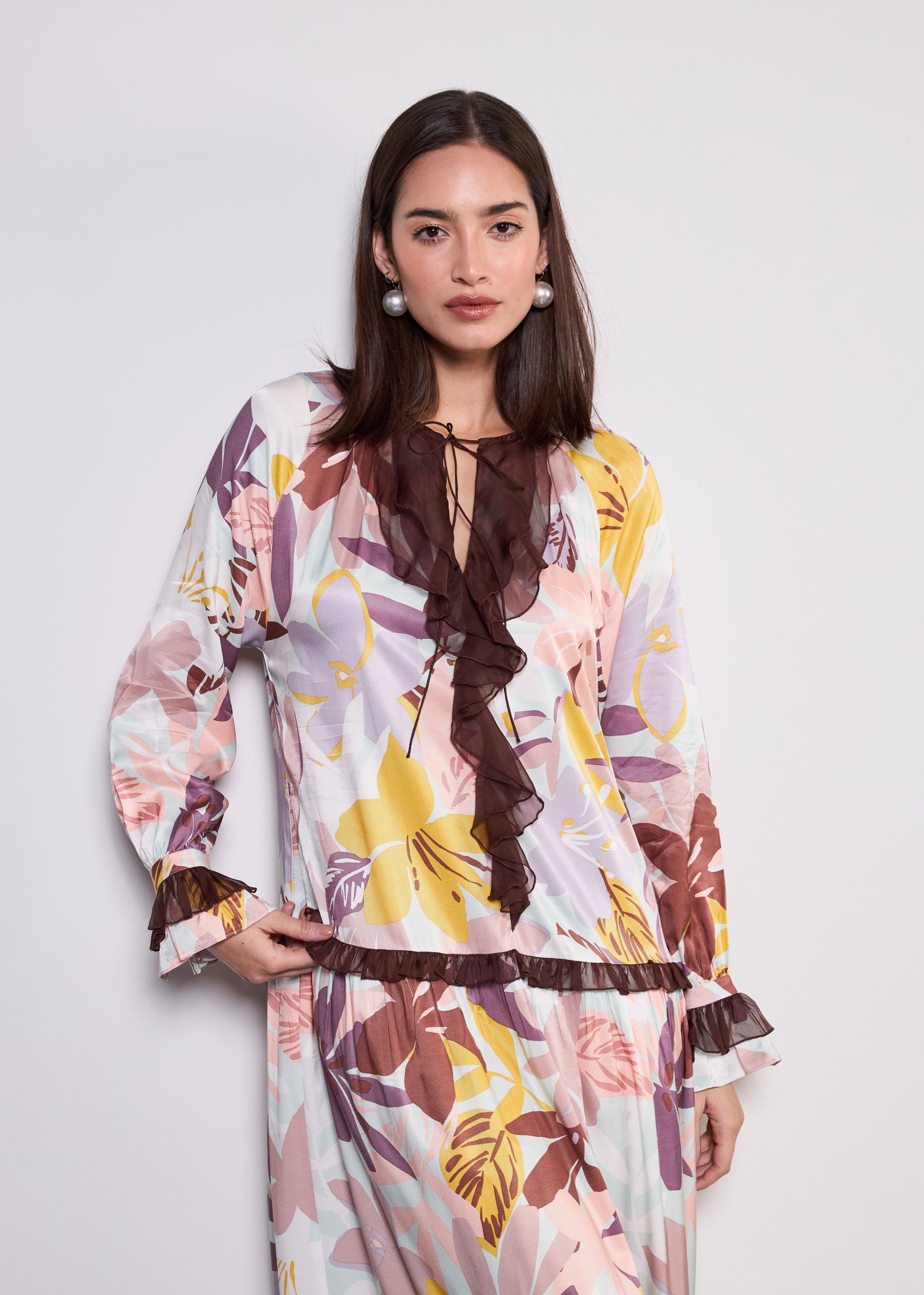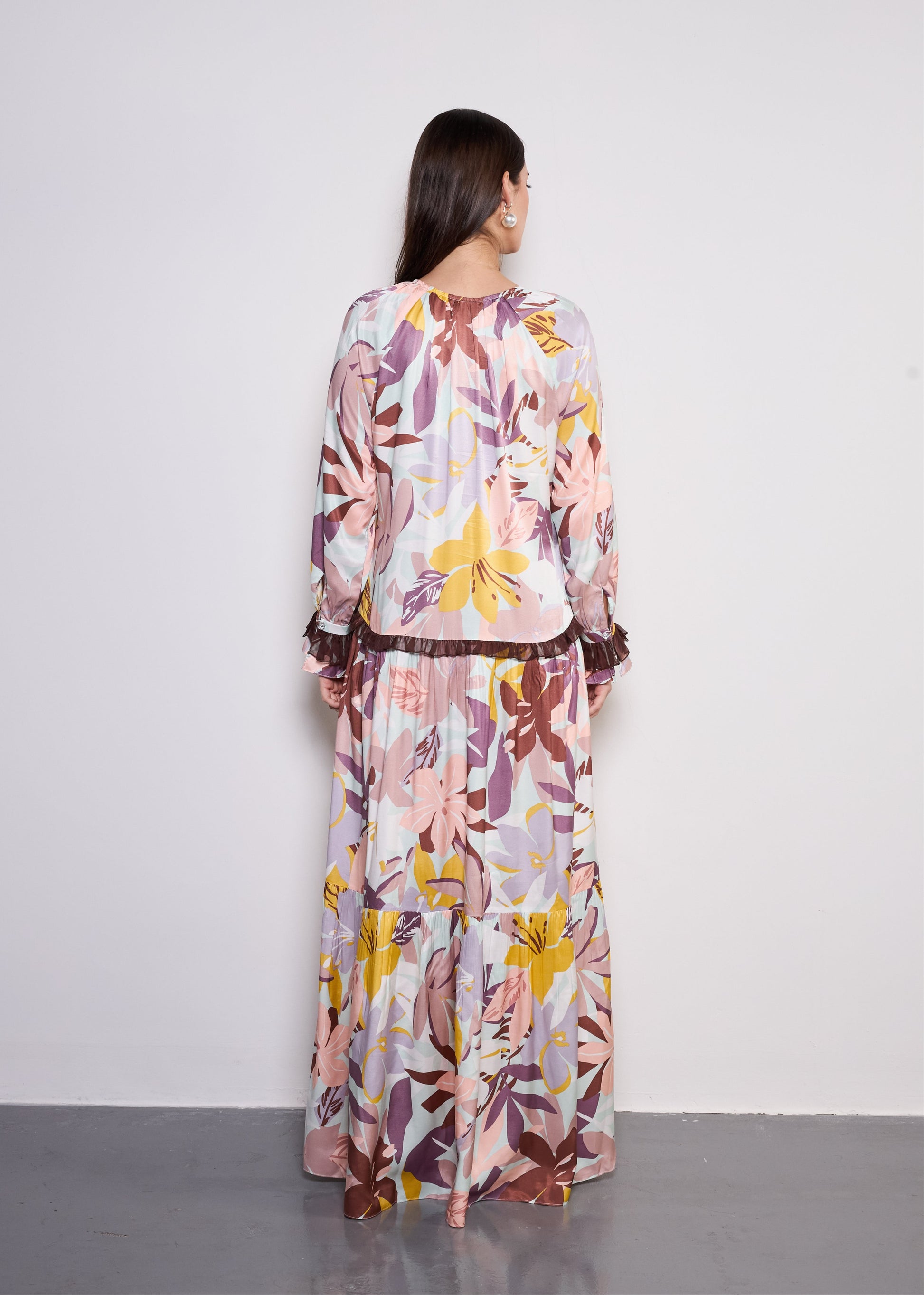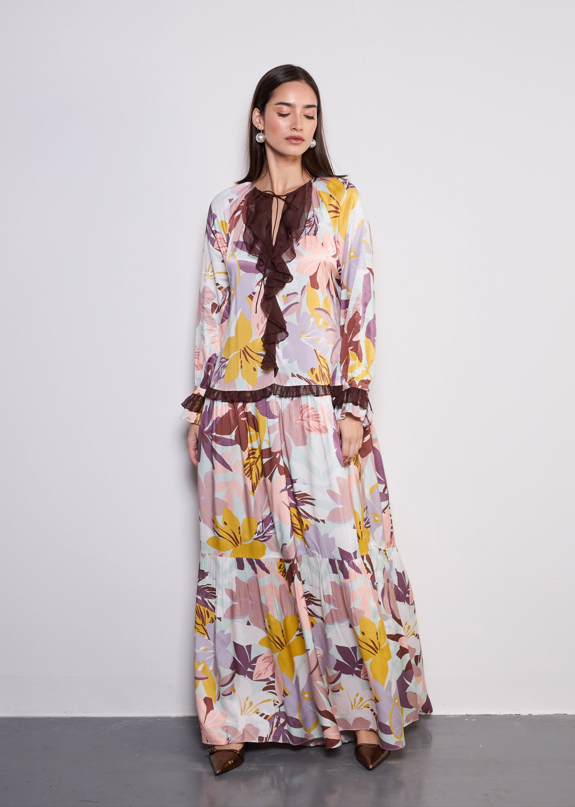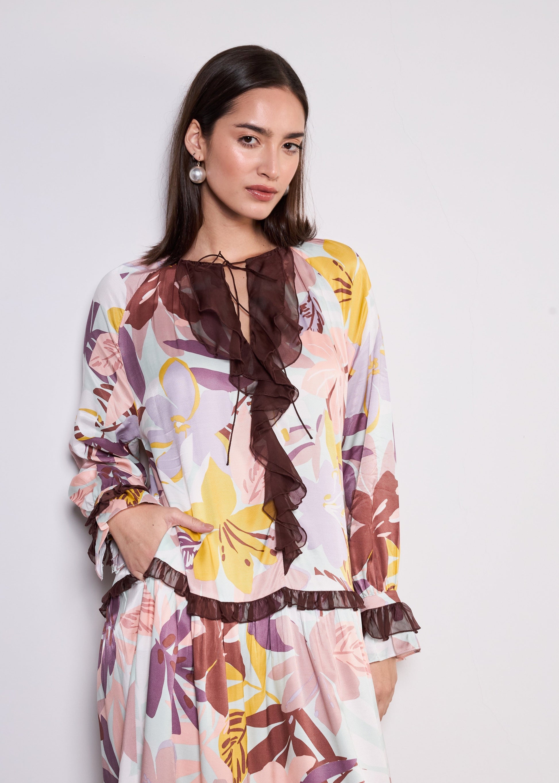 - Colors: Multicolor floral print with burgundy ruffle accents
