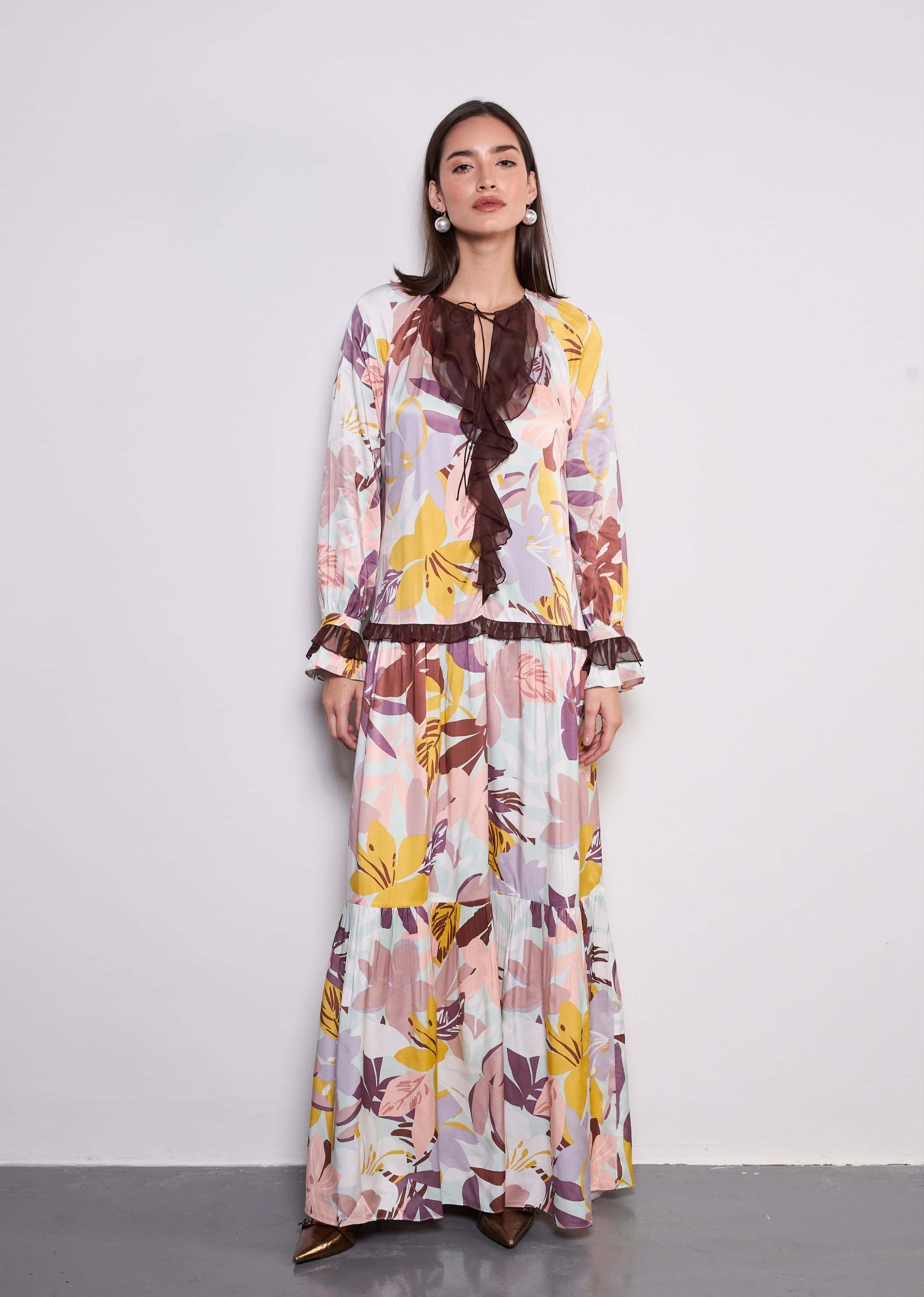 - Design Highlights: Sheer ruffled V-neckline, flared cuffs, and tiered skirt for graceful flow