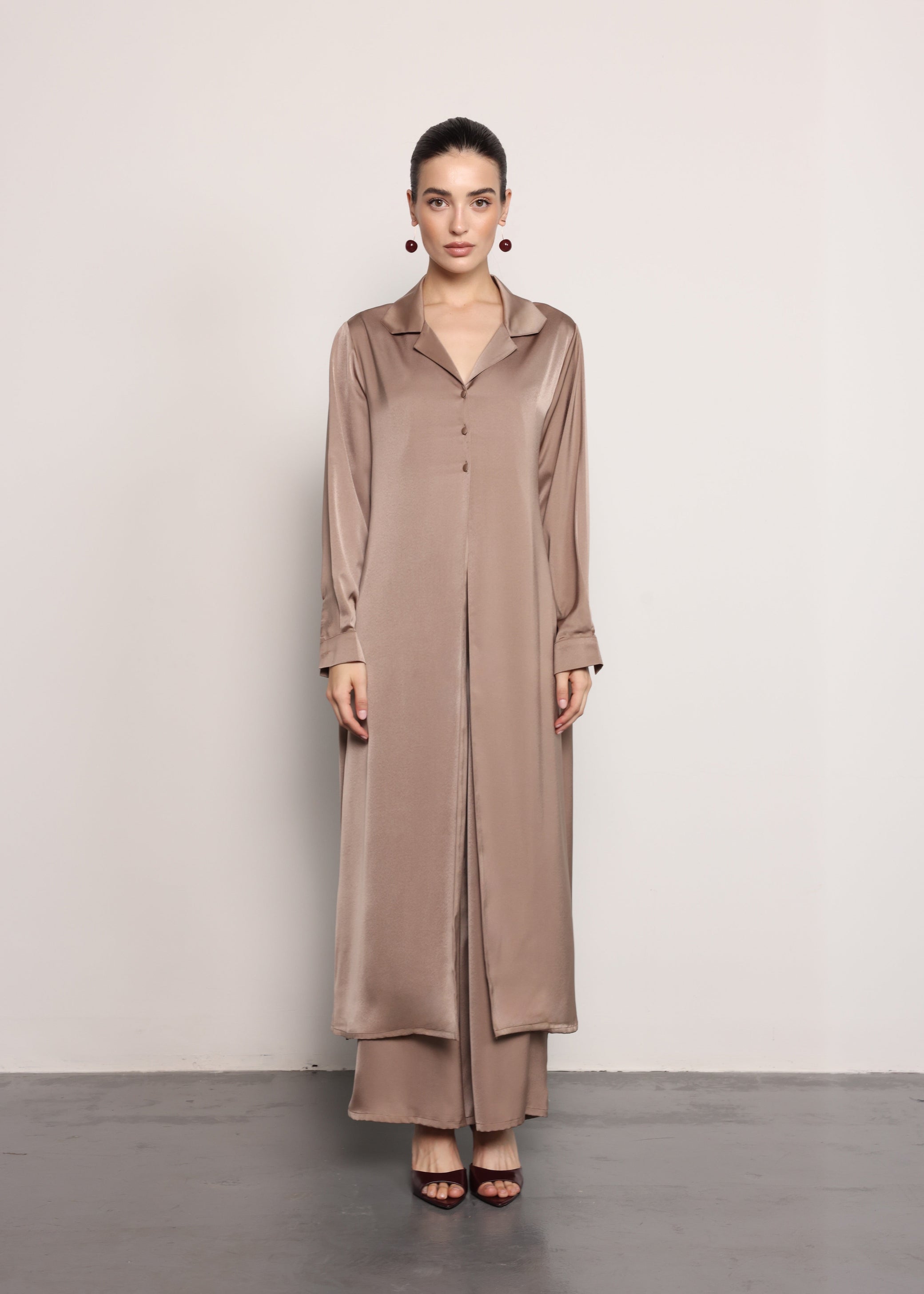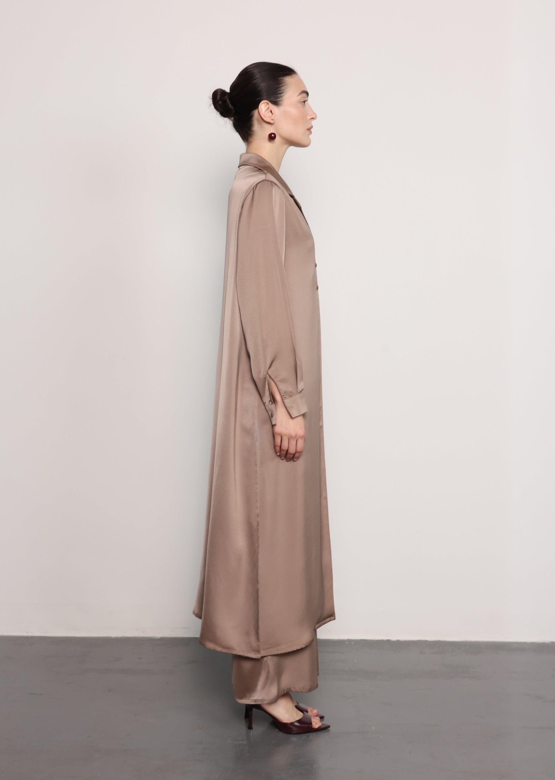 Crafted in a soft mulberry satin fabric, this elegant two-piece set features a long, fluid shirt layered over wide-leg trousers. The relaxed silhouette and subtle sheen offer a sophisticated yet effortless aesthetic, making it a versatile option for refined everyday wear or elevated occasions.