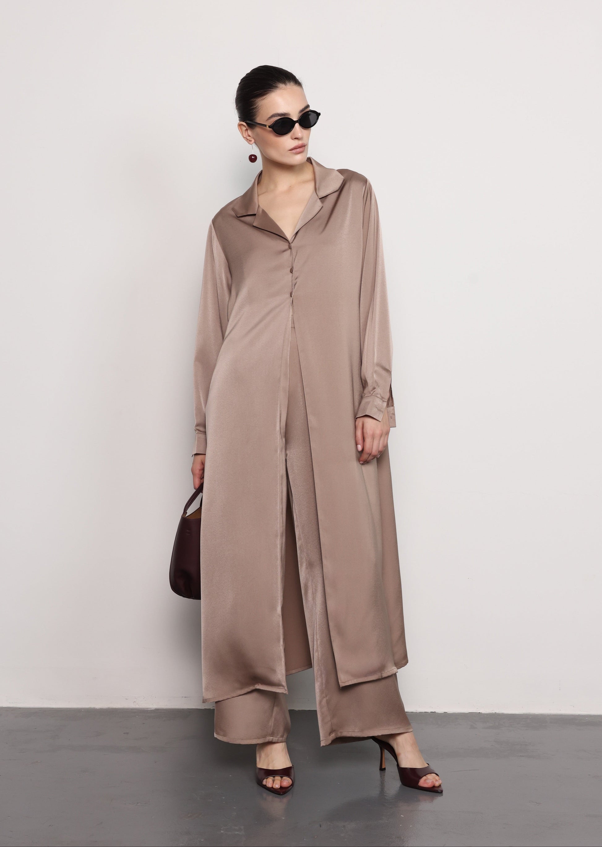- Design Highlights: Two-piece set, Long flowing shirt, Wide-leg trousers, Relaxed fit, Satin finish