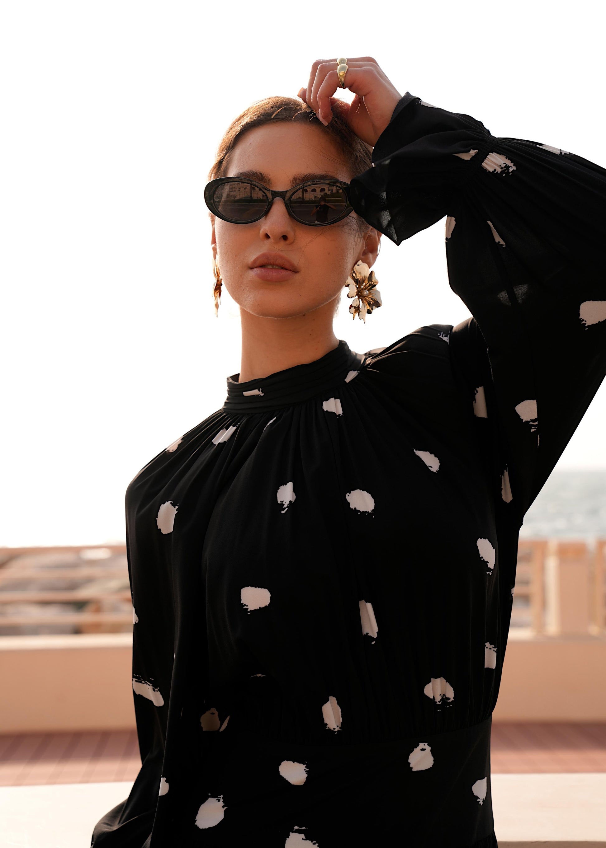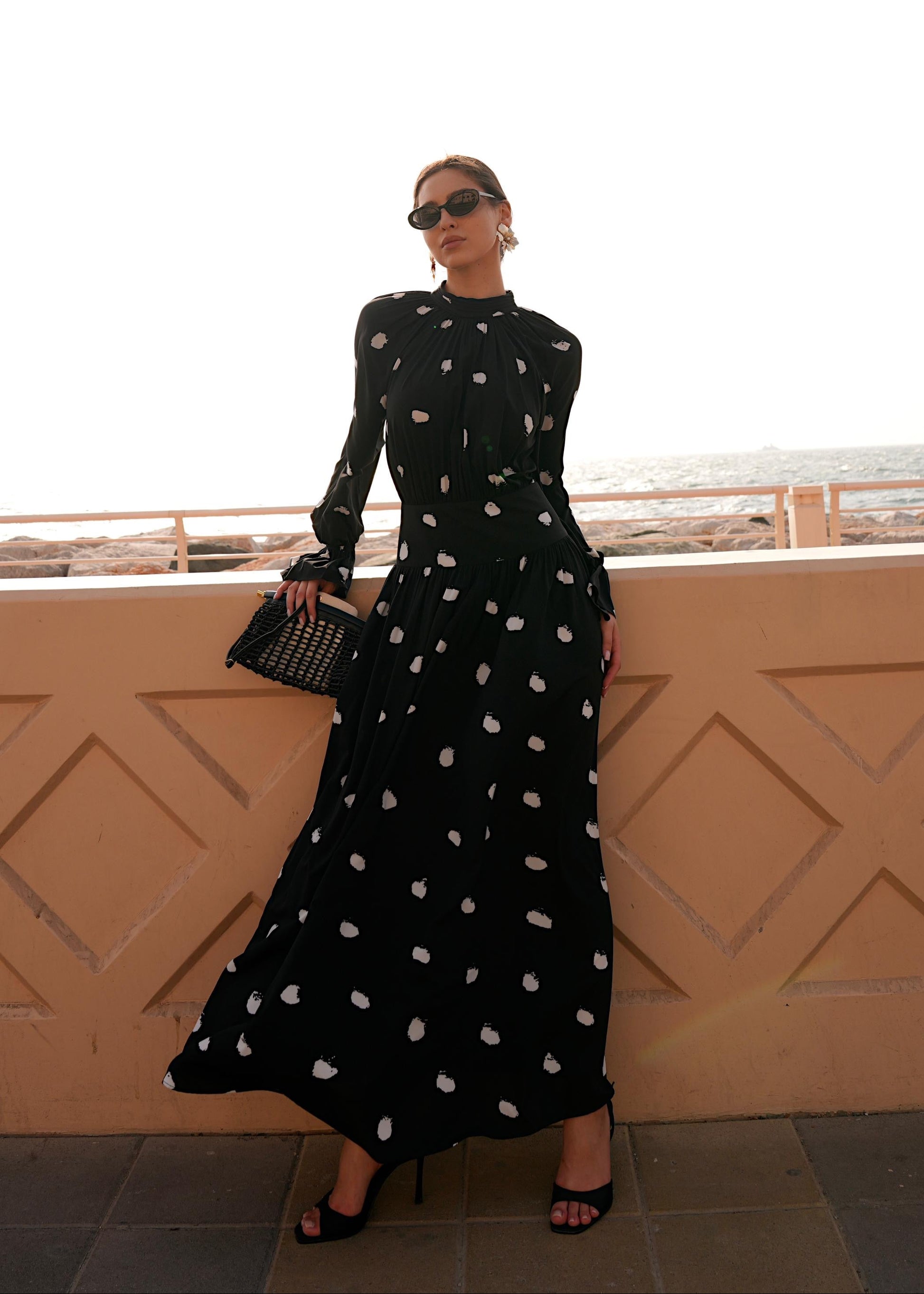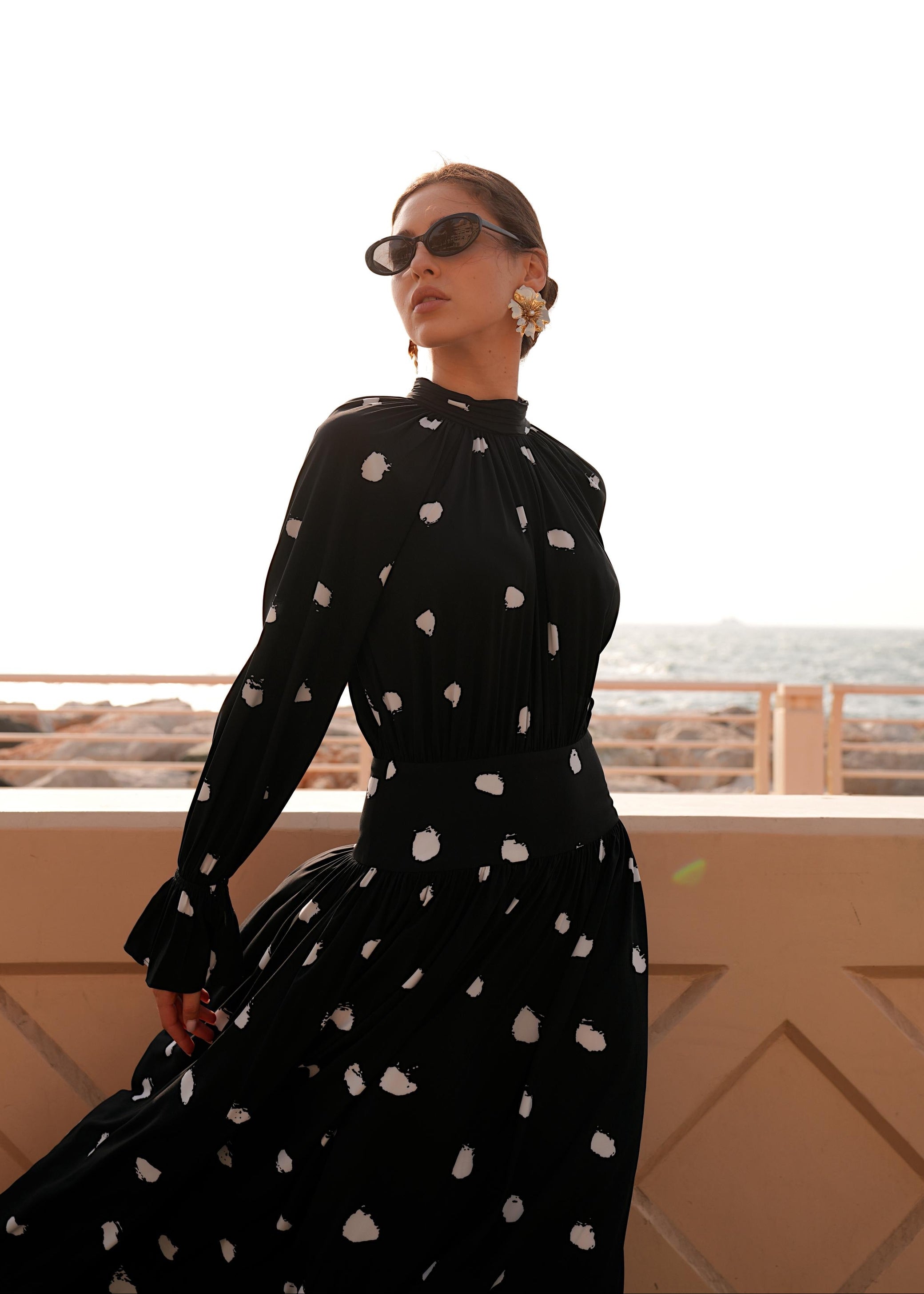 Exquisitely fashioned from lightweight crepe silk, the Juliet dress offers a playful yet refined aesthetic with its striking monochromatic pattern.