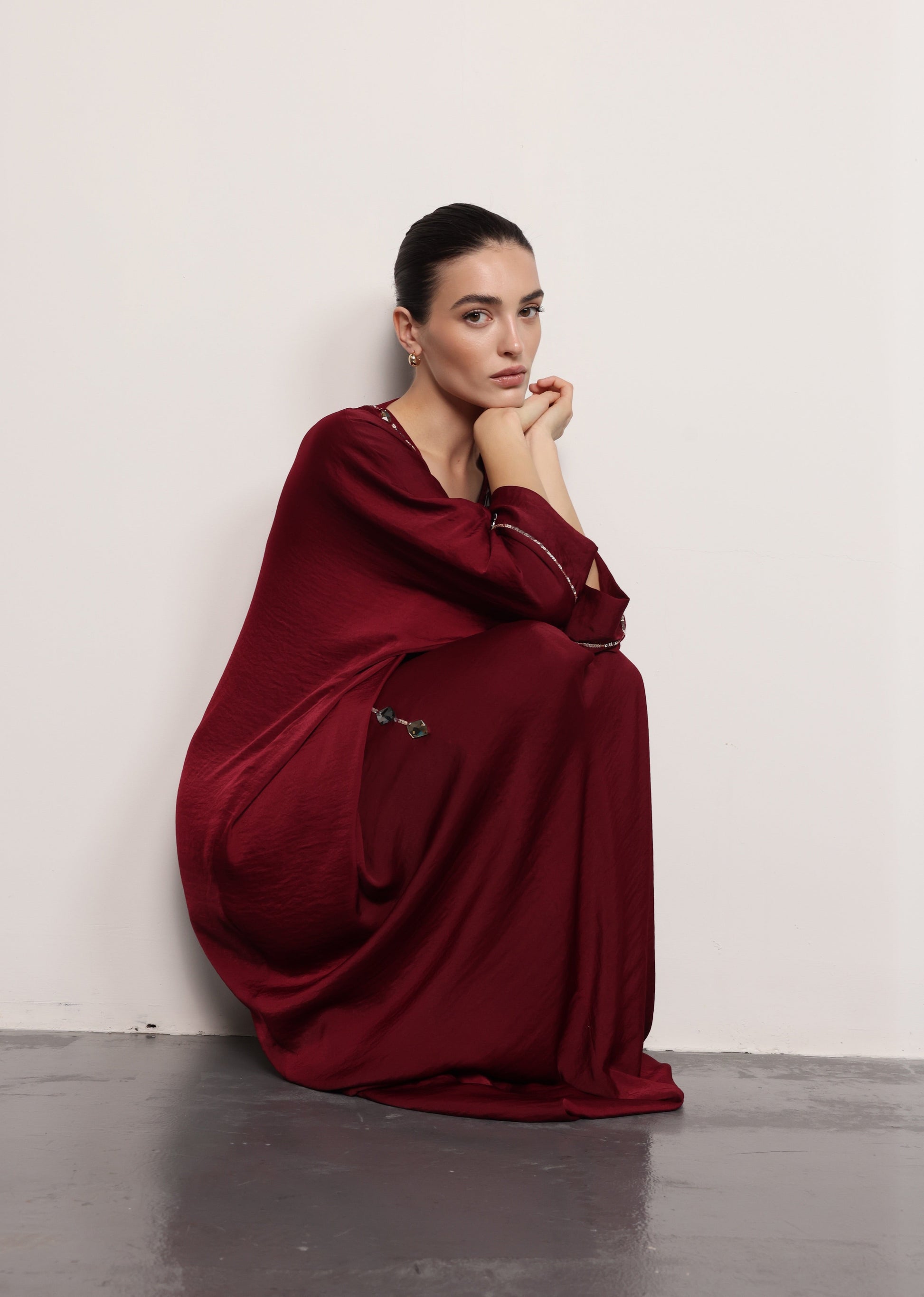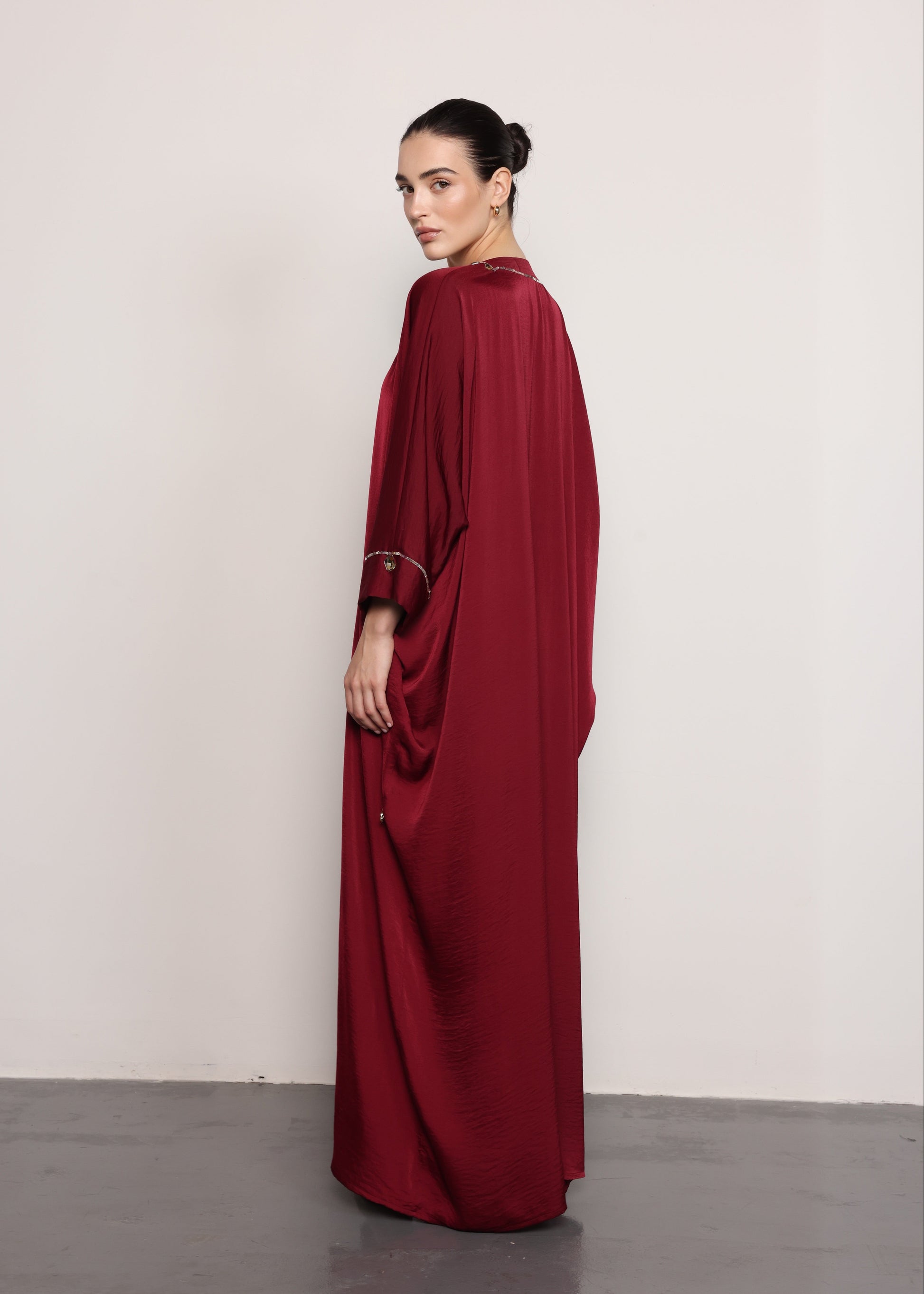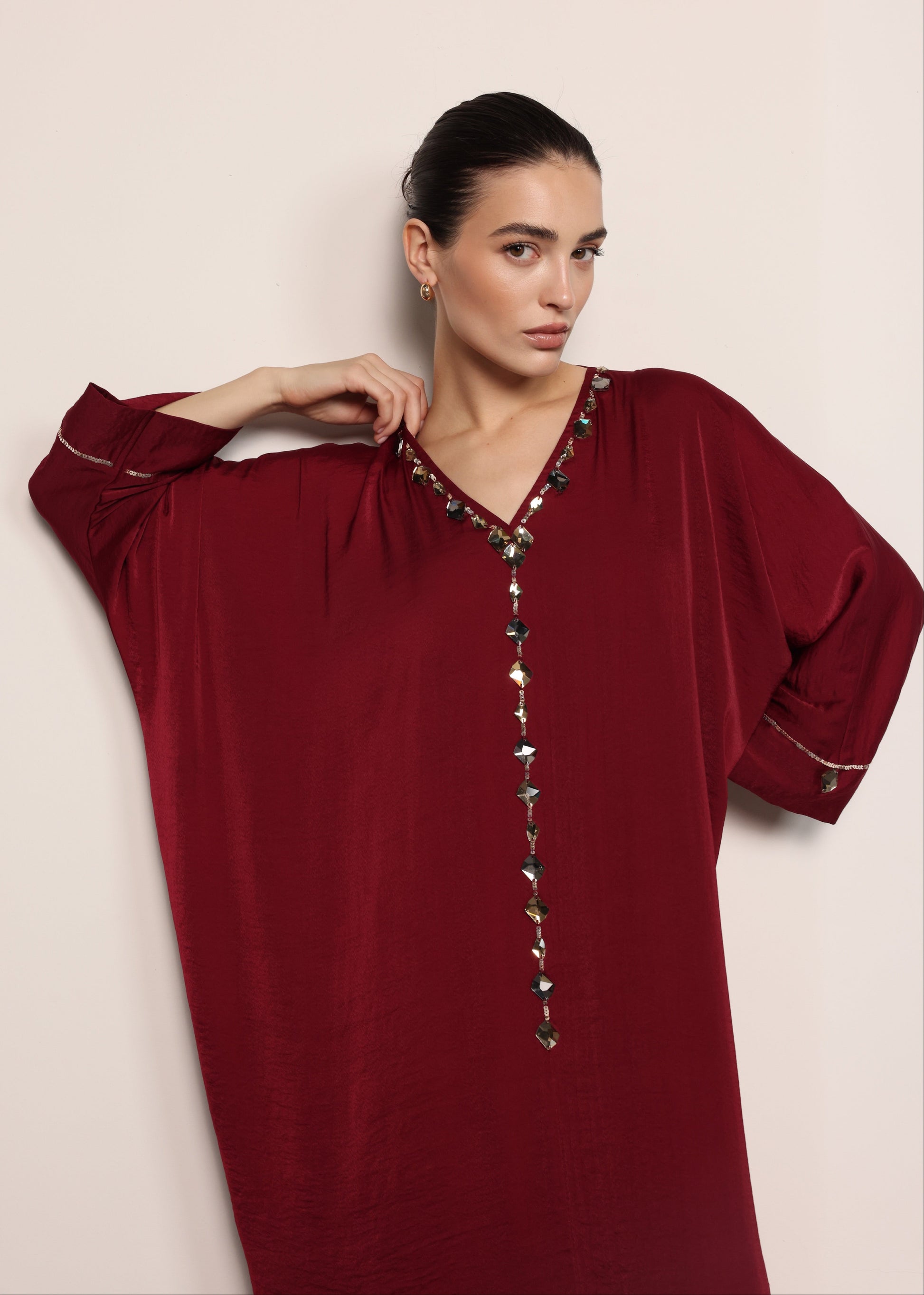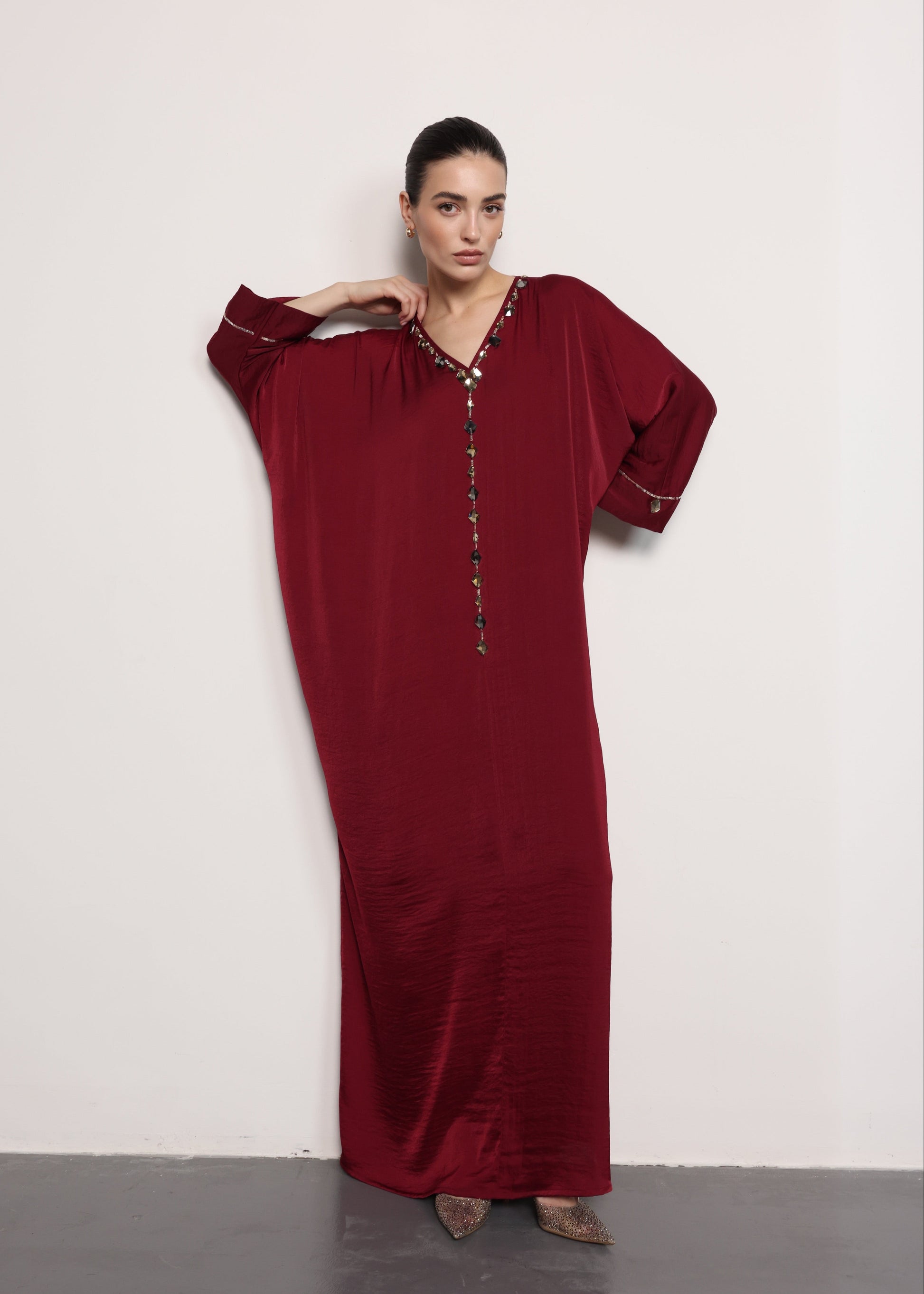 - Design Highlights: Jewel-encrusted V-neckline, long flowing silhouette, wide sleeves