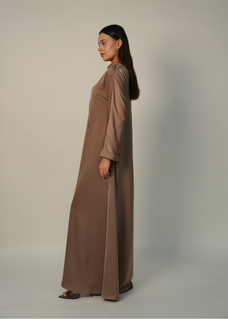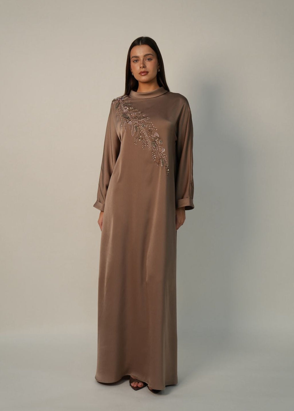 Style Tip: Pair the Yves Dress with champagne-toned silk accessories and minimalist diamond studs to allow the intricate hand-beaded detailing to remain the focal point