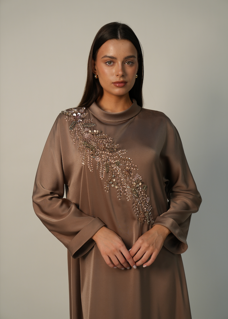 - Design Highlights: It features a striking diagonal floral embroidery of silver-toned beads and sequins that cascades from the shoulder, paired with a modern high-neck collar and relaxed sleeves for a sophisticated, feminine touch.
