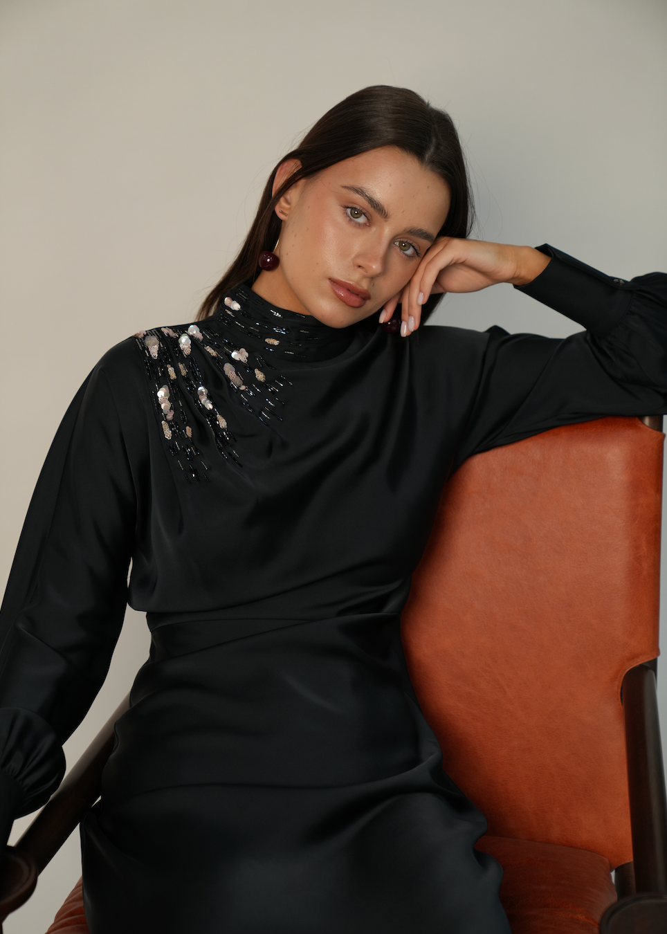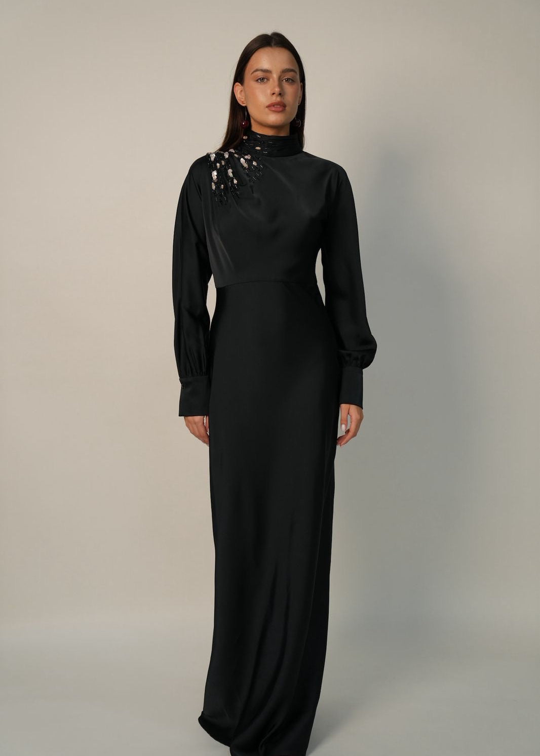 Masterfully draped in a dense twill silk with a lustrous midnight sheen, the Zia dress strikes an impeccable balance of modest coverage and high-fashion edge.