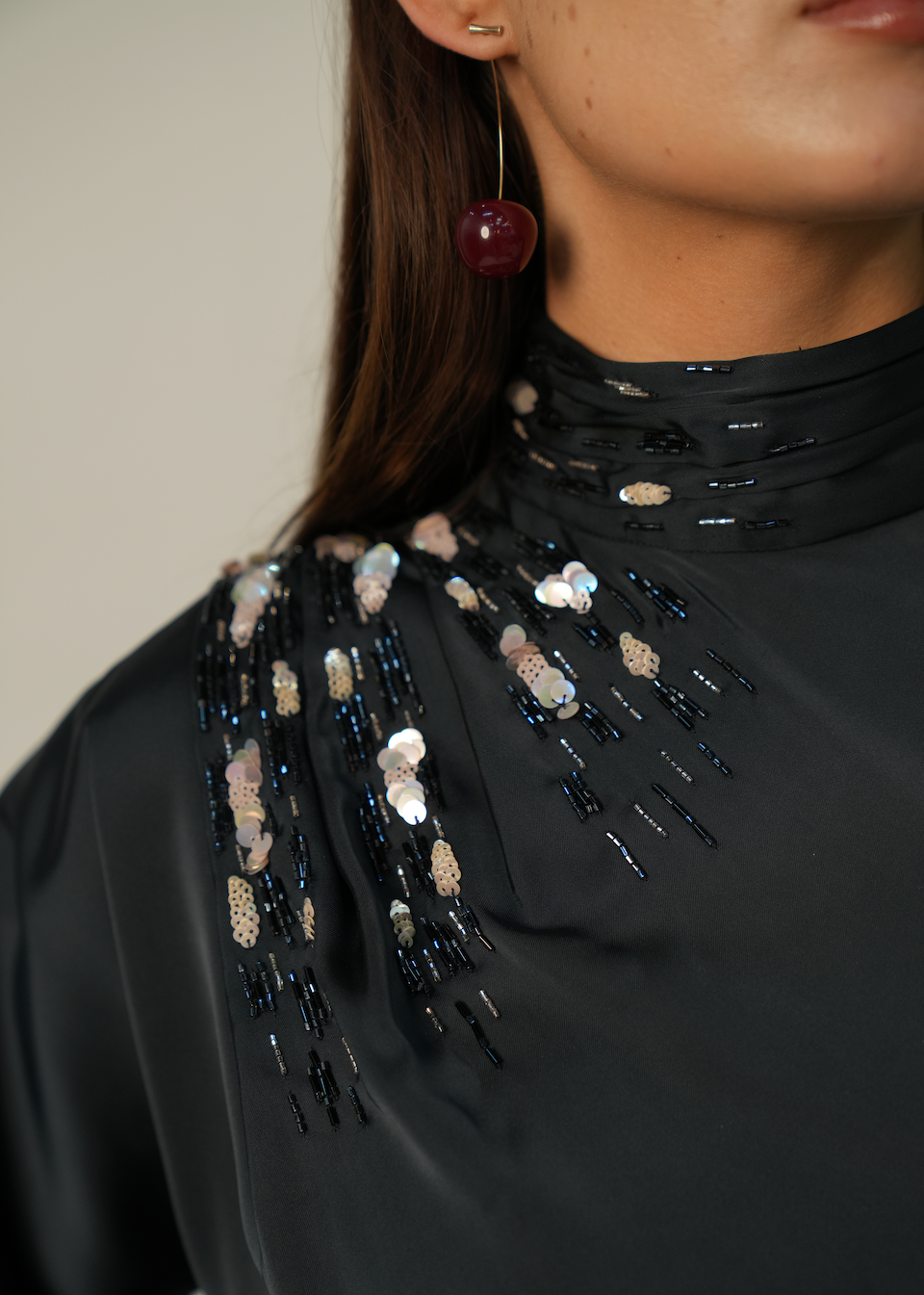 - Design Highlights: It features asymmetric sequin and floral beadwork cascading across one shoulder and a high, structured collar, paired with elegant bishop sleeves and a cinched waist for a sophisticated, feminine touch.