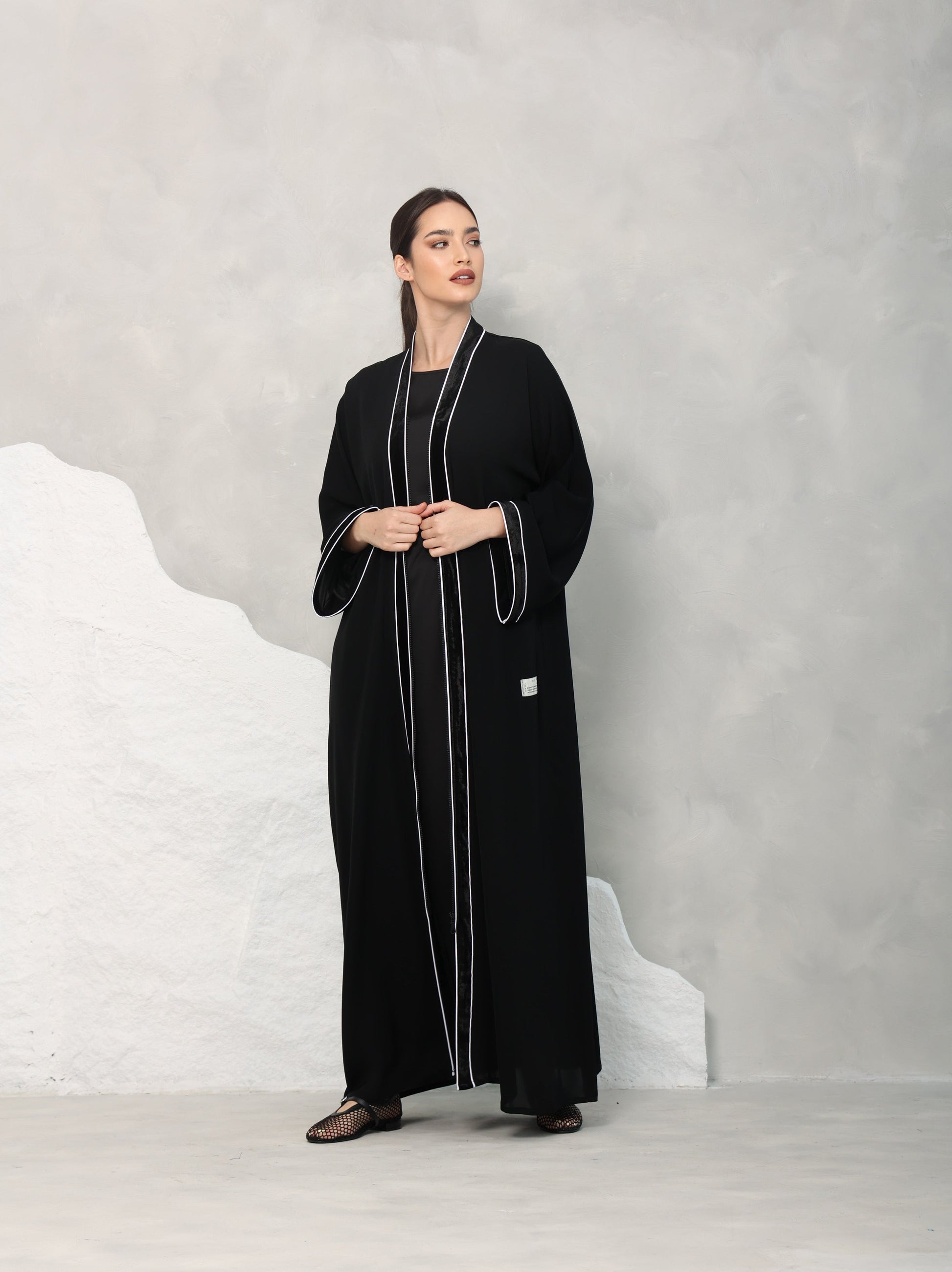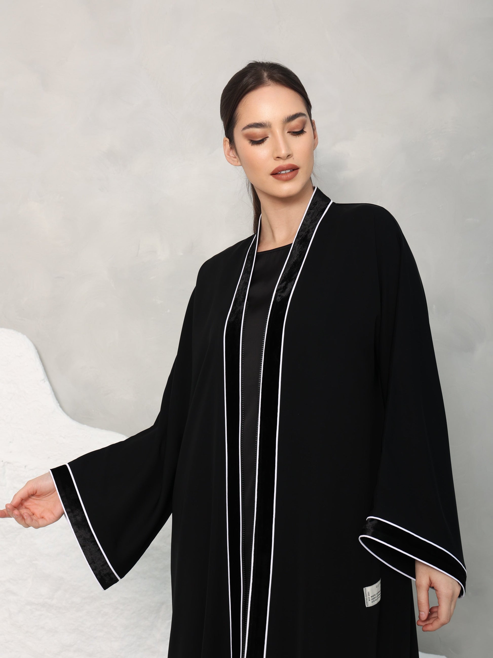 Эта изысканная абая свободного размера отличается минималистичным, но элегантным дизайном, подчеркнутым изящной белой окантовкой вдоль краев воротника и рукавов. Контраст между черной японской тканью и белой отделкой придает традиционному силуэту современный акцент. Абая также включает тонкую деталь из шелкового бархата вдоль воротника и манжет рукавов, обеспечивая роскошное завершение.