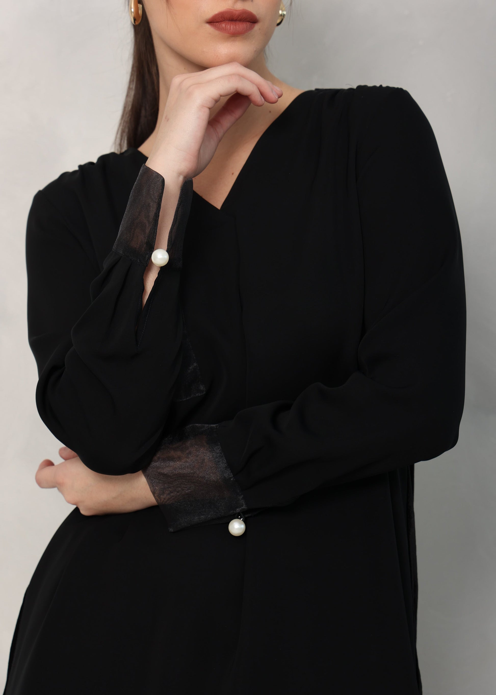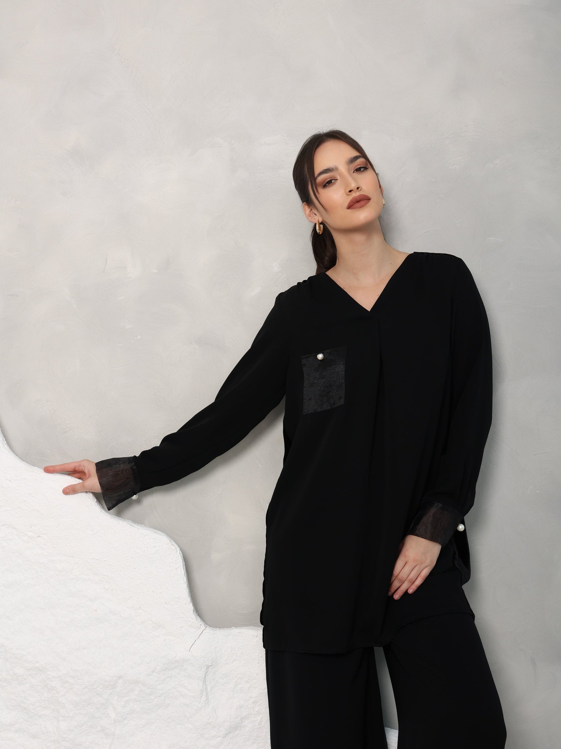 V-образный вырез, передний карман с деталью из прозрачной органзы, жемчужные акценты на манжетах. Спинка блузки выполнена из чистого шелкового бархата.