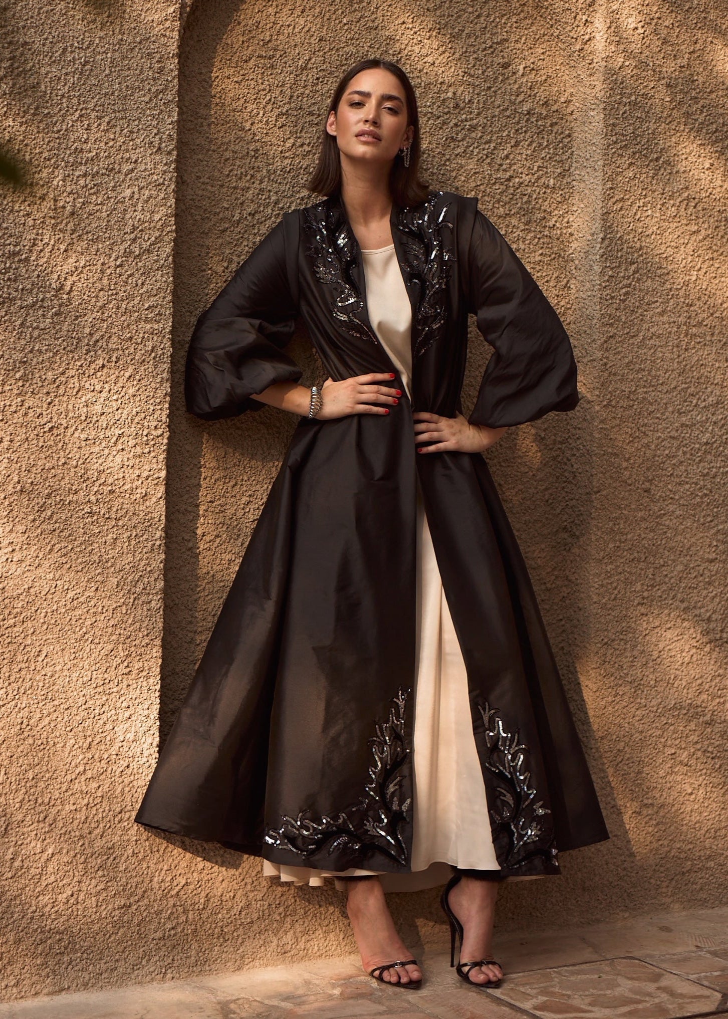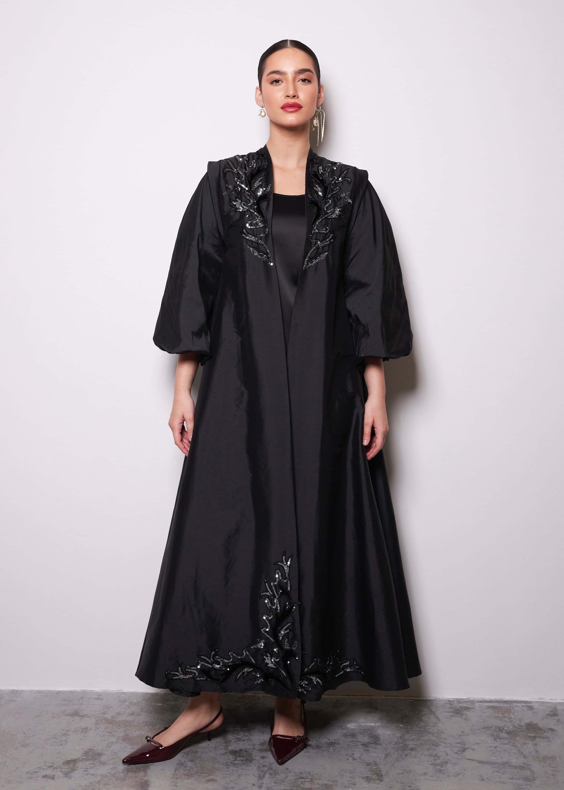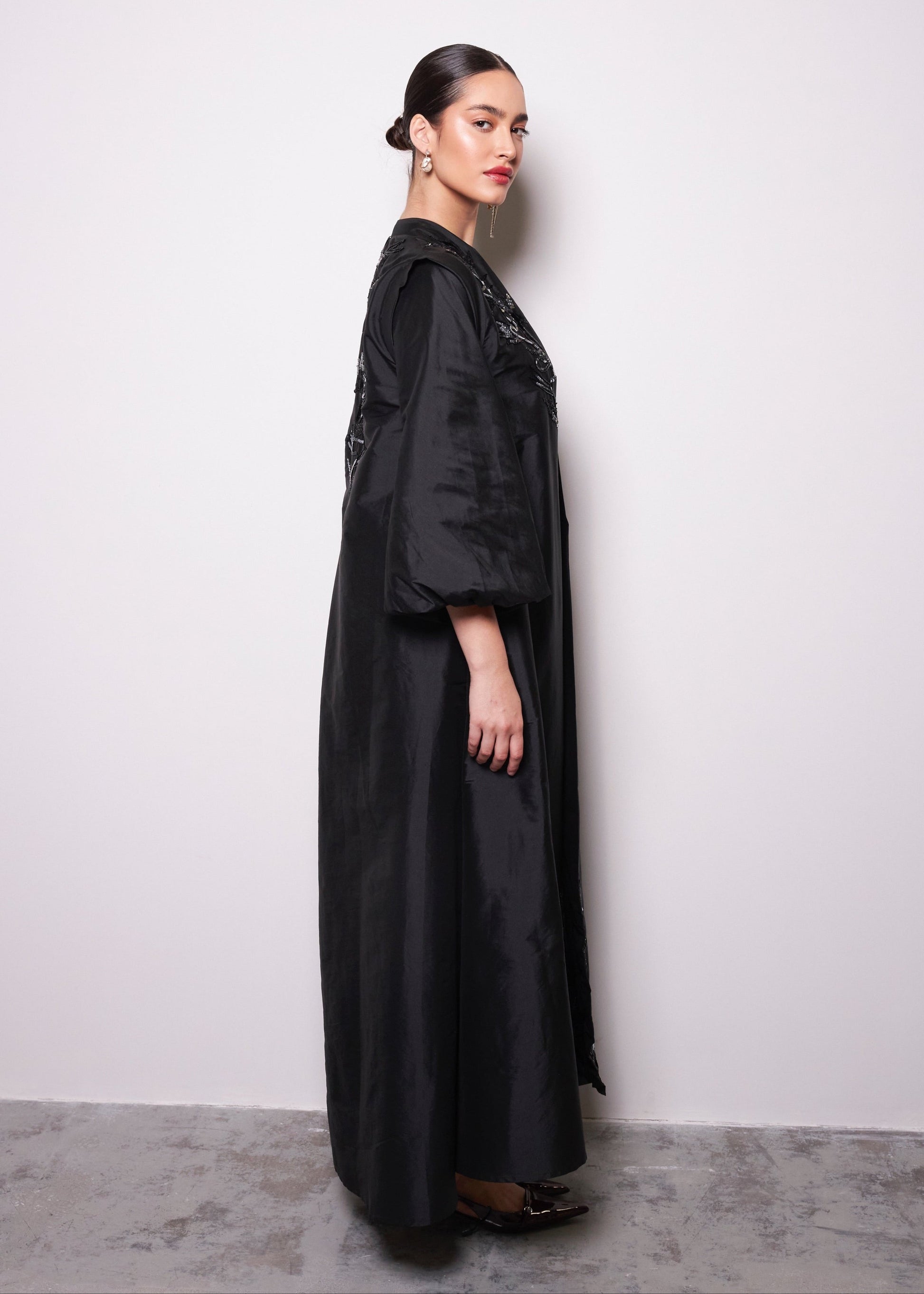 Вневременная элегантность встречается с современной утонченностью в Black Rose Abaya, созданной, чтобы произвести впечатление своим роскошным тафтяным материалом и изысканной вышивкой.