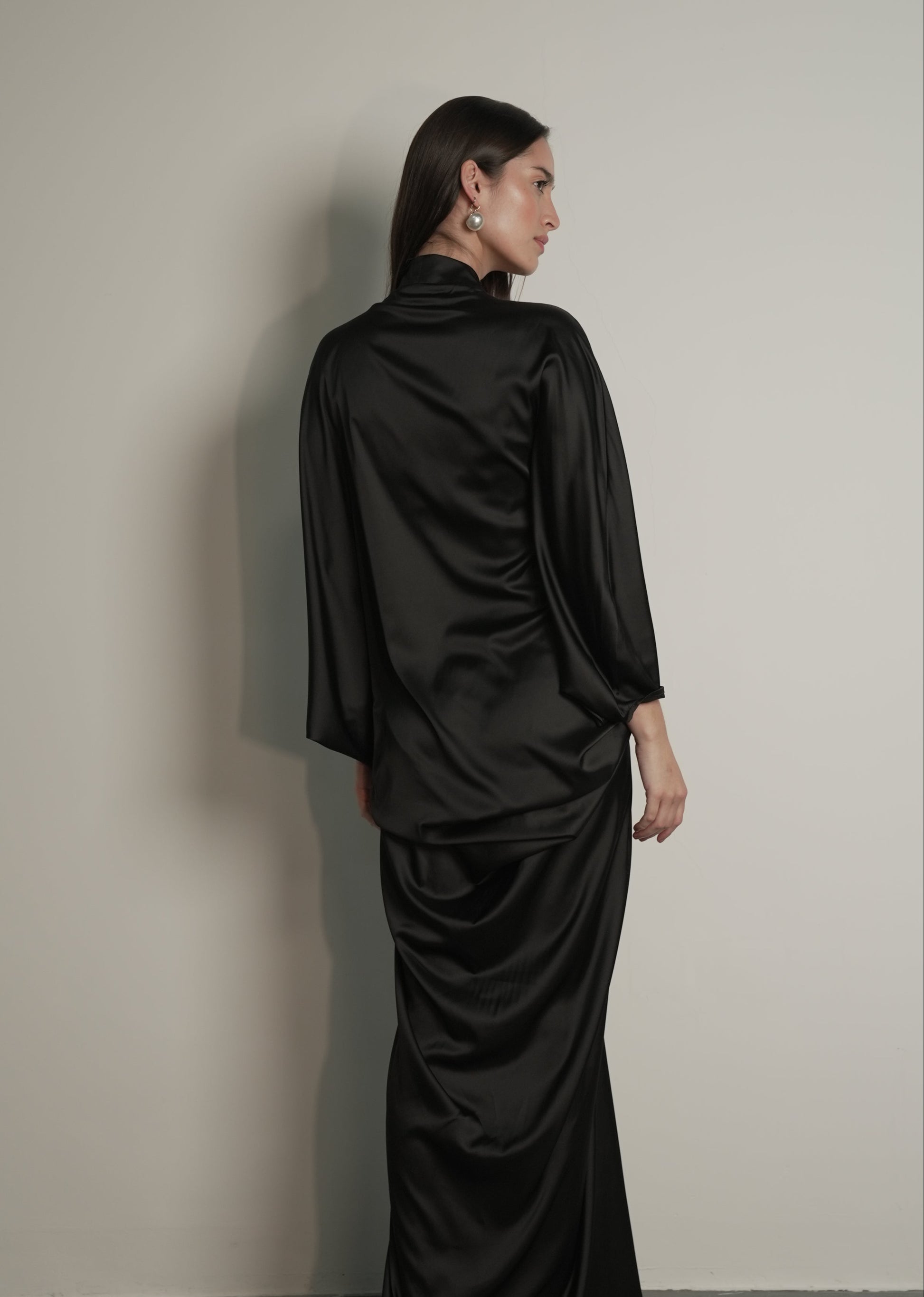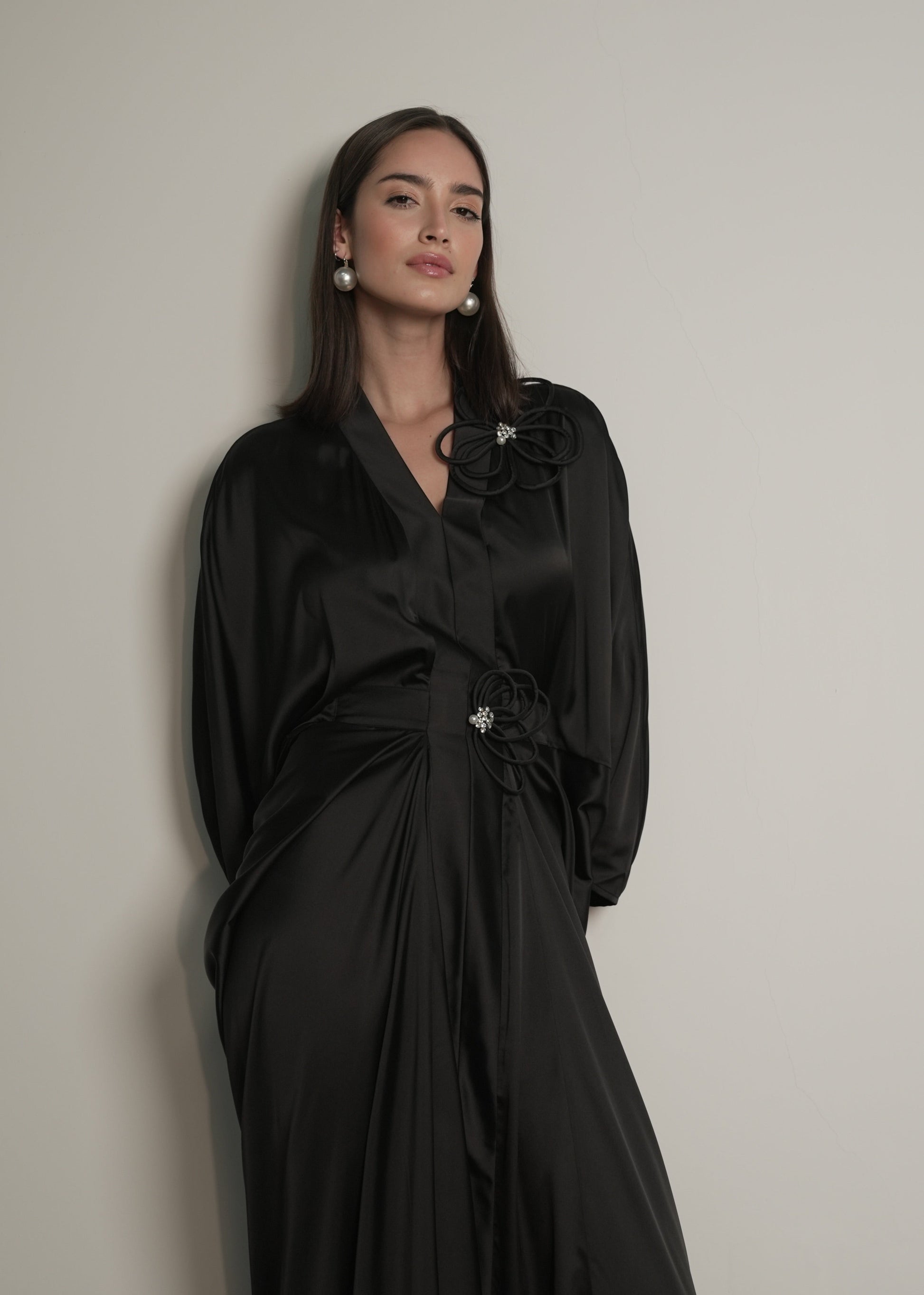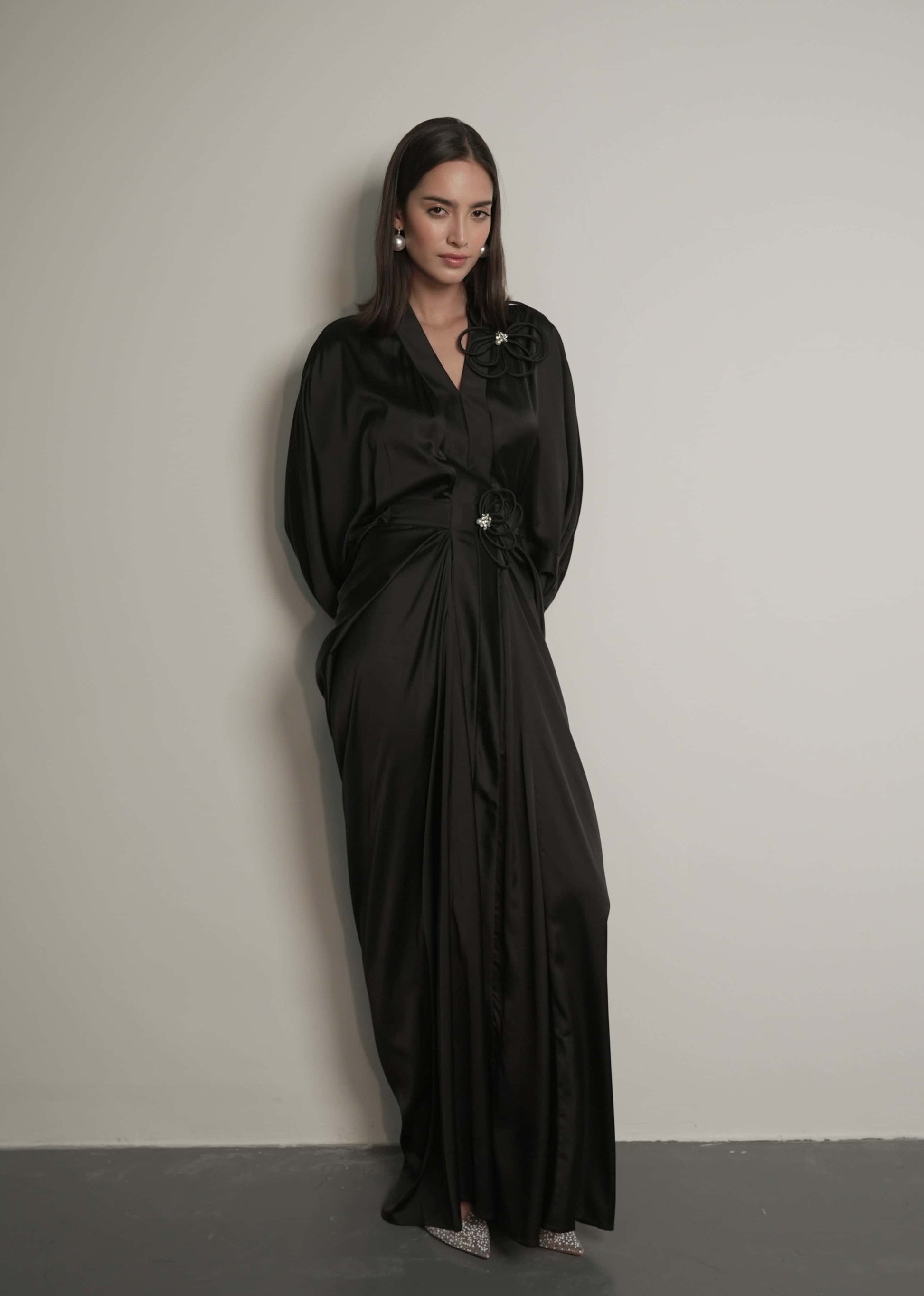 - Основные моменты дизайна: Драпированная силуэт, свободные рукава-крылья и подходящий атласный пояс с цветочными брошь-акцентами