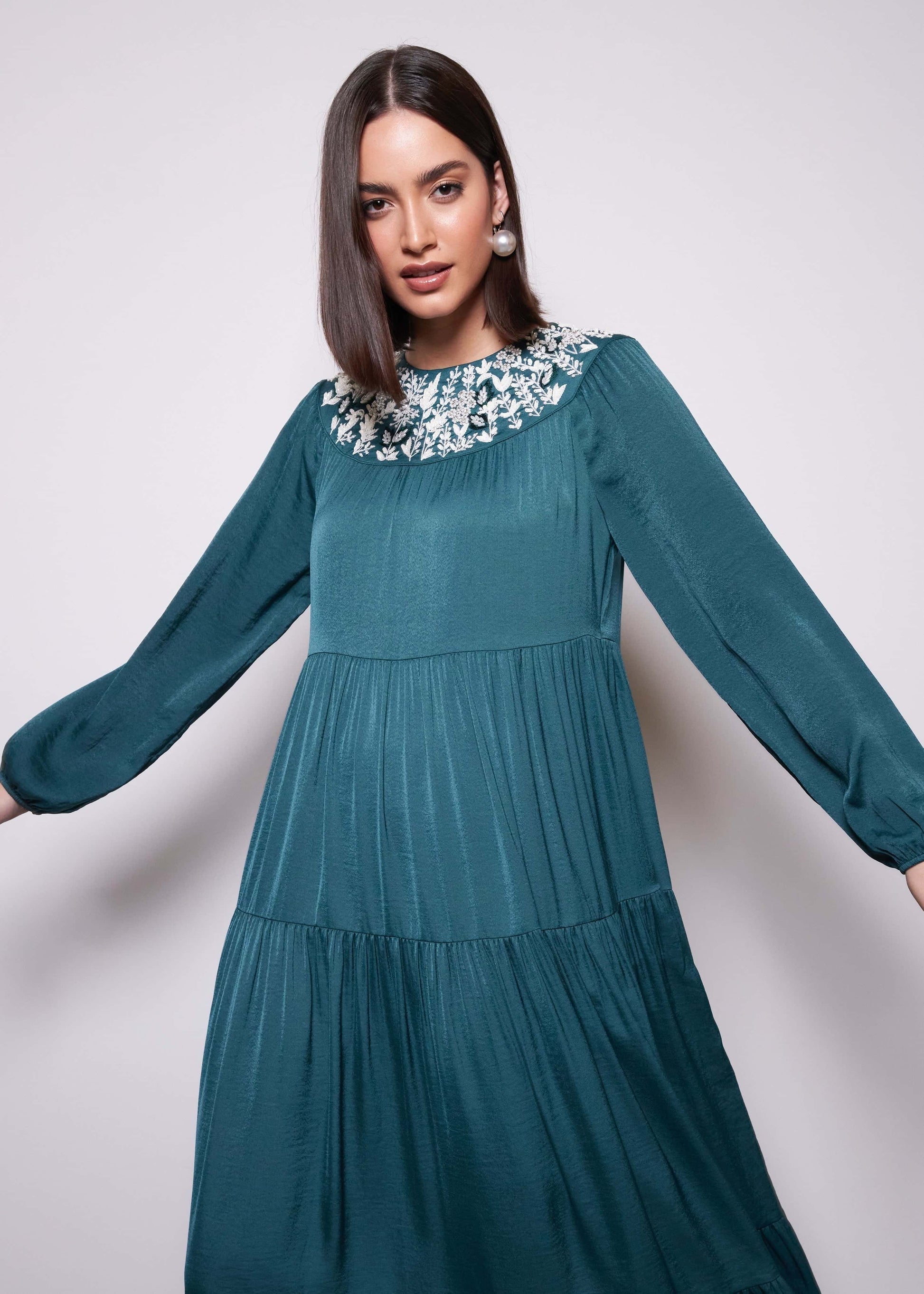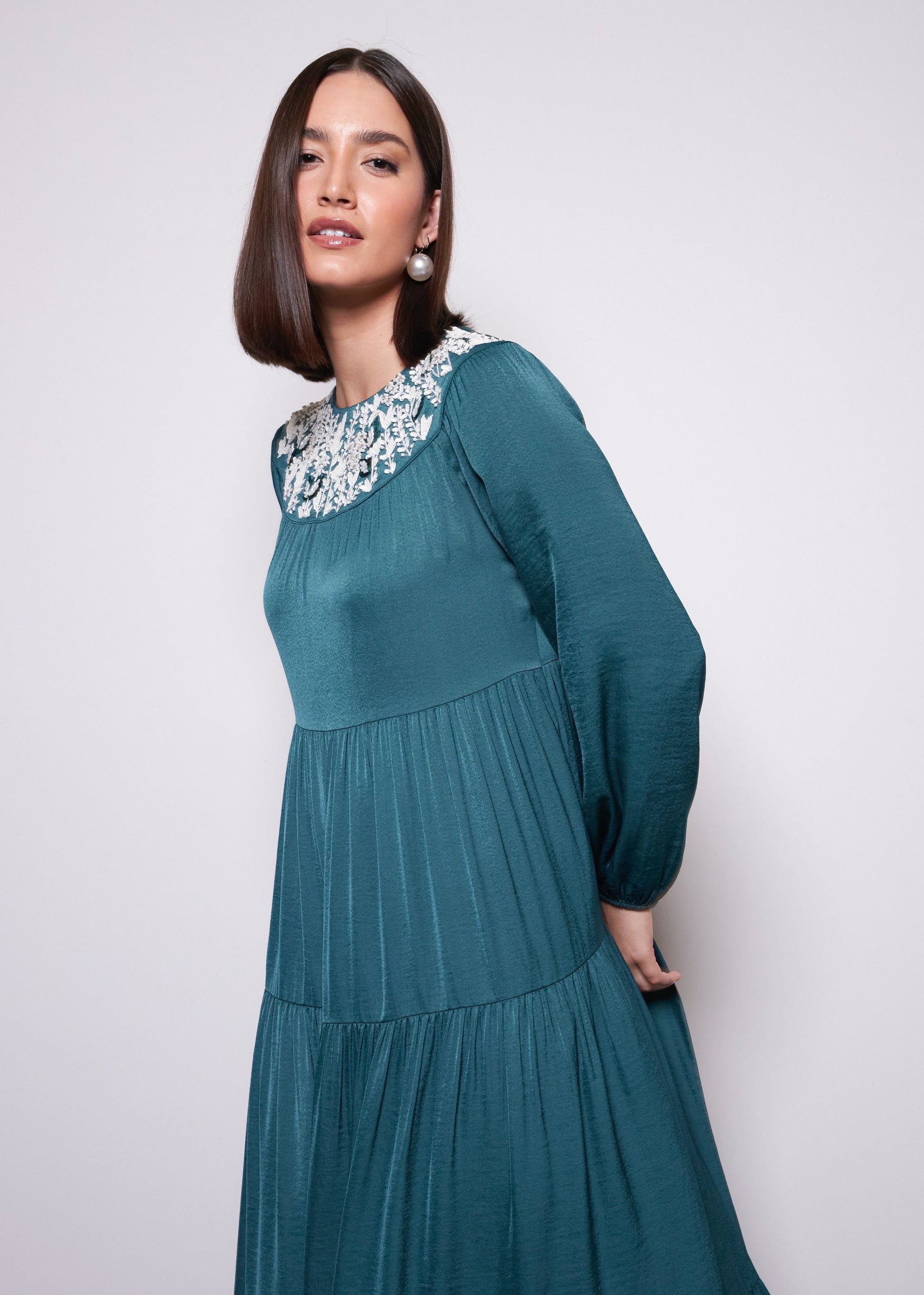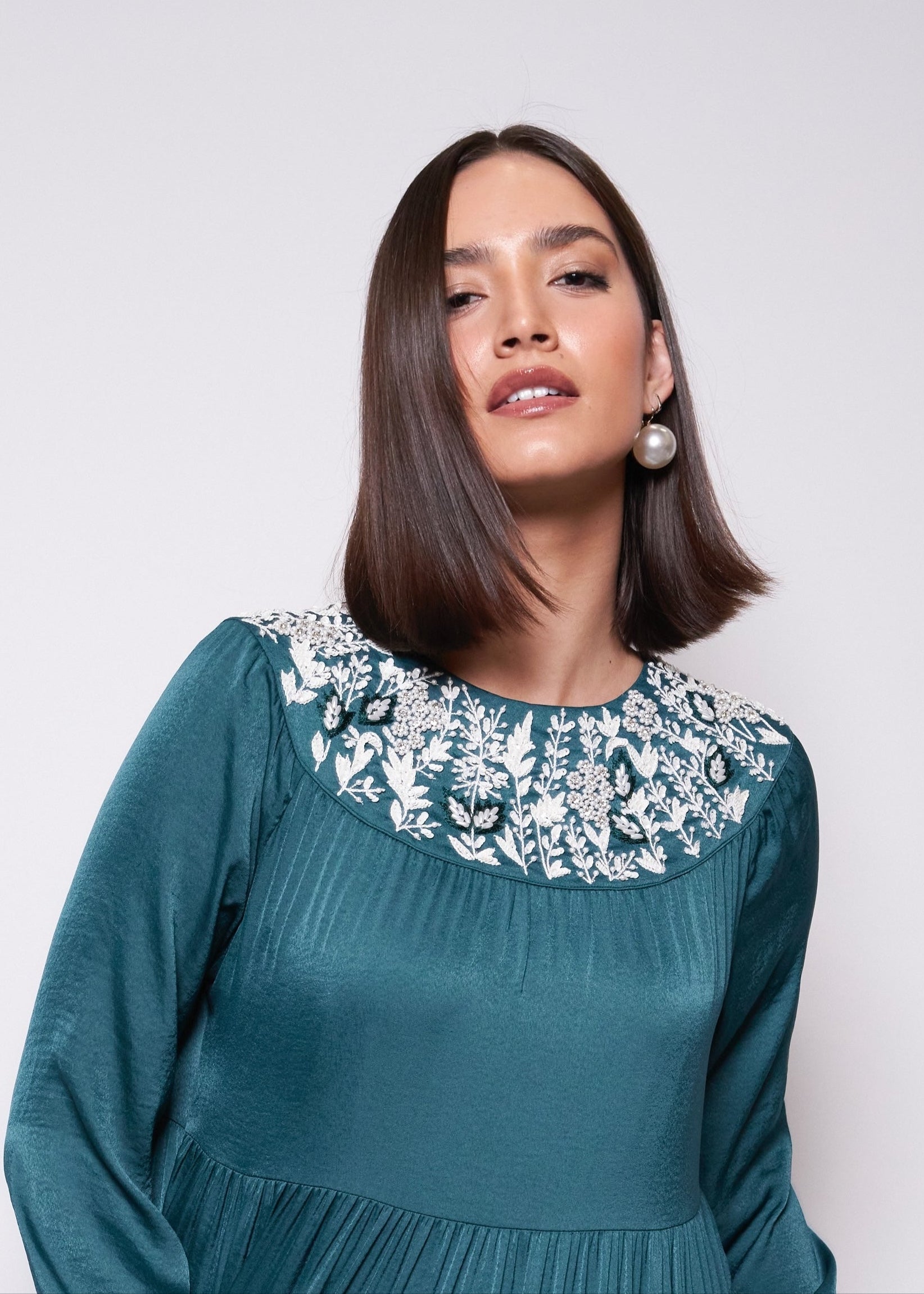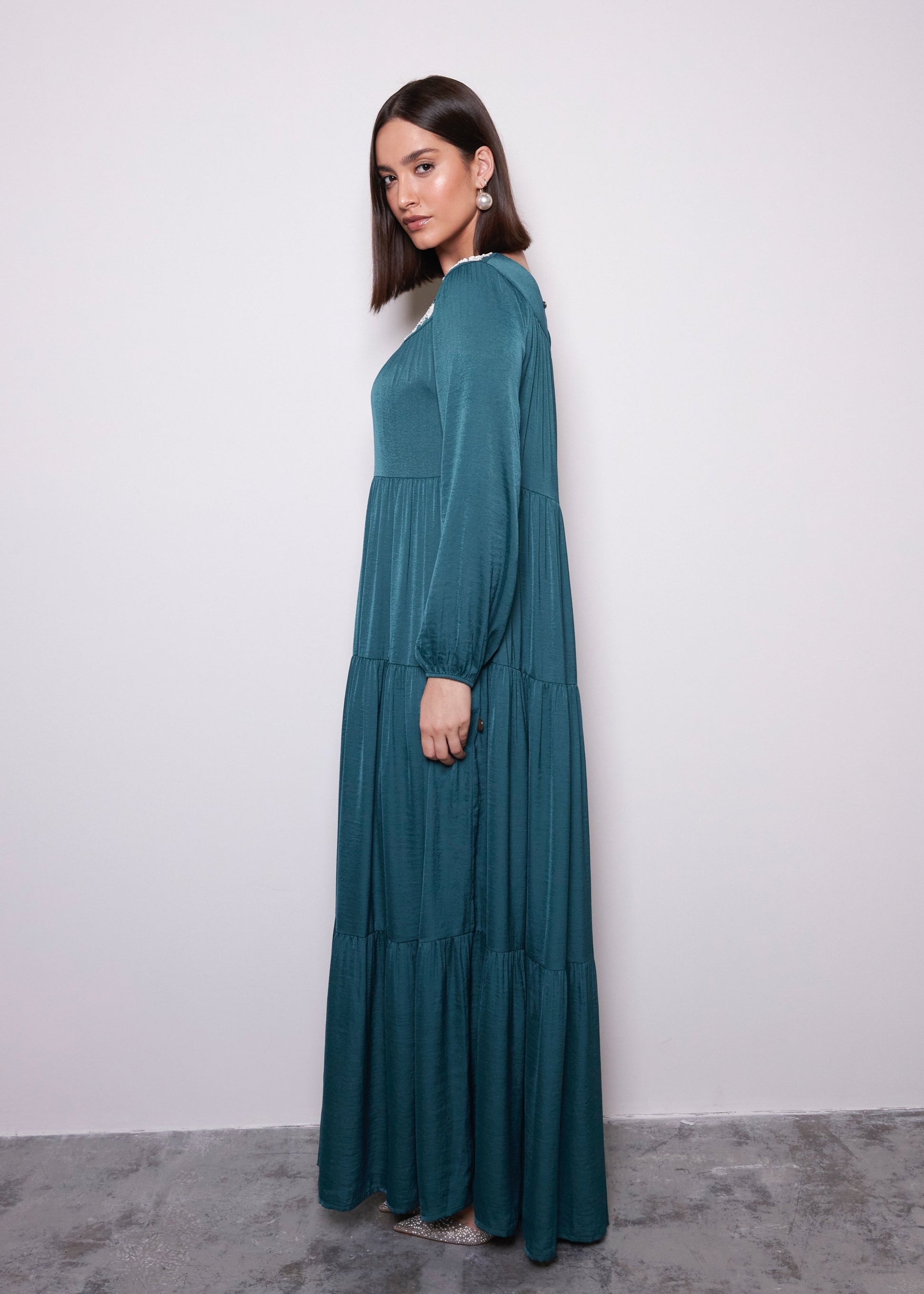 Нежное и сияющее, Платье Жасмин изготовлено из высококачественного шелкового сатина, чтобы поднять ваш гардероб с мягким прикосновением. Платье украшено изысканной вышивкой на воротнике, придающей утонченный и женственный вид. Его струящееся, ярусное оформление обеспечивает flattering силуэт, предлагая как комфорт, так и элегантность. Идеально подходит как для праздничных торжеств, так и для формальных мероприятий.