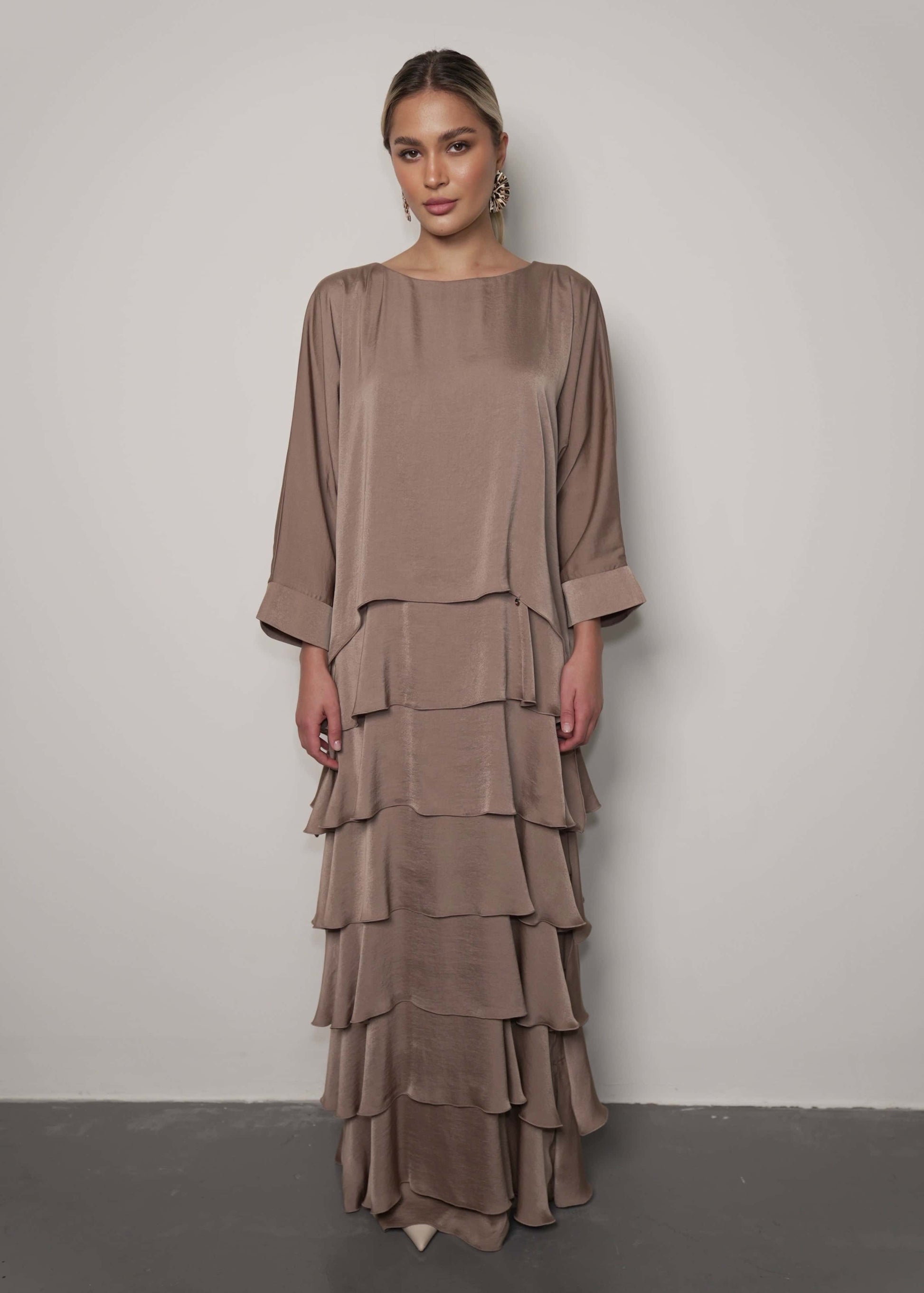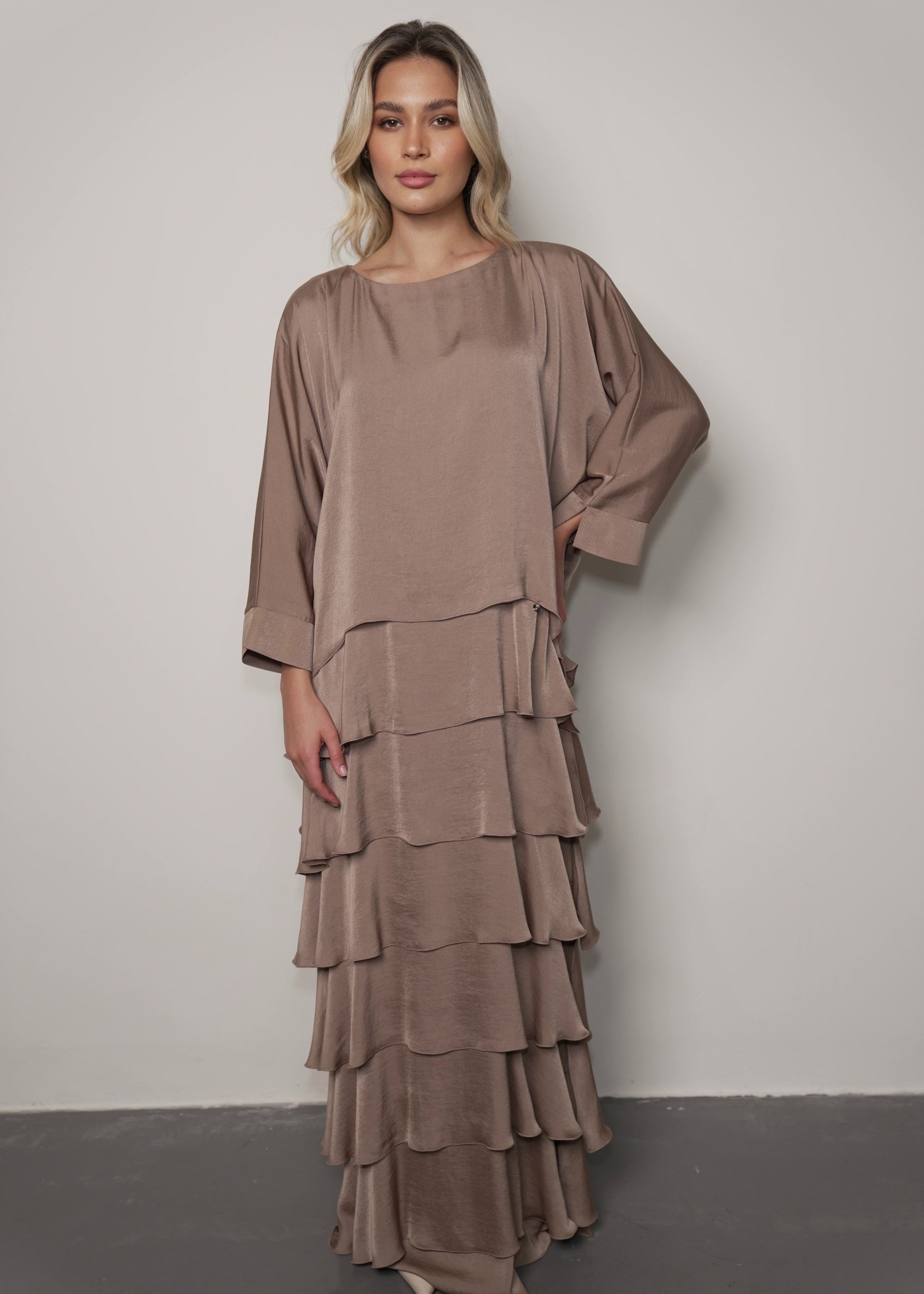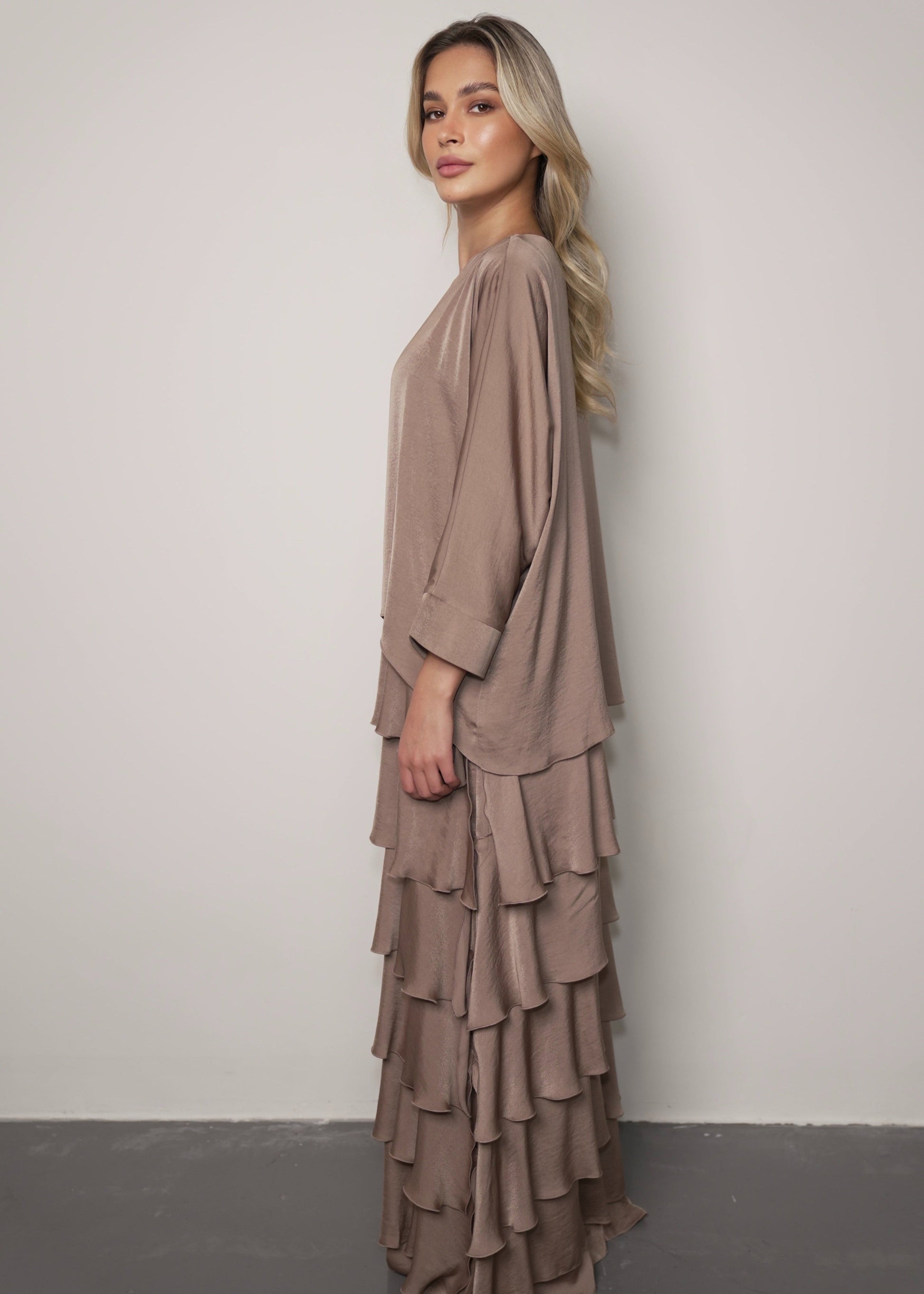 - Основные особенности дизайна: Особенности — многоярусные оборки, которые добавляют движение и глубину силуэту. Разработано с свободным, удобным кроем для непринуждённого шикарного образа.