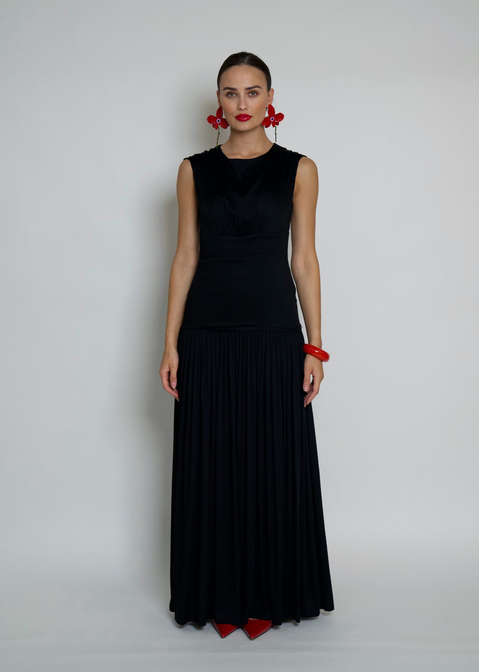 - Design Highlights: Sleeveless bodice with a draped neckline and a cinched waist.